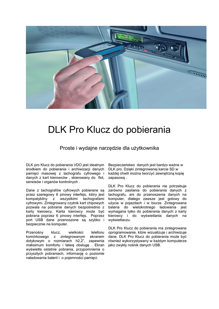 DLK Pro Klucz do pobierania Proste i wydajne narzędzie dla użytkownika DLK pro Klucz do pobierania VDO jest idealnym środkiem do pobierania i archiwizacji danych pamięci masowej z tachografu cyfrowego i danych z kart kierowców , skierowany do flot, serwisów i organów kontrolnych . Dane z tachografów cyfrowych pobierane są przez szeregowy 6 pinowy interfejs, który jest kompatybilny z wszystkimi tachografami cyfrowymi. Zintegrowany czytnik kart chipowych pozwala na pobranie danych bezpośrednio z karty kierowcy. Karta kierowcy może być pobrana poprzez 6 pinowy interfejs. Poprzez port USB dane przenoszone są szybko i bezpiecznie na komputer. Przenośny klucz, wielkości telefonu komórkowego z zintegrowanym ekranem dotykowym o rozmiarach h2,2”, zapewnia maksimum komfortu i łatwą obsługę . Ekran wyświetla ostatnie pobrania, przypomnienia o przyszłych pobraniach, informację o poziomie naładowania baterii i o pojemności pamięci. Bezpieczeństwo danych jest bardzo ważne w DLK pro. Dzięki zintegrowanej karcie SD w każdej chwili można tworzyć zewnętrzną kopię zapasową . DLK Pro Klucz do pobierania nie potrzebuje zarówno zasilania do pobierania danych z tachografu, ani do przenoszenia danych na komputer, dlatego zawsze jest gotowy do użycia w pojazdach i w biurze. Zintegrowana bateria do wielokrotnego ładowania jest wymagana tylko do pobierania danych z karty kierowcy i do wyświetlania danych na wyświetlaczu. DLK Pro Klucz do pobierania ma zintegrowane oprogramowanie, które wizualizuje i archiwizuje dane. DLK Pro Klucz do pobierania może być również wykorzystywany w każdym komputerze jako zwykły nośnik danych USB. DLK Pro Klucz do pobierania Proste i wydajne narzędzie dla użytkownika Zalety: ● przyjazny dla użytkownika: lekki, poręczny, spójny i prosty w obsłudze ●spełnia wymagania prawne dla flot i serwisów , dotyczące pobierania ●spełnia wymagania prawne dla pojazdów we flotach dotyczące archiwizowania ● pobieranie danych z pamięci masowej i karty kierowcy ze wszystkich tachografów cyfrowych (urządzenia 12V i 24 V) ● możliwość pobrania danych z karty kierowcy poprzez zintegrowany czytnik kart chipowych ● poręczny 2,2 calowy ekran dotykowy, do wyświetlania ostatnich pobrań, statusu pobrań, poziomu naładowania baterii i dostępnej pojemności pamięci ● dodatkowa dioda wyświetlająca status pobrania, sygnał dźwiękowy informujący o zakończeniu pobrania ● przypomnienie o wymaganych pobraniach ● zewnętrzne źródło zasilania nie jest wymagane do pobierania danych z tachografów cyfrowych i do weryfikacji na komputerze ● pamięć na około 6000 pobrań (kwartalnie) ● 2 GB pamięci ● szybka wymiana danych z tachografu cyfrowego na PC dzięki wejściu USB ● może być używany jak zwykły nośnik danych USB ● możliwość konfiguracji ekranu pod użytkownika ● dostępne w 29 językach Zawartość opakowania ● Klucz do pobierania DLKPro ● oprogramowanie do skonfigurowania klucza, wizualizacja danych i dane do archiwizacji na kluczu ● kabel USB ● skrócona instrukcja obsługi (wydrukowana),instrukcja dla użytkownika( w kluczu) ● Smycz Wymagania systemowe ●Windows 7,Windows vista lub Windows XP z aktualnymi service pakami ● wolne wejście USB na komputerze Akcesoria ● Licencja do DLKPro ● Pudełko do zasilania dla DLKPro ● Neoprenowy futerał