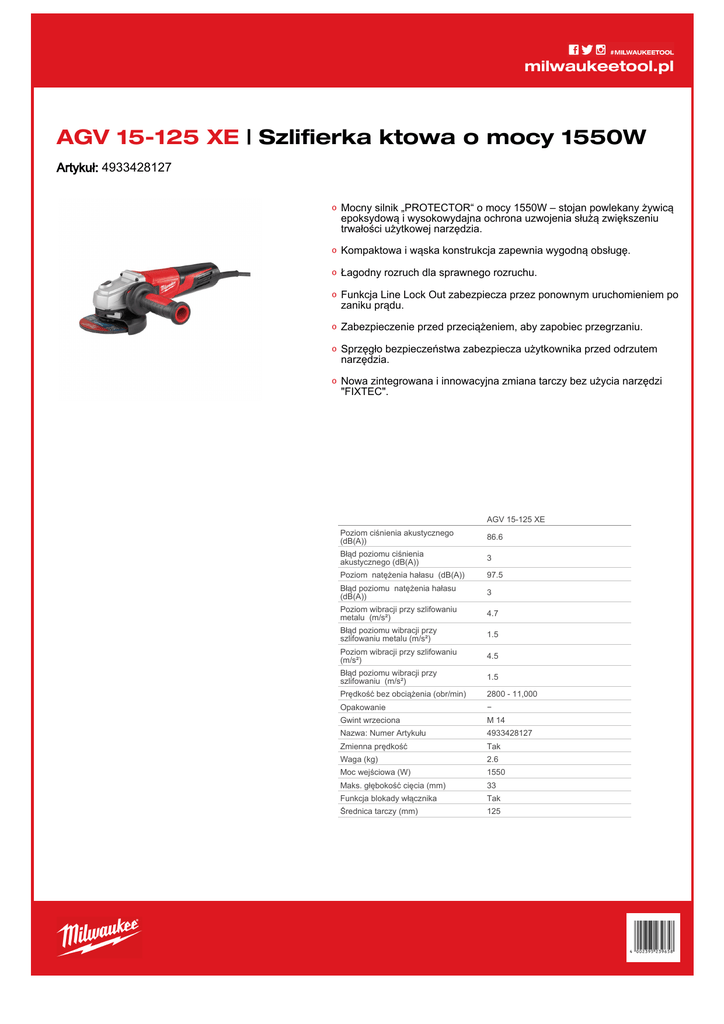 milwaukeetool.pl AGV 15-125 XE | Szlifierka ktowa o mocy 1550W Artykuł: 4933428127 Mocny silnik „PROTECTOR“ o mocy 1550W – stojan powlekany żywicą epoksydową i wysokowydajna ochrona uzwojenia służą zwiększeniu trwałości użytkowej narzędzia. Kompaktowa i wąska konstrukcja zapewnia wygodną obsługę. Łagodny rozruch dla sprawnego rozruchu. Funkcja Line Lock Out zabezpiecza przez ponownym uruchomieniem po zaniku prądu. Zabezpieczenie przed przeciążeniem, aby zapobiec przegrzaniu. Sprzęgło bezpieczeństwa zabezpiecza użytkownika przed odrzutem narzędzia. Nowa zintegrowana i innowacyjna zmiana tarczy bez użycia narzędzi "FIXTEC". AGV 15-125 XE Poziom ciśnienia akustycznego (dB(A)) 86.6 Błąd poziomu ciśnienia akustycznego (dB(A)) 3 Poziom natężenia hałasu (dB(A)) 97.5 Błąd poziomu natężenia hałasu (dB(A)) 3 Poziom wibracji przy szlifowaniu metalu (m/s²) 4.7 Błąd poziomu wibracji przy szlifowaniu metalu (m/s²) 1.5 Poziom wibracji przy szlifowaniu (m/s²) 4.5 Błąd poziomu wibracji przy szlifowaniu (m/s²) 1.5 Prędkość bez obciążenia (obr/min) 2800 - 11,000 Opakowanie − Gwint wrzeciona M 14 Nazwa: Numer Artykułu 4933428127 Zmienna prędkość Tak Waga (kg) 2.6 Moc wejściowa (W) 1550 Maks. głębokość cięcia (mm) 33 Funkcja blokady włącznika Tak Średnica tarczy (mm) 125
