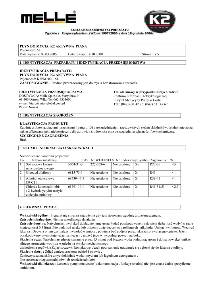 PŁYN DO MYCIA K2 AKTYWNA PIANA Pojemność: 5L Data wydania: 03.03.2005. Data rewizji: 14.10.2008 Strona 1 z 5 1. IDENTYFIKACJA PREPARATU I IDENTYFIKACJA PRZEDSIĘBIORSTWA IDENTYFIKACJA PREPARATU: PŁYN DO MYCIA K2 AKTYWNA PIANA Pojemność: K2PM100 – 5L ZASTOSOWANIE : Produkt przeznaczony jest do mycia bez stosowania szczotek. IDENTYFIKACJA PRZEDSIĘBIORSTWA DOSTAWCA: Melle Sp. z.o.o. Stary Staw 9 63-400 Ostrów Wlkp Tel:062-7351600 e-mail: [email protected] Paweł Nowak Tel. alarmowy w przypadku ostrych zatruć Centrum Informacji Toksykologicznej Instytut Medycyny Pracy w Łodzi Tel.: (042) 631 47 25; (042) 631 47 67 2. IDENTYFIKACJA ZAGROśEŃ KLASYFIKACJA PRODUKTU Zgodnie z obowiązującymi przepisami ( patrz p.15) z uwzględnieniem rzeczywistych stęŜeń składników, produkt nie został zaklasyfikowany jako niebezpieczny dla zdrowia i środowiska oraz ze względu na własności fizykochemiczne. SZCZEGÓLNE ZAGROśENIA Brak. 3. SKŁAD I INFORMACJA O SKŁADNIKACH Niebezpieczne składniki preparatu: Lp. Nazwa substancji CAS Nr WE/EINECS Nr. Indeksowy Symbol ZagroŜenia 1. Sól sodowa kwasu 5064-31-3 225-768-6 Nie ustalone Xn R22-36 nitrylotrójoctowego 2. Gikozyd alkilowy 6815-73-1 Nie ustalone Nie ustalone Xi R41 3. 4. Alkohol etoksylowy C9-C11 Chlorek kokosoalkilobis ( 2-hydroksyetylo) metylo etoksylo aminowy % <5 <1 68439-46-3 Nie ustalone Nie ustalone Xi R38-41 <1 61791-10-4 Nie ustalone Nie ustalone Xi R41-51/53 <2,5 4. PIERWSZA POMOC Wskazówki ogólne : Preparat nie stwarza zagroŜenia gdy jest stosowany zgodnie z przeznaczeniem. Zatrucie inhalacyjne: Nie ma szkodliwego działania.. Zatrucie doustne: Natychmiast wypłukać dokładnie jamę ustną Podać poszkodowanemu do picia duŜą ilość wody( w razie konieczności 0,5 litra) .Nie podawać mleka lub tłuszczy zwierzęcych czy roślinnych , alkoholu .Unikać wymiotów. Wezwać lekarza . Decyzja o tym czy naleŜy wywołać wymioty , powinna być podjęta przez lekarza sprawującego opiekę. JeŜeli poszkodowany wymiotuje leŜąc na plecach , ułoŜyć jego w wygodnej pozycji na boku. SkaŜenie oczu: Natychmiast płukać starannie przez 15 minut pod bieŜąca wodą podnosząc górną i dolną powiekę( unikać silnego strumienia wody ze względu na ryzyko mechanicznego uszkodzenia rogówki).Zdjąć soczewki kontaktowe. JeŜeli podraŜnienie utrzymuje się zgłosić się do lekarza okulisty. SkaŜenie skóry : Zdjąć zanieczyszczoną odzieŜ i obuwie . Zanieczyszczona skórę zmyć dokładnie woda i mydłem lub łagodnym detergentem . Nie stosować rozpuszczalników lub rozcieńczalników. Wskazówki dla lekarza: Leczenie symptomatyczne( dekontaminacja , funkcje witalne) nie jest znane Ŝadne specyficzne antidotum. PŁYN DO MYCIA K2 AKTYWNA PIANA Pojemność: 5L strona 2 z 6 5. POSTĘPOWANIE W PRZYPADKU POśARU Odpowiednie środki gaśnicze: Woda metodą natryskową , suche środki gaśnicze, piana odporna na działanie alkoholu, dwutlenek węgla .Chłodzić preparaty znajdujące się w okolicy poŜaru prysznicem wodnym lub usunąć je z obszaru zagroŜonego. Środki gaśnicze , których nie wolno uŜywać ze względów bezpieczeństwa: Preparat niepalny JeŜeli się pali w otoczeniu innych preparatów moŜe podtrzymywać palenie. Środki ochrony indywidualnej dla straŜaków: UŜywać zabezpieczeń dla górnych dróg oddechowych , sprzęt ochronny dróg oddechowych –taki jak na wyposaŜeniu straŜaków oraz ubranie ochronne. ZagroŜenia związane ze spalaniem:. Nie oddychać dymem. Inne: W przypadku poŜaru nie przebywać w strefie zagroŜenia bez ubrania ognioodpornego i aparatu tlenowego. 6. POSTĘPOWANIE W PRZYPADKU NIEZAMIERZONEGO UWOLNIENIA DO ŚRODOWISKA Środki ochrony indywidualnej: Przy duŜych uwolnieniach stosować ochronę oczu i rąk.. Ochrona środowiska naturalnego. Metody oczyszczania – małe rozlewy. Absorbować lub ograniczać ciecz piaskiem, ziemią, pakułami lub materiałem ograniczającym wyciek. Zebrać np.: łopatką i umieścić w oznakowanym , uszczelnionym pojemniku w celu odzyskania lub bezpiecznego usunięcia. Przeciekające kontenery umieścić w oznakowanych pojemnikach. Zmyć miejsca skaŜone np. isopropanolem a następnie wodą. Metody oczyszczania –duŜe rozlewy. Przenieść do oznakowanych , uszczelnionych pojemników w celu odzyskania lub bezpiecznego usunięcia. Pozostałość traktować jako mały rozlew. Inne informację: Nie dopuścić do przedostania się duŜych ilości preparatu do ujęć wodnych i kanalizacji.. DuŜa ilość jednorazowa to 2000 litrów. 7. POSTĘPOWANIE Z PREPARATEM I ICH MAGAZYNOWANIE Wskazówki odnośnie bezpiecznego obchodzenia się z produktem: Brak szczególnych zaleceń. zabezpieczenie przed poŜarem i wybuchem: Brak szczególnych zaleceń. Magazynowanie: -Wymogi odnośnie pomieszczeń magazynowych i warunków przechowywania: Brak szczególnych zaleceń. Inne uwagi odnośnie warunków przechowywania: Magazynować w suchym , krytym miejscu. Chronić przed bezpośrednim oddziaływaniem ciepła i promieniowania słonecznego . Chronić przed mrozem. Rodzaj opakowań: Kanister z tworzywa sztucznego o pojemności 5litrów. 8. KONTROLA NARAśENIA I ŚRODKI OCHRONY INDYWIDUALNEJ Kontrola naraŜenia :Wartości dopuszczalnych stęŜeń Brak danych. Dodatkowe wskazówki odnośnie projektowania instalacji technicznych: nie ma patrz pkt 7 Ochrona osobista: Rękawice ochronne z kauczuku butylowego lub nitrylowego. Skóry i ciała :niekonieczna; Ochrona dróg oddechowych: Nie jest wymagana ochrona w przypadku dobrze wentylowanych pomieszczeń i stosowania preparatu w normalnej temperaturze. Zalecenia higieniczne: Myć ręce przed kaŜdą przerwą i po zakończeniu pracy oraz przed spoŜywaniem posiłków i korzystaniem z toalety. Zanieczyszczoną skórę umyć natychmiast wodą z mydłem . Trzymać z dala od Ŝywności , napojów i pasz .OdzieŜ zanieczyszczoną produktem natychmiast zdjąć. W trakcie stosowania nie jeść , nie pić i nie palić tytoniu. Pracodaw