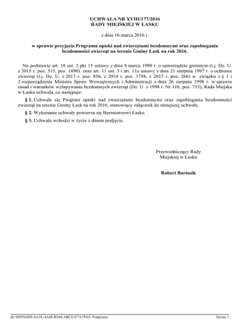 UCHWAŁA NR XVIII/177/2016 RADY MIEJSKIEJ W ŁASKU z dnia 16 marca 2016 r. w sprawie przyjęcia Programu opieki nad zwierzętami bezdomnymi oraz zapobiegania bezdomności zwierząt na terenie Gminy Łask na rok 2016. Na podstawie art. 18 ust. 2 pkt 15 ustawy z dnia 8 marca 1990 r. o samorządzie gminnym (t.j. Dz. U. z 2015 r. poz. 515, poz. 1890) oraz art. 11 ust. 3 i art. 11a ustawy z dnia 21 sierpnia 1997 r. o ochronie zwierząt (t.j. Dz. U. z 2013 r. poz. 856, z 2014 r. poz. 1794, z 2015 r. poz. 266) w związku z § 1 i 2 rozporządzenia Ministra Spraw Wewnętrznych i Administracji z dnia 26 sierpnia 1998 r. w sprawie zasad i warunków wyłapywania bezdomnych zwierząt (Dz. U. z 1998 r. Nr 116, poz. 753), Rada Miejska w Łasku uchwala, co następuje: § 1. Uchwala się Program opieki nad zwierzętami bezdomnymi oraz zapobiegania bezdomności zwierząt na terenie Gminy Łask na rok 2016, stanowiący załącznik do niniejszej uchwały. § 2. Wykonanie uchwały powierza się Burmistrzowi Łasku. § 3. Uchwała wchodzi w życie z dniem podjęcia. Przewodniczący Rady Miejskiej w Łasku Robert Bartosik Id: 0D9564DE-8A3E-4A48-B104-ABCE1F7A7F0A. Podpisany Strona 1 Załącznik do Uchwały Nr XVIII/177/2016 Rady Miejskiej w Łasku z dnia 16 marca 2016 r. Program opieki nad zwierzętami bezdomnymi oraz zapobiegania bezdomności zwierząt na terenie Gminy Łask na rok 2016 Rozdział I Postanowienia ogólne § 1. Działania związane z realizacją Programu opieki nad zwierzętami bezdomnymi oraz zapobiegania bezdomności zwierząt na terenie Gminy Łask na rok 2016, zwanym dalej Programem prowadzą: 1) Wydział Ochrony Środowiska i Rolnictwa Urzędu Miejskiego w Łasku; 2) Komenda Powiatowa Policji w Łasku; 3) Hotel Dla Zwierząt i Ptactwa Domowego Longin Siemiński Gabinet Weterynaryjny, Schronisko, Centrum Rehabilitacyjno-Szkoleniowo-Adopcyjne 92-411 Łódź ul. Kosodrzewiny 56 lok. 2, z którym Gmina Łask ma zawartą umowę, zwany dalej wyspecjalizowanym podmiotem gospodarczym. § 2. Funkcję koordynatora działań pełni Wydział Ochrony Środowiska i Rolnictwa Urzędu Miejskiego w Łasku. Rozdział II Cel Programu § 3. 1. Celem niniejszego Programu jest opieka nad zwierzętami bezdomnymi oraz zapobieganie bezdomności zwierząt. 2. Realizacja celu następuje poprzez podejmowanie działań w zakresie: 1) zapewnienia opieki zwierzętom bezdomnym z terenu gminy Łask poprzez: a) odławianie zwierząt bezdomnych (domowych lub gospodarskich, które uciekły, zabłąkały się lub zostały porzucone przez człowieka, a nie ma możliwości ustalenia ich właściciela lub innej osoby, pod której opieką trwale dotąd pozostawały) z terenu gminy Łask, b) opiekę nad wolno żyjącymi kotami, w tym ich dokarmianie, c) obligatoryjną sterylizację albo kastrację zwierząt przez wyspecjalizowany podmiot gospodarczy, d) usypianie ślepych miotów, e) zapewnienie miejsca dla zwierząt gospodarskich w gospodarstwie rolnym, f) zapewnienie całodobowej opieki weterynaryjnej w przypadkach zdarzeń drogowych z udziałem zwierząt. 2) zapobiegania bezdomności poprzez: a) poszukiwanie nowych właścicieli dla zwierząt oraz wprowadzanie mechanizmów finansowych zachęcających mieszkańców do dokonywania adopcji zwierząt, b) elektroniczne znakowanie (czipowanie) zwierząt, Id: 0D9564DE-8A3E-4A48-B104-ABCE1F7A7F0A. Podpisany Strona 1 3) edukacja mieszkańców gminy Łask na temat zasad humanitarnego traktowania zwierząt, obowiązków właścicieli wobec zwierząt domowych oraz przestrzegania przepisów prawa określonych w „Regulaminie utrzymania czystości i porządku gminy Łask” dla właścicieli zwierząt domowych. Rozdział III Opieka nad zwierzętami i zapobieganie bezdomności zwierząt § 4. Opieka nad zwierzętami i zapobieganie bezdomności zwierząt realizowane jest poprzez: 1) wyspecjalizowany podmiot gospodarczy uprawniony do wyłapywania i opieki nad zwierzętami bezdomnymi na terenie gminy Łask w 2016 roku wyłoniony w drodze przetargu nieograniczonego, którego dane podawane są do publicznej wiadomości poprzez umieszczenie na stronie internetowej Łaskiego Serwisu Samorządowego; 2) sterylizację/kastrację bezdomnych psów i kotów oraz wolno żyjących kotów w ramach zawartych umów; 3) usypianie ślepych miotów przez lekarza weterynarii w wyspecjalizowanym podmiocie gospodarczym; 4) poszukiwanie właścicieli dla bezdomnych psów i kotów we współpracy z gminą, mediami lokalnymi, wolontariuszami oraz instytucjami społecznymi, których statutowym celem jest ochrona zwierząt; 5) prowadzenie działań promujących sterylizację/kastrację psów i kotów jako najskuteczniejszą metodę walki z nadpopulacją zwierząt niechcianych. § 5. 1. Zwierzęta bezdomne z terenu gminy będą odławiane przez pracowników wyspecjalizowanego podmiotu gospodarczego przy użyciu specjalistycznego sprzętu, niepowodującego zagrożenia zdrowia lub życia zwierzęcia. 2. Zwierzęta, o których mowa w ust. 1 będą zaczipowane i umieszczane w schronisku w Wojtyszkach. 3. W okresie przebywania zwierząt w schronisku, będą podejmowane działania mające na celu odnalezienie właściciela zwierzęcia lub znalezienie osoby zainteresowanej adopcją. 4. Zwierzęta przebywające w schronisku będą miały zapewnione schronienie i wyżywienie oraz całodobową opiekę weterynaryjną, w tym m.in.: badania, szczepienia, kwarantannę, wykonanie zabiegu sterylizacji/kastracji, a w drastycznych beznadziejnych przypadkach usypianie. § 6. 1. W ramach opieki nad wolno żyjącymi kotami będą podejmowane następujące działania: 1) lokalizowanie kotów lub ich gniazd znajdujących się na terenie gminy; 2) dokarmianie wolno żyjących kotów we współpracy ze społecznymi opiekunami kotów z terenu gminy oraz „ZWIERZOLUBY” Fundacją Ratujemy Zwierzęta w Potrzebie w Łasku ul. Prostokątna 1/9. 2. W ramach regulacji rozrodczości wolno żyjących kotów gmina zapewnia: 1) pokrycie kosztów steryliz