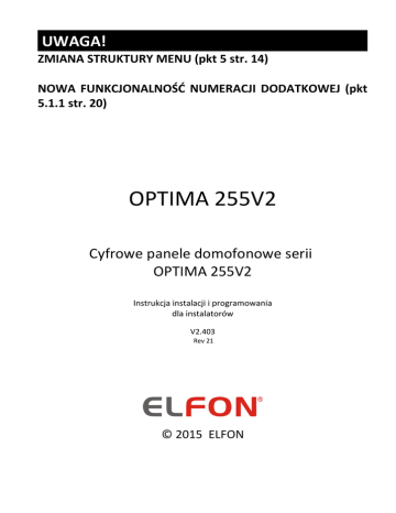 UWAGA! ZMIANA STRUKTURY MENU (pkt 5 str. 14) NOWA FUNKCJONALNOŚĆ NUMERACJI DODATKOWEJ (pkt 5.1.1 str. 20) OPTIMA 255V2 Cyfrowe panele domofonowe serii OPTIMA 255V2 Instrukcja instalacji i programowania dla instalatorów V2.403 Rev 21 © 2015 ELFON 2 Spis treści 1. Informacje ogólne.........................................................................................................................................6 2. Dane techniczne...........................................................................................................................................6 3. Instrukcja instalacji.......................................................................................................................................6 3.1 Montaż..................................................................................................................................................7 3.2 Wymiana wizytówki adresowej ..........................................................................................................10 4. Instrukcja obsługi i programowania............................................................................................................12 4.1 Klawiatura............................................................................................................................................12 4.2 Pierwsze uruchomienie........................................................................................................................12 4.3 Nawiązanie połączenia........................................................................................................................13 4.4 Otwarcie elektrozaczepu oraz przekaźnika..........................................................................................14 5. Organizacja menu „Ustawienia”.................................................................................................................14 5.1 Programy serwisowe...........................................................................................................................18 5.1.1 Numeracja lokali.........................................................................................................................18 Numeracja dodatkowa..................................................................................................................21 5.1.2 Testy Serwisowe.........................................................................................................................21 Unifony odebrane..........................................................................................................................21 Unifony źle podłączone..................................................................................................................21 Test zaczepu.................................................................................................................................22 Test przekaźnika...........................................................................................................................22 Włącz tryb instalacji......................................................................................................................22 5.1.3 Wersja firmware.........................................................................................................................23 5.2 Kontrola dostępu.................................................................................................................................23 5.2.1 Kod serwisowy............................................................................................................................23 5.2.2 Serwisowe klucze RF ..................................................................................................................24 5.2.3 Sprawdź klucz RF ........................................................................................................................24 5.2.4 Numer seryjny............................................................................................................................24 5.2.5 Strojenie RFID.............................................................................................................................25 5.3 Przywróć domyślne..............................................................................................................................25 5.3.1 Domyślne numery.......................................................................................................................25 5.3.2 Domyślne ustawienia ogólne......................................................................................................25 5.3.3 Domyślne kody ogólne................................................................................................................25 5.3.4 Domyślne ustawienia indywidualne...........................................................................................26 5.3.5 Kasuj indywidualne klucze RF.....................................................................................................26 5.3.6 Kasuj pamięć kodów indywidualnych.........................................................................................26 5.3.7 Domyślne wszystko.....................................................................................................................26 5.4 Ustawienia ogólne...............................................................................................................................27 5.4.1 Opcje rozmowy...........................................................................................................................27 Czas rozmowy................................................................................................................................27 Czas zestawiania połączenia..........................................................................................................27 Czas dzwonienia.....................