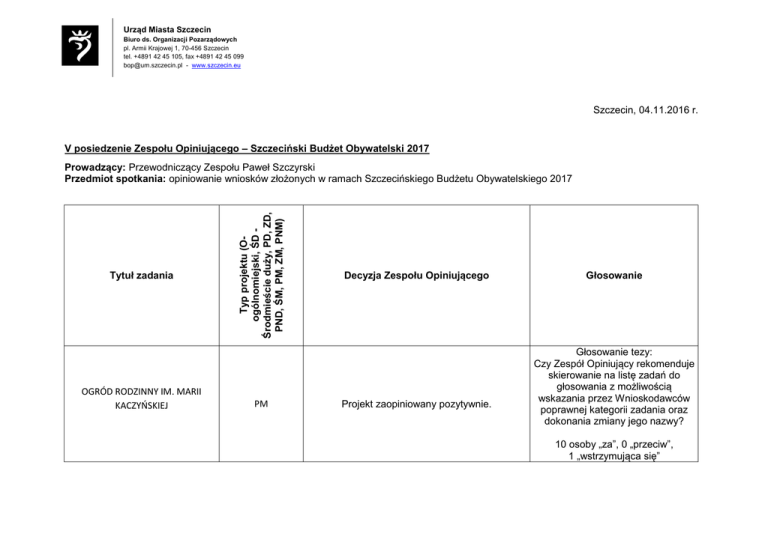 Urząd Miasta Szczecin Biuro ds. Organizacji Pozarządowych pl. Armii Krajowej 1, 70-456 Szczecin tel. +4891 42 45 105, fax +4891 42 45 099 [email protected] - www.szczecin.eu Szczecin, 04.11.2016 r. V posiedzenie Zespołu Opiniującego – Szczeciński Budżet Obywatelski 2017 Tytuł zadania OGRÓD RODZINNY IM. MARII KACZYŃSKIEJ Typ projektu (Oogólnomiejski, ŚD Środmieście duży, PD, ZD, PND, ŚM, PM, ZM, PNM) Prowadzący: Przewodniczący Zespołu Paweł Szczyrski Przedmiot spotkania: opiniowanie wniosków złożonych w ramach Szczecińskiego Budżetu Obywatelskiego 2017 PM Decyzja Zespołu Opiniującego Projekt zaopiniowany pozytywnie. Głosowanie Głosowanie tezy: Czy Zespół Opiniujący rekomenduje skierowanie na listę zadań do głosowania z możliwością wskazania przez Wnioskodawców poprawnej kategorii zadania oraz dokonania zmiany jego nazwy? 10 osoby „za”, 0 „przeciw”, 1 „wstrzymująca się” Głosowanie tez: Czy Zespół Opiniujący rekomenduje wprowadzenie propozycji na listę zadań do głosowania? BUKOVASPORT O Projekt odesłany do ponownego zaopiniowania 4 osób „za”, 4 „przeciw”, 4 „wstrzymujące się” Czy Zespół Opiniujący rekomenduje odesłanie wniosku w celu ponownego zaopiniowania? BEZPIECZNY PARKING – BEZPIECZNE DZIECKO. BUDOWA PARKINGU PRZY SZKOLE PODSTAWOWEJ NR 53 W SZCZECINIE AKTYWNE MIEJSCE DLA MIESZKAŃCÓW I TURYSTÓW - PARK ŻEROMSKIEGO, CENTRUM SZCZECINA DROGA ROWEROWA NA TRASIE KIJEWO - PŁONIA POPRZEZ PUSZCZĘ BUKOWĄ ZM Wniosek zaakceptowany pozytywnie. Projekt zaopiniowany negatywnie. O UZASADNIENIE: Park Żeromskiego jest ekosystemem, objętym specjalnym programem; brak zgody na punktowe działanie na terenie parku, który jest miejscem zabytkowym. Projekt zaopiniowany negatywnie. PD UZASADNIENIE: zadanie jest już realizowane. PNM 6 osób „za”, 1 „przeciw”, 2 „wstrzymujące się” Głosowanie tezy: Czy Zespół Opiniujący rekomenduje wprowadzenie propozycji na listę zadań do głosowania? 0 osób „za”, 8 „przeciw”, 3 „wstrzymujących się” Głosowanie tezy: Czy Zespół Opiniujący rekomenduje wprowadzenie propozycji na listę zadań do głosowania? 0 osób „za”, 9 „przeciw”, 2 „wstrzymujących się” Głosowanie tezy: Czy Zespół Opiniujący rekomenduje wprowadzenie propozycji na listę Wniosek o przekwalifikowanie projektu z małego zadań do głosowania z dzielnicowego na duże dzielnicowe. przekwalifikowaniem kategorii Projekt zaopiniowany pozytywnie. PROSTE CHODNIKI 5 osób „za”, 3 „przeciw”, 4 „wstrzymująca się” Głosowanie tezy: Czy Zespół Opiniujący rekomenduje ponowne odesłanie wniosku do wydziałów opiniujących z załączonym kosztorysem zadania? zadania z małego dzielnicowego na duże dzielnicowe? Projekt zaopiniowany negatywnie FRYGA JAKO DOMINANTA FRYGA DO ODRY PNM UZASADNIENIE: prawo do decydowaniu o projekcie należy do Właściciela. Projekt zaopiniowany negatywnie ŚM UZASADNIENIE: jak wyżej. FRYGA NA WYSPIE Projekt zaopiniowany negatywnie ZM UZASADNIENIE: jak wyżej. BUDOWA CHODNIKA I OŚWIETLENIA NA BUGUMIŃSKIEJ PARK KUMAKA - PARK EDUKACYJNO - REKREACYJNY PRZY ULICY WARCISŁAWA PND PND Projekt zaopiniowany pozytywnie. Projekt zaopiniowany pozytywnie. 6 osób „za”, 0 „przeciw”, 3 „wstrzymujące się” Głosowanie tezy: Czy Zespół Opiniujący rekomenduje wprowadzenie propozycji na listę zadań do głosowania? 8 osób „za”, 1 „przeciw”, 0 „wstrzymujące się” Głosowanie tezy: Czy Zespół Opiniujący rekomenduje wprowadzenie propozycji na listę zadań do głosowania? 7 osób „za”, 0 „przeciw”, 2 „wstrzymujących się” Głosowanie tezy: Czy Zespół Opiniujący rekomenduje wprowadzenie propozycji na listę zadań do głosowania? 6 osób „za”, 0 „przeciw”, 3 „wstrzymujące się” Głosowanie tezy: Czy Zespół Opiniujący rekomenduje wprowadzenie propozycji na listę zadań do głosowania? 5 osób „za”, 0 „przeciw”, 6 „wstrzymujące się” Głosowanie tezy: Czy Zespół Opiniujący rekomenduje wprowadzenie propozycji na listę zadań do głosowania ze wskazaniem dla Wnioskodawcy ograniczenia do działki 6/2 z obrębu 3096? PUNKT WIDOKOWY NA WZGÓRZU PANORAMA SZCZECINA ŁĄKI KWIETNE - ESTETYCZNE ARTERIE MIEJSKIE UL. 26 KWIETNIA, UL. PRZYJACIÓŁ ŻOŁNIERZA, UL. LESZCZYNOWA, TRASA ZAMKOWA PD O Projekt zaopiniowany pozytywnie. Projekt zaopiniowany pozytywnie. INSTALACJA SYGNALIZACJI ŚWIETLNEJ NA SKRZYŻOWANIU ULIC TRAUGUTTA, PRZYBYSZEWSKIEGO I LINDEGO ODBUDOWA WIEŻY QUISTORPA W LESIE ARKOŃSKIM 9 osób „za”, 0 „przeciw”, 2 „wstrzymująca się” Głosowanie tezy: Czy Zespół Opiniujący rekomenduje wprowadzenie propozycji na listę zadań do głosowania? 7 osób „za”, 0 „przeciw”, 3 „wstrzymujące się” Projekt zaopiniowany negatywnie MOST PIONIERÓW DLA ROWERÓW 10 osób „za”, 0 „przeciw”, 1 „wstrzymująca się” Głosowanie tezy: Czy Zespół Opiniujący rekomenduje wprowadzenie propozycji na listę zadań do głosowania? O UZASADNIENIE: koszt zadania przewyższa koszty finansowania projektów o charakterze Ogólnomiejskim. Projekt zaopiniowany negatywnie ZM O UZASADNIENIE: koszt zadania przewyższa koszty finansowania projektów o charakterze małe dzielnicowe; projekt jest częściowo w planie realizacji. Głosowanie tezy: Czy Zespół Opiniujący rekomenduje wprowadzenie propozycji na listę zadań do głosowania? 1 osób „za”, 6 „przeciw”, 3 „wstrzymujące się” Głosowanie tezy: Czy Zespół Opiniujący rekomenduje wprowadzenie propozycji na listę zadań do głosowania? 0 osób „za”, 7 „przeciw”, 3 „wstrzymujące się” Głosowanie tez: Czy Zespół Opiniujący rekomenduje Projekt odesłany do ponownego zaopiniowania wprowadzenie propozycji na listę przez Miejskiego Konserwatora Zabytków, celem zadań do głosowania? wygenerowania szczegółowego kosztorysu odbudowy wieży Quistorpa w Lesie Arkońskim. 0 osób „za
