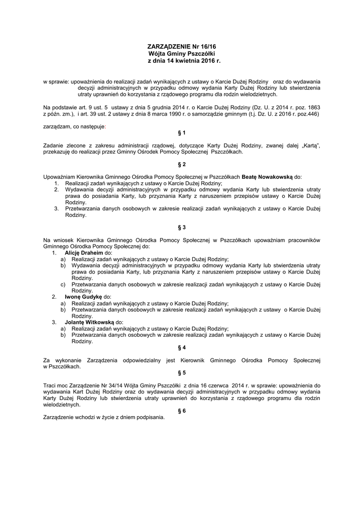 ZARZĄDZENIE Nr 16/16 Wójta Gminy Pszczółki z dnia 14 kwietnia 2016 r. w sprawie: upoważnienia do realizacji zadań wynikających z ustawy o Karcie Dużej Rodziny oraz do wydawania decyzji administracyjnych w przypadku odmowy wydania Karty Dużej Rodziny lub stwierdzenia utraty uprawnień do korzystania z rządowego programu dla rodzin wielodzietnych. Na podstawie art. 9 ust. 5 ustawy z dnia 5 grudnia 2014 r. o Karcie Dużej Rodziny (Dz. U. z 2014 r. poz. 1863 z późn. zm.), i art. 39 ust. 2 ustawy z dnia 8 marca 1990 r. o samorządzie gminnym (t.j. Dz. U. z 2016 r. poz.446) zarządzam, co następuje: §1 Zadanie zlecone z zakresu administracji rządowej, dotyczące Karty Dużej Rodziny, zwanej dalej „Kartą”, przekazuję do realizacji przez Gminny Ośrodek Pomocy Społecznej Pszczółkach. §2 Upoważniam Kierownika Gminnego Ośrodka Pomocy Społecznej w Pszczółkach Beatę Nowakowską do: 1. Realizacji zadań wynikających z ustawy o Karcie Dużej Rodziny; 2. Wydawania decyzji administracyjnych w przypadku odmowy wydania Karty lub stwierdzenia utraty prawa do posiadania Karty, lub przyznania Karty z naruszeniem przepisów ustawy o Karcie Dużej Rodziny. 3. Przetwarzania danych osobowych w zakresie realizacji zadań wynikających z ustawy o Karcie Dużej Rodziny. §3 Na wniosek Kierownika Gminnego Ośrodka Pomocy Społecznej w Pszczółkach upoważniam pracowników Gminnego Ośrodka Pomocy Społecznej do: 1. Alicję Draheim do: a) Realizacji zadań wynikających z ustawy o Karcie Dużej Rodziny; b) Wydawania decyzji administracyjnych w przypadku odmowy wydania Karty lub stwierdzenia utraty prawa do posiadania Karty, lub przyznania Karty z naruszeniem przepisów ustawy o Karcie Dużej Rodziny. c) Przetwarzania danych osobowych w zakresie realizacji zadań wynikających z ustawy o Karcie Dużej Rodziny. 2. Iwonę Gudykę do: a) Realizacji zadań wynikających z ustawy o Karcie Dużej Rodziny; b) Przetwarzania danych osobowych w zakresie realizacji zadań wynikających z ustawy o Karcie Dużej Rodziny. 3. Jolantę Witkowską do: a) Realizacji zadań wynikających z ustawy o Karcie Dużej Rodziny; b) Przetwarzania danych osobowych w zakresie realizacji zadań wynikających z ustawy o Karcie Dużej Rodziny. §4 Za wykonanie w Pszczółkach. Zarządzenia odpowiedzialny jest Kierownik Gminnego Ośrodka Pomocy Społecznej §5 Traci moc Zarządzenie Nr 34/14 Wójta Gminy Pszczółki z dnia 16 czerwca 2014 r. w sprawie: upoważnienia do wydawania Kart Dużej Rodziny oraz do wydawania decyzji administracyjnych w przypadku odmowy wydania Karty Dużej Rodziny lub stwierdzenia utraty uprawnień do korzystania z rządowego programu dla rodzin wielodzietnych. §6 Zarządzenie wchodzi w życie z dniem podpisania. UZASADNIENIE Realizacja zadań wynikających z ustawy z dnia 5 grudnia 2014 r. o Karcie Dużej Rodziny (Dz. U. z 2014 r. poz. 1863 z późn. zm.) jest zadaniem zleconym z zakresu administracji rządowej. Zgodnie z art. 9 ust. 5 niniejszej ustawy kierownik jednostki organizacyjnej gminy realizującej powyższe zadanie może wystąpić do Wójta z wnioskiem o upoważnienie w formie pisemnej osób będących pracownikami tej jednostki o upoważnienie do realizacji zadań wynikających z niniejszej ustawy. Beata Nowakowska, Kierownik Gminnego Ośrodka Pomocy Społecznej w Pszczółkach, wystąpiła do Wójta Gminy Pszczółki, z prośbą o upoważnienie pracowników Gminnego Ośrodka Pomocy Społecznej w Pszczółkach, Alicji Draheim, Iwony Gudyki oraz Jolanty Witkowskiej do realizacji zadań wynikających z zapisów ustawy o Karcie Dużej Rodziny. Wobec powyższego, wydanie niniejszego Zarządzenia jest zasadne.