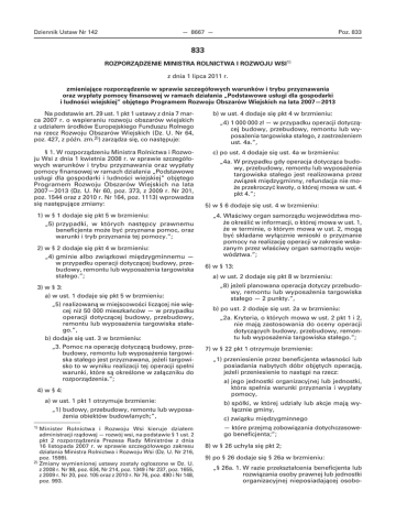 Dziennik Ustaw Nr 142 — 8667 — Poz. 833 833 ROZPORZĄDZENIE MINISTRA ROLNICTWA I ROZWOJU WSI1) z dnia 1 lipca 2011 r. zmieniające rozporządzenie w sprawie szczegółowych warunków i trybu przyznawania oraz wypłaty pomocy finansowej w ramach działania „Podstawowe usługi dla gospodarki i ludności wiejskiej” objętego Programem Rozwoju Obszarów Wiejskich na lata 2007—2013 Na podstawie art. 29 ust. 1 pkt 1 ustawy z dnia 7 marca 2007 r. o wspieraniu rozwoju obszarów wiejskich z udziałem środków Europejskiego Funduszu Rolnego na rzecz Rozwoju Obszarów Wiejskich (Dz. U. Nr 64, poz. 427, z późn. zm.2)) zarządza się, co następuje: b) w ust. 4 dodaje się pkt 4 w brzmieniu: § 1. W rozporządzeniu Ministra Rolnictwa i Rozwoju Wsi z dnia 1 kwietnia 2008 r. w sprawie szczegółowych warunków i trybu przyznawania oraz wypłaty pomocy finansowej w ramach działania „Podstawowe usługi dla gospodarki i ludności wiejskiej” objętego Programem Rozwoju Obszarów Wiejskich na lata 2007—2013 (Dz. U. Nr 60, poz. 373, z 2009 r. Nr 201, poz. 1544 oraz z 2010 r. Nr 164, poz. 1113) wprowadza się następujące zmiany: c) po ust. 4 dodaje się ust. 4a w brzmieniu: 1) w § 1 dodaje się pkt 5 w brzmieniu: „5) przypadki, w których następcy prawnemu beneficjenta może być przyznana pomoc, oraz warunki i tryb przyznania tej pomocy.”; 2) w § 2 dodaje się pkt 4 w brzmieniu: „4) gminie albo związkowi międzygminnemu — w przypadku operacji dotyczącej budowy, przebudowy, remontu lub wyposażenia targowiska stałego.”; 3) w § 3: a) w ust. 1 dodaje się pkt 5 w brzmieniu: „5) realizowaną w miejscowości liczącej nie więcej niż 50 000 mieszkańców — w przypadku operacji dotyczącej budowy, przebudowy, remontu lub wyposażenia targowiska stałego.”, b) dodaje się ust. 3 w brzmieniu: „3. Pomoc na operację dotyczącą budowy, przebudowy, remontu lub wyposażenia targowiska stałego jest przyznawana, jeżeli targowisko to w wyniku realizacji tej operacji spełni warunki, które są określone w załączniku do rozporządzenia.”; 4) w § 4: a) w ust. 1 pkt 1 otrzymuje brzmienie: „1) budowy, przebudowy, remontu lub wyposażenia obiektów budowlanych;”, 1) Minister Rolnictwa i Rozwoju Wsi kieruje działem administracji rządowej — rozwój wsi, na podstawie § 1 ust. 2 pkt 2 rozporządzenia Prezesa Rady Ministrów z dnia 16 listopada 2007 r. w sprawie szczegółowego zakresu działania Ministra Rolnictwa i Rozwoju Wsi (Dz. U. Nr 216, poz. 1599). 2) Zmiany wymienionej ustawy zostały ogłoszone w Dz. U. z 2008 r. Nr 98, poz. 634, Nr 214, poz. 1349 i Nr 237, poz. 1655, z 2009 r. Nr 20, poz. 105 oraz z 2010 r. Nr 76, poz. 490 i Nr 148, poz. 993. „4) 1 000 000 zł — w przypadku operacji dotyczącej budowy, przebudowy, remontu lub wyposażenia targowiska stałego, z zastrzeżeniem ust. 4a.”, „4a. W przypadku gdy operacja dotycząca budowy, przebudowy, remontu lub wyposażenia targowiska stałego jest realizowana przez związek międzygminny, refundacja nie może przekroczyć kwoty, o której mowa w ust. 4 pkt 4.”; 5) w § 6 dodaje się ust. 4 w brzmieniu: „4. Właściwy organ samorządu województwa może określić w informacji, o której mowa w ust. 1, że w terminie, o którym mowa w ust. 2, mogą być składane wyłącznie wnioski o przyznanie pomocy na realizację operacji w zakresie wskazanym przez właściwy organ samorządu województwa.”; 6) w § 13: a) w ust. 2 dodaje się pkt 8 w brzmieniu: „8) jeżeli planowana operacja dotyczy przebudowy, remontu lub wyposażenia targowiska stałego — 2 punkty.”, b) po ust. 2 dodaje się ust. 2a w brzmieniu: „2a. Kryteria, o których mowa w ust. 2 pkt 1 i 2, nie mają zastosowania do oceny operacji dotyczących budowy, przebudowy, remontu lub wyposażenia targowiska stałego.”; 7) w § 22 pkt 1 otrzymuje brzmienie: „1) przeniesienie przez beneficjenta własności lub posiadania nabytych dóbr objętych operacją, jeżeli przeniesienie to nastąpi na rzecz: a) jego jednostki organizacyjnej lub jednostki, która spełnia warunki przyznania i wypłaty pomocy, b) spółki, w której udziały lub akcje mają wyłącznie gminy, c) związku międzygminnego — które przejmą zobowiązania dotychczasowego beneficjenta;”; 8) w § 26 uchyla się pkt 2; 9) po § 26 dodaje się § 26a w brzmieniu: „§ 26a. 1. W razie przekształcenia beneficjenta lub rozwiązania osoby prawnej lub jednostki organizacyjnej nieposiadającej osobo- Dziennik Ustaw Nr 142 — 8668 — wości prawnej, następcy prawnemu beneficjenta, zwanemu dalej „następcą”, może być przyznana pomoc, jeżeli: 1) zostały spełnione warunki określone w art. 25 ust. 2 ustawy z dnia 7 marca 2007 r. o wspieraniu rozwoju obszarów wiejskich z udziałem środków Europejskiego Funduszu Rolnego na rzecz Rozwoju Obszarów Wiejskich; 2) na następcę przeszły prawa beneficjenta nabyte w ramach realizacji operacji oraz inne prawa beneficjenta niezbędne do zrealizowania operacji. 2. Wniosek następcy o przyznanie pomocy, zwany dalej „wnioskiem następcy”, składa się we właściwym urzędzie marszałkowskim albo w samorządowej jednostce, w terminie 3 miesięcy od dnia zaistnienia zdarzenia określonego w ust. 1. 3. Do wniosku następcy dołącza się dokument potwierdzający fakt zaistnienia następstwa prawnego. 4. W przypadku złożenia wniosku następcy po upływie terminu, o którym mowa w ust. 2, pomocy nie przyznaje się, o czym wnioskodawcę informuje się na piśmie, podając przyczyny nieprzyznania pomocy. Poz. 833 5. Wniosek następcy rozpatruje się w terminie 3 miesięcy od dnia jego złożenia. 6. Do wniosku następcy i trybu jego rozpatrywania przepisy § 10 ust. 1 pkt 1, 2 i 5, ust. 2 oraz § 11 ust. 1—3 stosuje się odpowiednio.”; 10) dodaje się załącznik do rozporządzenia w brzmieniu określonym w załączniku do niniejszego rozporządzenia. § 2. Jeżeli zdarzenie prawne określone w § 26a ust. 1 rozpor