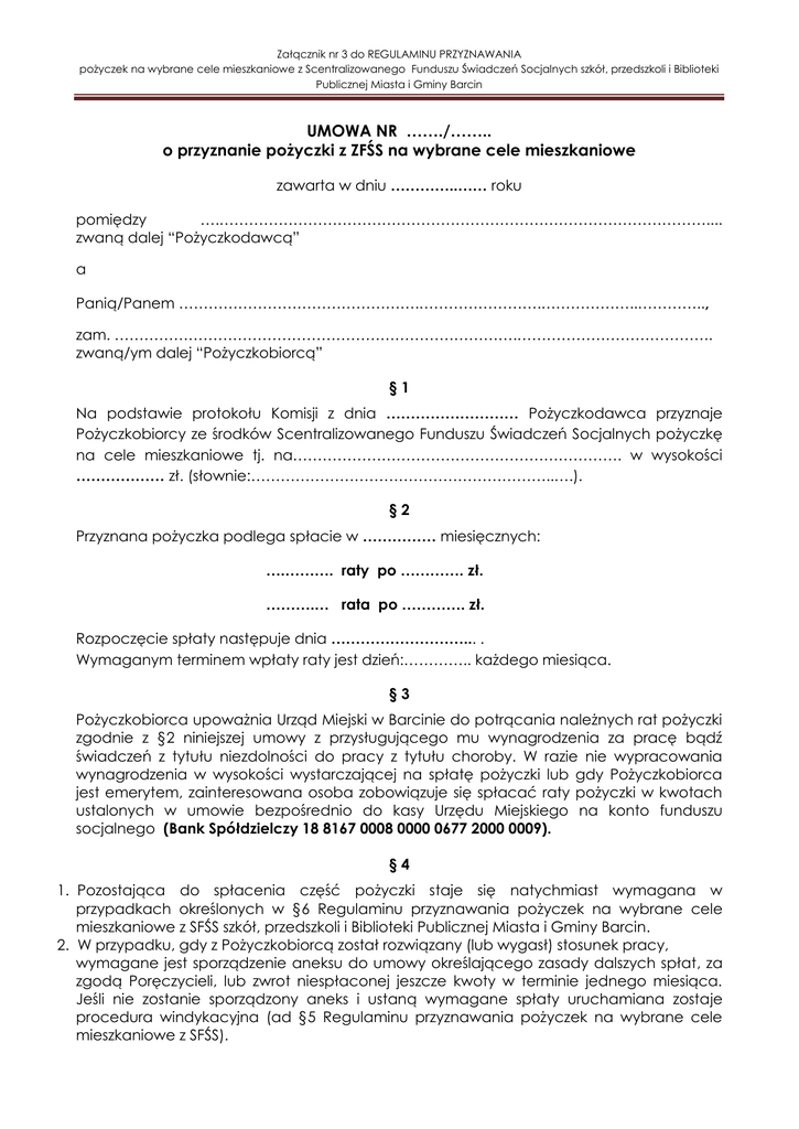 Załącznik nr 3 do REGULAMINU PRZYZNAWANIA pożyczek na wybrane cele mieszkaniowe z Scentralizowanego Funduszu Świadczeń Socjalnych szkół, przedszkoli i Biblioteki Publicznej Miasta i Gminy Barcin UMOWA NR ……./…….. o przyznanie pożyczki z ZFŚS na wybrane cele mieszkaniowe zawarta w dniu …………..…… roku pomiędzy ….……………………………………………………………………………………….... zwaną dalej “Pożyczkodawcą” a Panią/Panem ………………………………………….…………………….………………..………….., zam. ……………………………………………………………………….…………………………………. zwaną/ym dalej “Pożyczkobiorcą” §1 Na podstawie protokołu Komisji z dnia ……………………… Pożyczkodawca przyznaje Pożyczkobiorcy ze środków Scentralizowanego Funduszu Świadczeń Socjalnych pożyczkę na cele mieszkaniowe tj. na…………………………………………………………. w wysokości ……………… zł. (słownie:……………………………………………………..….). §2 Przyznana pożyczka podlega spłacie w …………… miesięcznych: ….………. raty po …………. zł. ……….… rata po …………. zł. Rozpoczęcie spłaty następuje dnia ………………………... . Wymaganym terminem wpłaty raty jest dzień:………….. każdego miesiąca. §3 Pożyczkobiorca upoważnia Urząd Miejski w Barcinie do potrącania należnych rat pożyczki zgodnie z §2 niniejszej umowy z przysługującego mu wynagrodzenia za pracę bądź świadczeń z tytułu niezdolności do pracy z tytułu choroby. W razie nie wypracowania wynagrodzenia w wysokości wystarczającej na spłatę pożyczki lub gdy Pożyczkobiorca jest emerytem, zainteresowana osoba zobowiązuje się spłacać raty pożyczki w kwotach ustalonych w umowie bezpośrednio do kasy Urzędu Miejskiego na konto funduszu socjalnego (Bank Spółdzielczy 18 8167 0008 0000 0677 2000 0009). §4 1. Pozostająca do spłacenia część pożyczki staje się natychmiast wymagana w przypadkach określonych w §6 Regulaminu przyznawania pożyczek na wybrane cele mieszkaniowe z SFŚS szkół, przedszkoli i Biblioteki Publicznej Miasta i Gminy Barcin. 2. W przypadku, gdy z Pożyczkobiorcą został rozwiązany (lub wygasł) stosunek pracy, wymagane jest sporządzenie aneksu do umowy określającego zasady dalszych spłat, za zgodą Poręczycieli, lub zwrot niespłaconej jeszcze kwoty w terminie jednego miesiąca. Jeśli nie zostanie sporządzony aneks i ustaną wymagane spłaty uruchamiana zostaje procedura windykacyjna (ad §5 Regulaminu przyznawania pożyczek na wybrane cele mieszkaniowe z SFŚS). Załącznik nr 3 do REGULAMINU PRZYZNAWANIA pożyczek na wybrane cele mieszkaniowe z Scentralizowanego Funduszu Świadczeń Socjalnych szkół, przedszkoli i Biblioteki Publicznej Miasta i Gminy Barcin §5 Zmiana warunków określonych w umowie wymaga formy pisemnej (aneksu) pod rygorem nieważności. §6 W sprawach nieuregulowanych niniejszą umową stosuje się postanowienia Regulaminu SFŚS oraz przepisy Kodeksu Cywilnego. §7 Pożyczkobiorca oświadcza, że znane mu są postanowienia REGULAMINU PRZYZNAWANIA pożyczek na wybrane cele mieszkaniowe z Scentralizowanego Funduszu Świadczeń Socjalnych szkół, przedszkoli i Biblioteki Publicznej Miasta i Gminy Barcin. §8 Umowę sporządza się w ……. jednobrzmiących egzemplarzach, po jednym dla każdej ze stron oraz jednym dla Administratora wspólnej działalności socjalnej. .................................................. (podpis Pożyczkobiorcy) ………….………...................................... (podpis i pieczęć Pożyczkodawcy) Oświadczenie poręczycieli: 1. ……………………………………..……………………………… nr PESEL …………………..………… /imię i nazwisko/ adres do korespondencji ……………………………….……….……………………………………….. 2. ……………………………………………………………..……… nr PESEL …………………..………… /imię i nazwisko/ adres do korespondencji …………………………………………...…………………………………….. 3. ………………………………………………………………....… nr PESEL …………………...………… /imię i nazwisko/ adres do korespondencji …………………………………...…………………………………………….. Ja, niżej podpisany oświadczam, że poręczam solidarnie za zobowiązania powstałe z tytułu zawarcia niniejszej umowy. Poręczenia udzielam bezterminowo do pełnej wysokości zobowiązań. Upoważniam dyrektora do dokonania potrąceń bezpośrednio z przysługującego mi wynagrodzenia za pracę, zasiłku chorobowego, zasiłku wychowawczego, odpraw i nagród zobowiązań powstałych z tytułu udzielenia niniejszej pożyczki*. *dotyczy poręczycieli zatrudnionych w placówce 1. ……………………………… (podpis poręczyciela) 2 ……………………………… (podpis poręczyciela) 3………………………………….. (podpis poręczyciela) Stwierdzam własnoręczność podpisów poręczycieli w w/w pozycjach. ……………………………………… (podpis dyrektora)