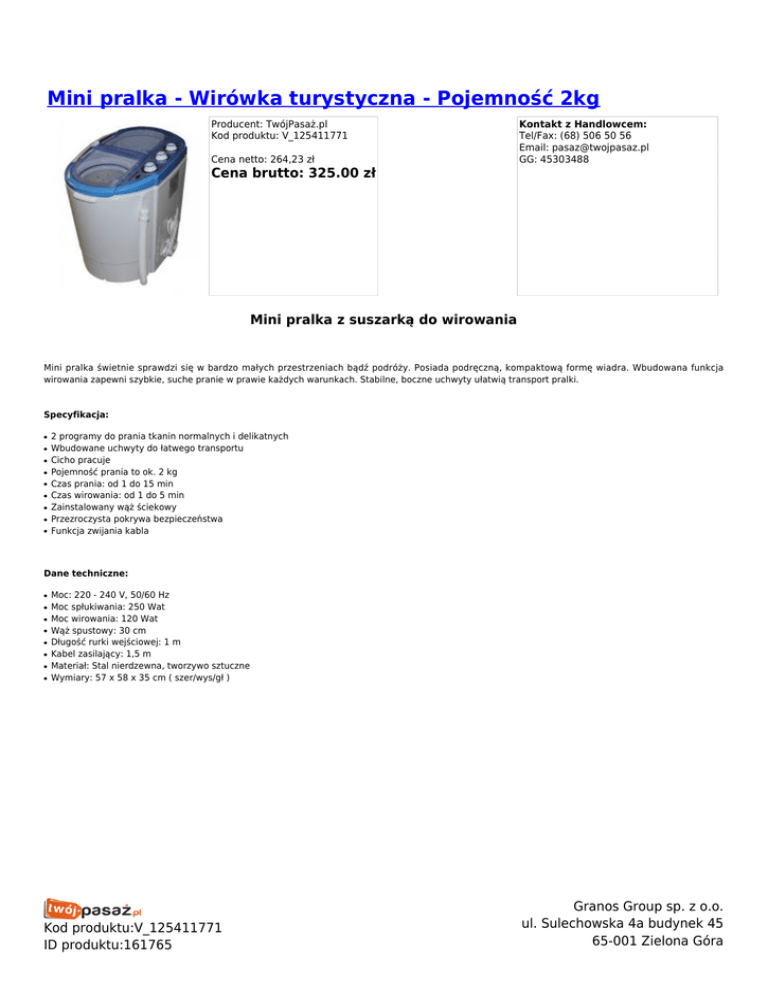 Mini pralka - Wirówka turystyczna - Pojemność 2kg Producent: TwójPasaż.pl Kod produktu: V_125411771 Cena netto: 264,23 zł Kontakt z Handlowcem: Tel/Fax: (68) 506 50 56 Email: [email protected] GG: 45303488 Cena brutto: 325.00 zł Mini pralka z suszarką do wirowania Mini pralka świetnie sprawdzi się w bardzo małych przestrzeniach bądź podróży. Posiada podręczną, kompaktową formę wiadra. Wbudowana funkcja wirowania zapewni szybkie, suche pranie w prawie każdych warunkach. Stabilne, boczne uchwyty ułatwią transport pralki. Specyfikacja: ● ● ● ● ● ● ● ● ● 2 programy do prania tkanin normalnych i delikatnych Wbudowane uchwyty do łatwego transportu Cicho pracuje Pojemność prania to ok. 2 kg Czas prania: od 1 do 15 min Czas wirowania: od 1 do 5 min Zainstalowany wąż ściekowy Przezroczysta pokrywa bezpieczeństwa Funkcja zwijania kabla Dane techniczne: ● ● ● ● ● ● ● ● Moc: 220 - 240 V, 50/60 Hz Moc spłukiwania: 250 Wat Moc wirowania: 120 Wat Wąż spustowy: 30 cm Długość rurki wejściowej: 1 m Kabel zasilający: 1,5 m Materiał: Stal nierdzewna, tworzywo sztuczne Wymiary: 57 x 58 x 35 cm ( szer/wys/gł ) Kod produktu:V_125411771 ID produktu:161765 Granos Group sp. z o.o. ul. Sulechowska 4a budynek 45 65-001 Zielona Góra