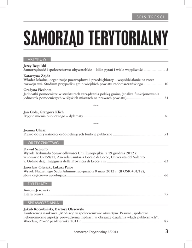 SPIS TREŚCI ARTYKUŁY Jerzy Regulski Samorządność i społeczeństwo obywatelskie – kilka pytań i wiele wątpliwości ...................... 5 Katarzyna Zajda Władza lokalna, organizacje pozarządowe i przedsiębiorcy – współdziałanie na rzecz rozwoju wsi. Studium przypadku gmin wiejskich powiatu radomszczańskiego .................... 10 Grażyna Piechota Jednostki pomocnicze w strukturach zarządzania polską gminą (analiza funkcjonowania jednostek pomocniczych w śląskich miastach na prawach powiatu) ..................................... 21 *** Jan Gola, Grzegorz Klich Pojęcie mienia publicznego – dylematy ................................................................................ 36 *** Joanna Uliasz Prawo do prywatności osób pełniących funkcje publiczne ................................................... 51 ORZECZNICTWO Dawid Sześciło Wyrok Trybunału Sprawiedliwości Unii Europejskiej z 19 grudnia 2012 r. w sprawie C-159/11, Azienda Sanitaria Locale di Lecce, Università del Salento v. Ordine degli Ingegneri della Provincia di Lecce i in. ......................................................... 63 Jarosław Olesiak, Łukasz Pajor Wyrok Naczelnego Sądu Administracyjnego z 8 maja 2012 r. (II OSK 401/12), glosa częściowo aprobująca .................................................................................................. 66 DYLEMATY Antoni Jeżowski Litera prawa ......................................................................................................................... 75 SPRAWOZDANIA Jakub Kociubiński, Bartosz Olszewski Konferencja naukowa „Mediacje w społeczeństwie otwartym. Prawne, społeczne i ekonomiczne aspekty prowadzenia mediacji w obszarze działania władz publicznych”, Wrocław, 21–22 października 2011 r. .................................................................................. 85 Samorząd Terytorialny 3/2013 3 SPIS TREŚCI PRZEGLĄD PIŚMIENNICTWA Opracowała Justyna Przedańska ...........................................................................................89 Table of Contents & Abstracts .............................................................................................92 WARUNKI PRZYJMOWANIA TEKSTÓW DO DRUKU Redakcja przyjmuje teksty oryginalne o objętości 30–50 tys. znaków, z wyraźnie zaznaczonym tytułem, podziałem na podrozdziały, podsumowaniem, przypisami, krótką notką o autorze oraz adresem e-mailowym. Materiały większe lub mniejsze albo już publikowane wymagają osobnej zgody Redaktora Naczelnego. Wymagania co do wielkości tekstu nie dotyczą polemik, glos, sprawozdań, recenzji itp. Tekst należy również zaopatrzyć w abstrakt w języku polskim, o objętości nie większej niż 500 znaków. Autor może zaproponować tłumaczenie na język angielski tytułu tekstu oraz abstraktu, a także podać adres e-mailowy w celu publikacji. Przypisy powinny być opracowane w tradycyjny sposób – na dole strony. Dopuszczalny jest również wykaz wykorzystanej w tekście literatury. Materiały wraz z danymi autora (stanowisko, adres, numer telefonu) i ewentualnym listem polecającym prosimy przysyłać pocztą elektroniczną lub zwykłą, z załączoną płytą CD. Przekazując tekst do redakcji, autor przenosi na Wydawcę wyłączne prawo do jego publikacji. Nie drukujemy artykułów o charakterze opisowym, pozbawionych aspektu badawczego lub nowych treści interesujących poznawczo. Autor ponosi odpowiedzialność za aktualny stan prawny, orzecznictwa i doktryny. Redakcja zastrzega sobie prawo skracania tekstów, zmiany tytułów, śródtytułów oraz poprawek merytorycznych i stylistycznych, również w wersji angielskiej. Materiałów niezamówionych nie zwracamy. Warunkiem publikacji tekstu jest odesłanie uprzednio podpisanej umowy z Wydawnictwem. Podstawowe zasady recenzowania tekstów oraz wymagania dla autorów dotyczące ghostwritingu są dostępne na stronie internetowej czasopisma: www.czasopisma.lex.pl/st Redakcja 4 Samorząd Terytorialny 3/2013 TA B L E O F CO N T E N T S & A B S T R A C T S Territorial Self-Government Scientific and Professional Monthly ARTICLES Jerzy Regulski Self-governance and the civic society – a few questions and numerous doubts..................................5 Is a civic society the ability of citizens to manage their own State, or the ability to handle their own affairs outside its structures? Are civic activities only those which are undertaken by NGOs? Therefore, is involvement in self-government a civic activity? What do the differences between holding an office in local authorities and NGOs involve? According to the author, we need to respond to precisely such questions if we want to increase the involvement of citizens in public activity and if we want our self-government to assume a more “civic” nature. Katarzyna Zajda Local authorities, NGOs and entrepreneurs – cooperation in rural development. Case study of rural municipalities in the Radomszczański County........................................................10 Representatives of local authorities, NGOs and entrepreneurs can work together within a partnership. Examples, which are reasonably commonly encountered in rural areas, are local action groups. They support territorial self-government units in such areas as narrowing the socio-economic problems of rural areas. Nevertheless, there are areas which are not encompassed by their support – an example is the Radomszczański County in the Łódź Voivodship. In this article, the authoress presents the relationship between the local authorities of rural municipalities, entrepreneurs and NGOs in this area and assesses their chances of partnership cooperation in rural development. Grażyna Piechota Auxiliary units in the management structures of the Polish municipality (analysis of the functioning of auxiliary units in Silesian cities on the rights of a county) ............... 21 In the article, the author