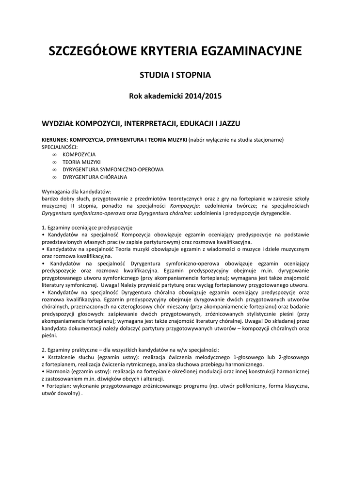 SZCZEGÓŁOWE KRYTERIA EGZAMINACYJNE STUDIA I STOPNIA Rok akademicki 2014/2015 WYDZIAŁ KOMPOZYCJI, INTERPRETACJI, EDUKACJI I JAZZU KIERUNEK: KOMPOZYCJA, DYRYGENTURA I TEORIA MUZYKI (nabór wyłącznie na studia stacjonarne) SPECJALNOŚCI: • KOMPOZYCJA • TEORIA MUZYKI • DYRYGENTURA SYMFONICZNO-OPEROWA • DYRYGENTURA CHÓRALNA Wymagania dla kandydatów: bardzo dobry słuch, przygotowanie z przedmiotów teoretycznych oraz z gry na fortepianie w zakresie szkoły muzycznej II stopnia, ponadto na specjalności Kompozycja: uzdolnienia twórcze; na specjalnościach Dyrygentura symfoniczno-operowa oraz Dyrygentura chóralna: uzdolnienia i predyspozycje dyrygenckie. 1. Egzaminy oceniające predyspozycje • Kandydatów na specjalność Kompozycja obowiązuje egzamin oceniający predyspozycje na podstawie przedstawionych własnych prac (w zapisie partyturowym) oraz rozmowa kwalifikacyjna. • Kandydatów na specjalność Teoria muzyki obowiązuje egzamin z wiadomości o muzyce i dziele muzycznym oraz rozmowa kwalifikacyjna. • Kandydatów na specjalność Dyrygentura symfoniczno-operowa obowiązuje egzamin oceniający predyspozycje oraz rozmowa kwalifikacyjna. Egzamin predyspozycyjny obejmuje m.in. dyrygowanie przygotowanego utworu symfonicznego (przy akompaniamencie fortepianu); wymagana jest także znajomość literatury symfonicznej. Uwaga! Należy przynieść partyturę oraz wyciąg fortepianowy przygotowanego utworu. • Kandydatów na specjalność Dyrygentura chóralna obowiązuje egzamin oceniający predyspozycje oraz rozmowa kwalifikacyjna. Egzamin predyspozycyjny obejmuje dyrygowanie dwóch przygotowanych utworów chóralnych, przeznaczonych na czterogłosowy chór mieszany (przy akompaniamencie fortepianu) oraz badanie predyspozycji głosowych: zaśpiewanie dwóch przygotowanych, zróżnicowanych stylistycznie pieśni (przy akompaniamencie fortepianu); wymagana jest także znajomość literatury chóralnej. Uwaga! Do składanej przez kandydata dokumentacji należy dołaczyć partytury przygotowywanych utworów – kompozycji chóralnych oraz pieśni. 2. Egzaminy praktyczne – dla wszystkich kandydatów na w/w specjalności: • Kształcenie słuchu (egzamin ustny): realizacja ćwiczenia melodycznego 1-głosowego lub 2-głosowego z fortepianem, realizacja ćwiczenia rytmicznego, analiza słuchowa przebiegu harmonicznego. • Harmonia (egzamin ustny): realizacja na fortepianie określonej modulacji oraz innej konstrukcji harmonicznej z zastosowaniem m.in. dźwięków obcych i alteracji. • Fortepian: wykonanie przygotowanego zróżnicowanego programu (np. utwór polifoniczny, forma klasyczna, utwór dowolny) . KIERUNEK: EDUKACJA ARTYSTYCZNA W ZAKRESIE SZTUKI MUZYCZNEJ (nabór wyłącznie na studia stacjonarne) SPECJALNOŚĆ: • EDUKACJA MUZYCZNA, PROWADZENIE ZESPOŁÓW WOKALNYCH I WOKALNOINSTRUMENTALNYCH ORAZ PRZEDMIOTY TEORETYCZNO-MUZYCZNE • MUZYKOTERAPIA • RYTMIKA I PRZEDMIOTY TEORETYCZNO-MUZYCZNE (specjalność będzie otwarta w przypadku przyjęcia co najmniej 4 kadydatów) Wymagania dla kandydatów: dobry słuch muzyczny, wiedza i umiejętności muzyczne na poziomie szkoły muzycznej II st. 1. Egzaminy oceniające predyspozycje • Kandydatów na specjalność Edukacja muzyczna, prowadzenie zespołów wokalnych i wokalnoinstrumentalnych oraz przedmioty teoretyczno-muzyczne obowiązuje zadyrygowanie dwoma przygotowanymi nietrudnymi 4-głosowymi pieśniami (przy akompaniamencie fortepianu) oraz badanie predyspozycji głosowych (zaśpiewanie dwóch przygotowanych pieśni). • Kandydatów na specjalność Muzykoterapia obowiązuje badanie predyspozycji do prowadzenia zajęć muzykoterapeutycznych przeprowadzone w formie rozmowy kwalifikacyjnej. • Kandydatów na specjalność Rytmika i przedmioty teoretyczno-muzyczne obowiązują egzaminy obejmujące badanie predyspozycji głosowych (śpiew, mowa), badanie predyspozycji do prowadzenia zajęć rytmiki oraz rozmowa kwalifikacyjna. 2. Egzaminy praktyczne – dla wszystkich kandydatów na w/w specjalności: • Kształcenie słuchu (egzamin ustny): czytanie nut głosem, analiza słuchowa przebiegu harmonicznego, realizacja rytmu. • Harmonia (egzamin ustny): realizacja modulacji, sprawdzenie wiedzy teoretycznej. • Fortepian i drugi instrument: wykonanie przygotowanego programu na fortepianie oraz drugim instrumencie (gra na drugim instrumencie nie obowiązuje pianistów). KIERUNEK: JAZZ I MUZYKA ESTRADOWA SPECJALNOŚCI: • KOMPOZYCJA I ARANŻACJA • INSTRUMENTALISTYKA JAZZOWA • WOKALISTYKA JAZZOWA • REALIZACJA NAGŁOŚNIENIA (nabór wyłącznie na studia niestacjonarne) Wymagania dla kandydatów: wyobraźnia harmoniczno-melodyczna, dobre opanowanie rzemiosła instrumentalnego, specyficzne wyczucie frazy, swingu i rytmu, zdolności improwizatorskie. Egzaminy praktyczne SPECJALNOŚĆ: KOMPOZYCJA I ARANŻACJA • Kształcenie słuchu: ćwiczenia melodyczno-rytmiczne. • Harmonia: realizacja modulacji oraz innych połączeń akordowych. • Wykonanie krótkiej impresji na głos z fortepianem na kanwie podanych funkcji harmonicznych. • Gra na instrumencie głównym: wykonanie utworów muzyki klasycznej, improwizacja na bazie standardów jazzowych. • Gra na fortepianie (jeśli nie jest instrumentem głównym): wymagane wykonanie trzech utworów. • Próbki własnych kompozycji lub opracowań twórczych (aranżacji). SPECJALNOŚĆ: INSTRUMENTALISTYKA JAZZOWA (fortepian, gitara, gitara basowa, kontrabas, skrzypce, flet, saksofon, trąbka, puzon, perkusja, wibrafon, akordeon*) • Gra na instrumencie: improwizacja na bazie standardów jazzowych. • Kształcenie słuchu (egzamin ustny): ćwiczenia melodyczno-rytmiczne oraz harmonia na poziomie podstawowym. * nabór wyłącznie na studia niestacjonarne SPECJALNOŚĆ: WOKALISTYKA JAZZOWA • śpiew: wykonanie standardu jazzowego wylosowanego z 5 obowiązkowych standardów – wyłącznie akompaniatorem z Uczelni: 1. Angel Eyes, 2. Lullaby of Birdland, 3. My Romance 4. Ro