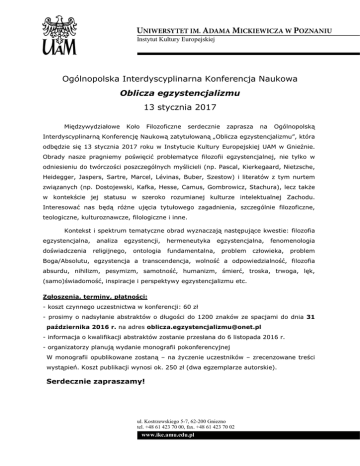 Instytut Kultury Europejskiej Ogólnopolska Interdyscyplinarna Konferencja Naukowa Oblicza egzystencjalizmu 13 stycznia 2017 Międzywydziałowe Koło Filozoficzne serdecznie zaprasza na Ogólnopolską Interdyscyplinarną Konferencję Naukową zatytułowaną „Oblicza egzystencjalizmu”, która odbędzie się 13 stycznia 2017 roku w Instytucie Kultury Europejskiej UAM w Gnieźnie. Obrady nasze pragniemy poświęcić problematyce filozofii egzystencjalnej, nie tylko w odniesieniu do twórczości poszczególnych myślicieli (np. Pascal, Kierkegaard, Nietzsche, Heidegger, Jaspers, Sartre, Marcel, Lévinas, Buber, Szestow) i literatów z tym nurtem związanych (np. Dostojewski, Kafka, Hesse, Camus, Gombrowicz, Stachura), lecz takŜe w kontekście jej statusu w szeroko rozumianej kulturze intelektualnej Zachodu. Interesować nas będą róŜne ujęcia tytułowego zagadnienia, szczególnie filozoficzne, teologiczne, kulturoznawcze, filologiczne i inne. Kontekst i spektrum tematyczne obrad wyznaczają następujące kwestie: filozofia egzystencjalna, doświadczenia analiza egzystencji, religijnego, ontologia hermeneutyka fundamentalna, egzystencjalna, problem fenomenologia człowieka, problem Boga/Absolutu, egzystencja a transcendencja, wolność a odpowiedzialność, filozofia absurdu, nihilizm, pesymizm, samotność, humanizm, śmierć, troska, trwoga, lęk, (samo)świadomość, inspiracje i perspektywy egzystencjalizmu etc. Zgłoszenia, terminy, płatności: - koszt czynnego uczestnictwa w konferencji: 60 zł - prosimy o nadsyłanie abstraktów o długości do 1200 znaków ze spacjami do dnia 31 października 2016 r. na adres [email protected] - informacja o kwalifikacji abstraktów zostanie przesłana do 6 listopada 2016 r. - organizatorzy planują wydanie monografii pokonferencyjnej W monografii opublikowane zostaną – na Ŝyczenie uczestników – zrecenzowane treści wystąpień. Koszt publikacji wynosi ok. 250 zł (dwa egzemplarze autorskie). Serdecznie zapraszamy! ul. Kostrzewskiego 5-7, 62-200 Gniezno tel. +48 61 423 70 00, fax. +48 61 423 70 02 www.ike.amu.edu.pl Znak sprawy