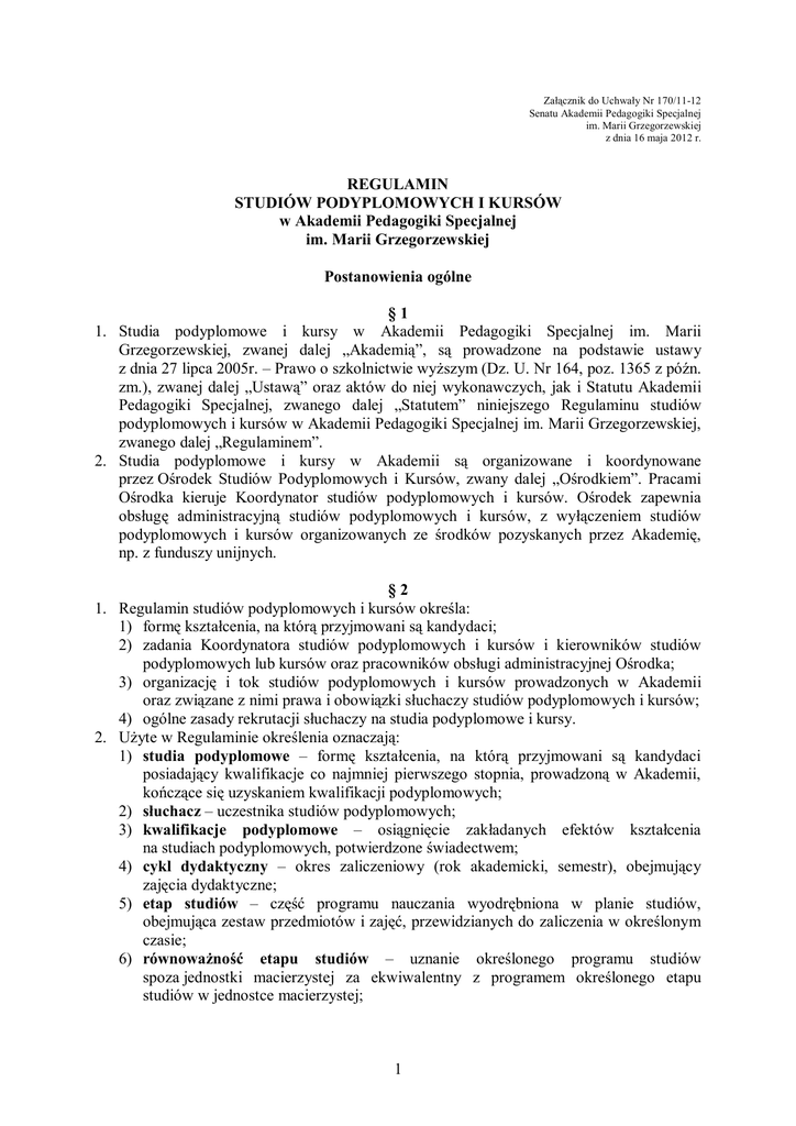 Załącznik do Uchwały Nr 170/11-12 Senatu Akademii Pedagogiki Specjalnej im. Marii Grzegorzewskiej z dnia 16 maja 2012 r. REGULAMIN STUDIÓW PODYPLOMOWYCH I KURSÓW w Akademii Pedagogiki Specjalnej im. Marii Grzegorzewskiej Postanowienia ogólne §1 1. Studia podyplomowe i kursy w Akademii Pedagogiki Specjalnej im. Marii Grzegorzewskiej, zwanej dalej „Akademią”, są prowadzone na podstawie ustawy z dnia 27 lipca 2005r. – Prawo o szkolnictwie wyższym (Dz. U. Nr 164, poz. 1365 z późn. zm.), zwanej dalej „Ustawą” oraz aktów do niej wykonawczych, jak i Statutu Akademii Pedagogiki Specjalnej, zwanego dalej „Statutem” niniejszego Regulaminu studiów podyplomowych i kursów w Akademii Pedagogiki Specjalnej im. Marii Grzegorzewskiej, zwanego dalej „Regulaminem”. 2. Studia podyplomowe i kursy w Akademii są organizowane i koordynowane przez Ośrodek Studiów Podyplomowych i Kursów, zwany dalej „Ośrodkiem”. Pracami Ośrodka kieruje Koordynator studiów podyplomowych i kursów. Ośrodek zapewnia obsługę administracyjną studiów podyplomowych i kursów, z wyłączeniem studiów podyplomowych i kursów organizowanych ze środków pozyskanych przez Akademię, np. z funduszy unijnych. §2 1. Regulamin studiów podyplomowych i kursów określa: 1) formę kształcenia, na którą przyjmowani są kandydaci; 2) zadania Koordynatora studiów podyplomowych i kursów i kierowników studiów podyplomowych lub kursów oraz pracowników obsługi administracyjnej Ośrodka; 3) organizację i tok studiów podyplomowych i kursów prowadzonych w Akademii oraz związane z nimi prawa i obowiązki słuchaczy studiów podyplomowych i kursów; 4) ogólne zasady rekrutacji słuchaczy na studia podyplomowe i kursy. 2. Użyte w Regulaminie określenia oznaczają: 1) studia podyplomowe – formę kształcenia, na którą przyjmowani są kandydaci posiadający kwalifikacje co najmniej pierwszego stopnia, prowadzoną w Akademii, kończące się uzyskaniem kwalifikacji podyplomowych; 2) słuchacz – uczestnika studiów podyplomowych; 3) kwalifikacje podyplomowe – osiągnięcie zakładanych efektów kształcenia na studiach podyplomowych, potwierdzone świadectwem; 4) cykl dydaktyczny – okres zaliczeniowy (rok akademicki, semestr), obejmujący zajęcia dydaktyczne; 5) etap studiów – część programu nauczania wyodrębniona w planie studiów, obejmująca zestaw przedmiotów i zajęć, przewidzianych do zaliczenia w określonym czasie; 6) równoważność etapu studiów – uznanie określonego programu studiów spoza jednostki macierzystej za ekwiwalentny z programem określonego etapu studiów w jednostce macierzystej; 1 7) Krajowe Ramy Kwalifikacji dla Szkolnictwa Wyższego – opis, przez określenie efektów kształcenia, kwalifikacji zdobywanych w polskim systemie szkolnictwa wyższego; 8) kwalifikacje – efekty kształcenia, poświadczone dyplomem, świadectwem, certyfikatem lub innym dokumentem wydanym przez uprawnioną instytucję potwierdzającym uzyskanie zakładanych efektów kształcenia; 9) efekty kształcenia – zasób wiedzy, umiejętności i kompetencji społecznych, uzyskanych w procesie kształcenia przez osobę uczącą się; 10) ECTS (European Credit Transfer and Accumulation System) – europejski system transferu i akumulacji punktów zaliczeniowych, służący do oceny postępów studenta w zdobywaniu wiedzy, umiejętności, kompetencji społecznych oraz do potwierdzania realizacji kolejnych etapów kształcenia; ECTS określa nakład pracy studenta, wymagany przy realizacji programu nauczania, powiązany z efektami uczenia się; 11) standardy kształcenia – zbiór reguł kształcenia na studiach przygotowujących do wykonywania zawodu nauczyciela oraz zawodów, dla których wymagania dotyczące procesu kształcenia i jego efektów są określone w przepisach prawa Unii Europejskiej; 12) program kształcenia – opis określonych przez Akademię spójnych efektów kształcenia dla studiów na określonym kierunku zgodny z Krajowymi Ramami Kwalifikacji dla Szkolnictwa Wyższego oraz opis procesu kształcenia w postaci programu studiów, prowadzącego do osiągnięcia tych efektów; 13) program studiów – dokument, na który składają się: moduły kształcenia (przedmiot lub grupa przedmiotów, specjalność, praktyki, seminarium) wraz z punktami ECTS; plan studiów; sposoby weryfikacji zakładanych efektów kształcenia; 14) plan studiów – dokument określający przedmioty i związane z nimi zajęcia wraz z ich wymiarem czasowym i zasadami zaliczania oraz przypisaną im liczbą punktów ECTS, których zaliczenie warunkuje uzyskanie świadectwa ukończenia danych studiów; plan studiów określa łączny czas trwania studiów i wyodrębnia etapy studiów oraz precyzuje wymagania, które trzeba spełnić, by zaliczyć każdy z tych etapów; plan studiów wymienia także inne wymagania, które muszą być spełnione, by uzyskać świadectwo ukończenia danych studiów; 15) studia kwalifikacyjne – studia nadające kwalifikacje, zgodne z określoną podstawą prawną, pozwalające m.in. słuchaczom na uzyskanie przygotowania pedagogicznego; 16) studia doskonalące – studia umożliwiające kształcenie nowych umiejętności niezbędnych na rynku pracy w systemie kształcenia ustawicznego; 17) kursy dokształcające – kursy umożliwiające kształcenie nowych umiejętności niezbędnych na rynku pracy w systemie uczenia się przez całe życie; 18) Uniwersytecki System Obsługi Studiów (USOS) - oprogramowanie do zarządzania i udostępniania danych związanych ze studiowaniem, służące wszystkim nauczycielom, studentom oraz administracji. USOS umożliwia jednoczesne ogarnięcie dydaktyki prowadzonej w całej Akademii; 19) Internetowa Rejestracja Kandydatów (IRK) – elektroniczna rejestracja kandydatów na studia; 20) Rada Wydziału Nauk Pedagogicznych – Rada dla studiów podyplomowych organizowanych na kierunkach: pedagogika, pedagogika specjalna, e