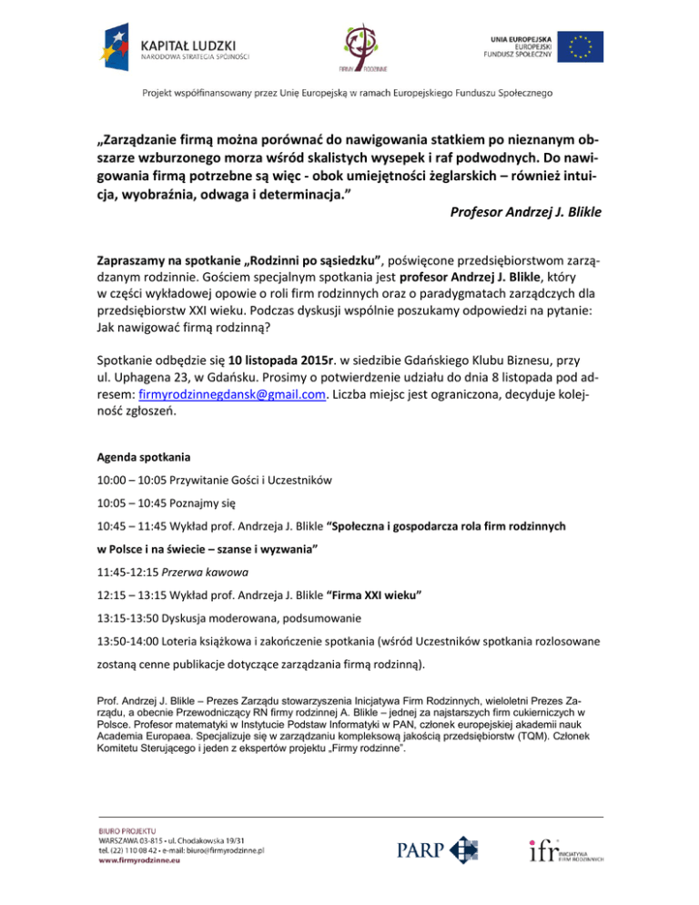 „Zarządzanie firmą można porównać do nawigowania statkiem po nieznanym obszarze wzburzonego morza wśród skalistych wysepek i raf podwodnych. Do nawigowania firmą potrzebne są więc - obok umiejętności żeglarskich – również intuicja, wyobraźnia, odwaga i determinacja.” Profesor Andrzej J. Blikle Zapraszamy na spotkanie „Rodzinni po sąsiedzku”, poświęcone przedsiębiorstwom zarządzanym rodzinnie. Gościem specjalnym spotkania jest profesor Andrzej J. Blikle, który w części wykładowej opowie o roli firm rodzinnych oraz o paradygmatach zarządczych dla przedsiębiorstw XXI wieku. Podczas dyskusji wspólnie poszukamy odpowiedzi na pytanie: Jak nawigować firmą rodzinną? Spotkanie odbędzie się 10 listopada 2015r. w siedzibie Gdańskiego Klubu Biznesu, przy ul. Uphagena 23, w Gdańsku. Prosimy o potwierdzenie udziału do dnia 8 listopada pod adresem: [email protected]. Liczba miejsc jest ograniczona, decyduje kolejność zgłoszeń. Agenda spotkania 10:00 – 10:05 Przywitanie Gości i Uczestników 10:05 – 10:45 Poznajmy się 10:45 – 11:45 Wykład prof. Andrzeja J. Blikle “Społeczna i gospodarcza rola firm rodzinnych w Polsce i na świecie – szanse i wyzwania” 11:45-12:15 Przerwa kawowa 12:15 – 13:15 Wykład prof. Andrzeja J. Blikle “Firma XXI wieku” 13:15-13:50 Dyskusja moderowana, podsumowanie 13:50-14:00 Loteria książkowa i zakończenie spotkania (wśród Uczestników spotkania rozlosowane zostaną cenne publikacje dotyczące zarządzania firmą rodzinną). Prof. Andrzej J. Blikle – Prezes Zarządu stowarzyszenia Inicjatywa Firm Rodzinnych, wieloletni Prezes Zarządu, a obecnie Przewodniczący RN firmy rodzinnej A. Blikle – jednej za najstarszych firm cukierniczych w Polsce. Profesor matematyki w Instytucie Podstaw Informatyki w PAN, członek europejskiej akademii nauk Academia Europaea. Specjalizuje się w zarządzaniu kompleksową jakością przedsiębiorstw (TQM). Członek Komitetu Sterującego i jeden z ekspertów projektu „Firmy rodzinne”.
