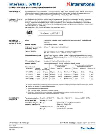 Interseal® 670HS Epoksyd tolerujący gorsze przygotowanie powierzchni OPIS PRODUKTU Dwuskładnikowa, grubopowłokowa, o niskiej zawartości LZO i dużej zawartości części stałych, renowacyjna farba epoksydowa tolerująca gorsze przygotowanie podłoża. Dostępna w wersji pigmentowanej aluminium, która zwiększa zdolność powłoki do ochrony przed korozją wykorzystując efekt barierowy. ZALECANY ZAKRES STOSOWANIA Do nakładania na różnorodne podłoża, jak stal skorodowana oczyszczona narzędziami ręcznymi, obrobiona strumieniowo-ściernie lub oczyszczona wodą pod bardzo wysokim ciśnieniem oraz stare powłoki w dobrej kondycji. Zapewnia doskonałą ochronę przed korozją konstrukcji przemysłowych na terenach nadmorskich, w zakładach papierniczych, mostach oraz konstrukcji przybrzeżnych, eksploatowanych zarówno w warunkach atmosferycznych, jak i pod wodą. Certyfikacja NSF dla zbiorników powyżej 100 galonów (378,5 l). Certyfikowany wg NSF/ANSI 61 INFORMACJE PRAKTYCZNE O INTERSEAL 670HS Kolor Dostępny w szerokiej gamie kolorystycznej włączając wersję pigmentowaną aluminium Poziom połysku Półpołysk (Aluminium - półmat) Objętościowa zawartość substancji stałych 82% ± 3% obj. (w zależności od koloru) Typowa grubość 100-250 mikronów (4-10 milicali) suchej powłoki odpowiada 122-305 mikronów (4.9-12.2 milicali) mokrej warstwy Wydajność teoretyczna 6.56 m2/l przy grubości powłoki 125 μm i powyższej zawartości części stałych 263 stopy kw./US galon przy grubości powłoki 5 milicali i powyższej zawartości części stałych Wydajność praktyczna Uwzględnić odpowiedni współczynnik strat Metoda aplikacji Natrysk bezpowietrzny, Natrysk powietrzny, Pędzel, Wałek Okres przemalowania tą samą farbą Czas schnięcia Temperatura Suchość dotykowa Pełne wyschnięcie Minimum Maksimum ● 10ºC (50ºF) 8 godz. 32 godz. 32 godz. 6 tyg. Maksimum † Okres przemalowania zalecaną warstwą nawierzchniową Maksimum ● Maksimum †# Przedłużony* 20 godz. 21 dn. 12 tyg. Minimum 15ºC (59ºF) 7 godz. 26 godz. 26 godz. 4 tyg. Przedłużony* 14 godz. 14 dn. 8 tyg. 25ºC (77ºF) 5 godz. 18 godz. 18 godz. 14 dn. Przedłużony* 10 godz. 7 dn. 4 tyg. 40ºC (104ºF) 2 godz. 6 godz. 6 godz. 7 dn. Przedłużony* 4 godz. 3 dn. 2 tyg. Dostępny jest specjalny utwardzacz do stosowania w niskiej temperaturze. Więcej informacji w części Charakterystyka produktu Dotyczy, gdy możliwa jest ekspozycja w zanurzeniu † Dotyczy tylko ekspozycji w atmosferze * Patrz „Definicje i skróty” International Protective Coatings # Maksymalny czas przemalowania jest krótszy, jeśli stosuje się polisiloksanowe powłoki nawierzchniowe. Więcej informacji można uzyskać w International Protective Coatings. DANE OBJĘTE PRZEPISAMI Temperatura zapłonu Składnik A 36°C (97°F) Ciężar właściwy Data wydania:28/10/2015 Dot.:2394 Mieszanina 33°C (91°F) 1.6 kg/l (13.3 lb/gal) Zawartość lotnych 114 g/kg związków organicznych Dyrektywa EU o Emisji Rozpuszczalników (Dyrektywa 1999/13/EC) 2.00 lb/gal (240 g/lt) EPA Metoda 24 151 g/lt Chińska Norma GB23985 Protective Coatings Strona 1 z 4 Składnik B 56°C (133°F) Produkt dostępny na całym świecie Interseal® 670HS Epoksyd tolerujący gorsze przygotowanie powierzchni PRZYGOTOWANIE POWIERZCHNI Trwałość zabezpieczenia zależy od stopnia przygotowania podłoża. Pokrywana powierzchnia musi być czysta, sucha i wolna od zanieczyszczeń. Przed nakładaniem powłoki cała powierzchnia powinna być oceniona i potraktowana zgodnie z wymaganiami normy ISO 8504:2000. Nagromadzony brud i rozpuszczalne sole muszą być usunięte. Zazwyczaj szczotkowanie na sucho szczotkami o twardym włosiu wystarcza do usunięcia brudu. Rozpuszczalne sole powinny być zmyte wodą słodką. Obróbka strumieniowo-ścierna Do eksploatacji w zanurzeniu Interseal 670HS musi być nakładany na powierzchnie obrobione strumieniowościernie do Sa2½ (ISO 8501-1:2007) lub SSPC-SP10. Przy ekspozycji w atmosferze najlepszą ochronę uzyskuje się, gdy Interseal 670HS jest nakładany na powierzchnie przygotowane do min. Sa2½ (ISO 8501-1:1988) lub SSPC-SP6. Wady podłoża ujawnione po obróbce strumieniowo-ściernej powinny być zeszlifowane, wypełnione lub naprawione w inny odpowiedni sposób. Zalecany profil powierzchni 50-75 μm (2-3 milicale). Przygotowanie narzędziami ręcznymi lub z napędem mechanicznym Czyszczenie narzędziami ręcznymi lub z napędem mechanicznym do stopnia minimum St 2 (ISO 8501-1:2007) lub SSPC-SP2. Zendra musi być całkowicie usunięta. Powierzchnie, których nie można oczyścić przez młotkowanie lub za pomocą młotka igłowego powinny być miejscowo obrobione strumieniowo-ściernie do stopnia minimum Sa 2 (ISO 8501-1:2007) lub SSPC-SP6. Najczęściej odnosi się to do powierzchni o stopniu skorodowania C, D. Czyszczenie wodą pod bardzo wysokim ciśnieniem / obróbka strumieniowo-ścierna na mokro Może być nakładany na powierzchnie przygotowane do Sa2½ (ISO 8501-1:2007) lub SSPC SP6, które pokryły się rdzą nalotową, ale nie bardziej niż do stopnia HB 2,5 M (wg International Hydroblasting Standards) lub stopnia SB 2,5 M (wg International Slurry Blasting Standards). W pewnych okolicznościach możliwe jest również nakładanie na wilgotną powierzchnię. Więcej informacji na ten temat można uzyskać w International Protective Coatings. Stare powłoki Interseal 670HS może być nakładany na niektóre stare powłoki o dobrej przyczepności do podłoża. Luźne lub łuszczące się powłoki powinny być usunięte do miejsca, gdzie są dobrze przyczepne. Powłoki z połyskiem mogą wymagać szorstkowania, aby poprawić przyczepność nakładanej powłoki. Więcej informacji w części: Charakterystyka produktu. APLIKACJA Materiał dostarczany jest w zestawie składającym się z dwu pojemników. Zawsze Mieszanie należy wymieszać oba pojemniki w dostarczonej proporcji. Wymieszany zestaw musi być zużyty w c