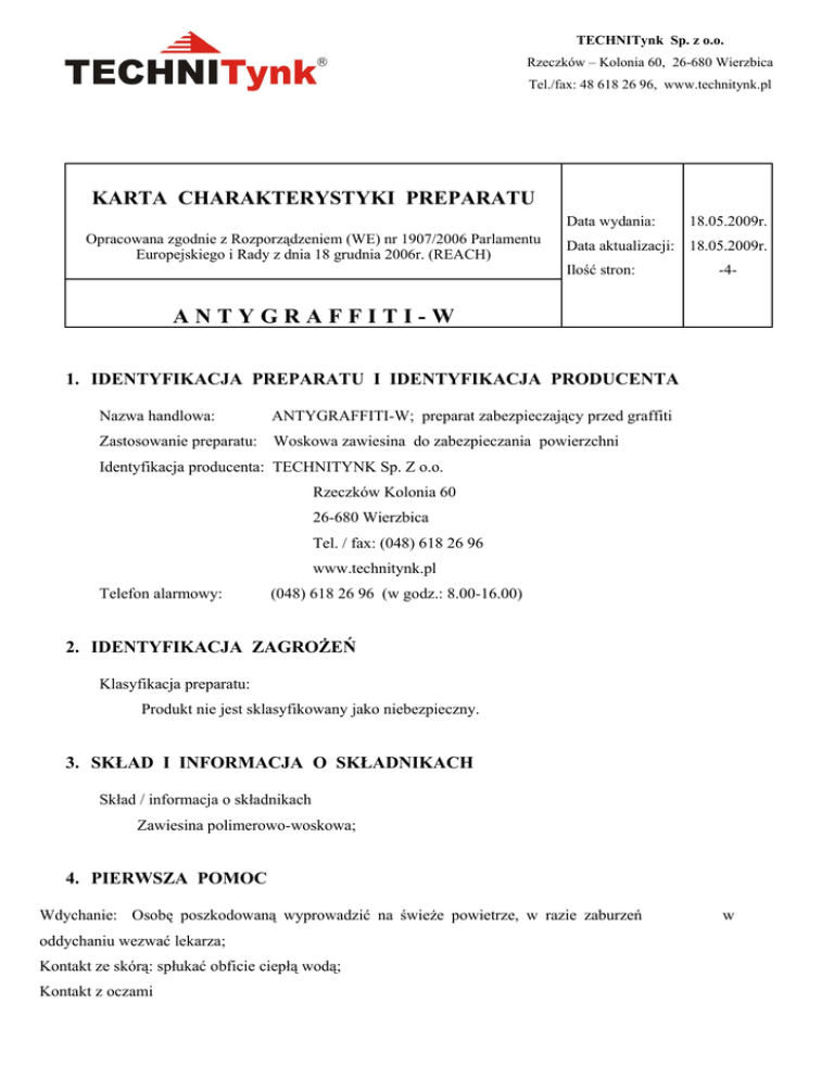 TECHNITynk Sp. z o.o. Rzeczków – Kolonia 60, 26-680 Wierzbica Tel./fax: 48 618 26 96, www.technitynk.pl KARTA CHARAKTERYSTYKI PREPARATU Data wydania: Opracowana zgodnie z Rozporządzeniem (WE) nr 1907/2006 Parlamentu Europejskiego i Rady z dnia 18 grudnia 2006r. (REACH) 18.05.2009r. Data aktualizacji: 18.05.2009r. Ilość stron: -4- ANTYGRAFFITI-W 1. IDENTYFIKACJA PREPARATU I IDENTYFIKACJA PRODUCENTA Nazwa handlowa: ANTYGRAFFITI-W; preparat zabezpieczający przed graffiti Zastosowanie preparatu: Woskowa zawiesina do zabezpieczania powierzchni Identyfikacja producenta: TECHNITYNK Sp. Z o.o. Rzeczków Kolonia 60 26-680 Wierzbica Tel. / fax: (048) 618 26 96 www.technitynk.pl Telefon alarmowy: (048) 618 26 96 (w godz.: 8.00-16.00) 2. IDENTYFIKACJA ZAGROŻEŃ Klasyfikacja preparatu: Produkt nie jest sklasyfikowany jako niebezpieczny. 3. SKŁAD I INFORMACJA O SKŁADNIKACH Skład / informacja o składnikach Zawiesina polimerowo-woskowa; 4. PIERWSZA POMOC Wdychanie: Osobę poszkodowaną wyprowadzić na świeże powietrze, w razie zaburzeń oddychaniu wezwać lekarza; Kontakt ze skórą: spłukać obficie ciepłą wodą; Kontakt z oczami w Natychmiast wypłukać oczy dużą ilością bieżącej wody, przez co najmniej 15minut, zasięgnąć porady okulisty; Spożycie Wypłukać jamę ustną wodą, nie wywoływać wymiotów celem uniknięcia przedostania się substancji do płuc; wypić 1-2 szklanki wody, konieczna konsultacja lekarska. 5. POSTĘPOWANIE W PRZYPADKU POŻARU Środki gaśnicze właściwe Stosować tradycyjne środki gaśnicze (proszki i piany gaśnicze, dwutlenek węgla, rozpylony strumień wody) w zależności od okoliczności pożaru; Środki ochrony indywidualnej dla strażaków Tradycyjne środki ochrony indywidualnej, maski ochronne, rękawice ochronne powlekane; 6. POSTĘPOWANIE W PRZYPADKU NIEZAMIERZONEGO UWOLNIENIA DO ŚRODOWISKA Indywidualne środki ostrożności Unikać kontaktu z oczami i skórą, rozlany produkt może tworzyć śliską powierzchnię, stosować odzież ochronną i okulary; Środki ostrożności w zakresie ochrony środowiska Zabezpieczyć przed dostaniem się do cieków wodnych, kanalizacji, ścieków. Metody oczyszczania Oczyszczać przy użyciu środków absorbujących (piasek, trociny, itp.); 7. POSTĘPOWANIE Z PREPARATEM I JEGO MAGAZYNOWANIE Postępowanie z preparatem Należy stosować podstawowe przepisy higieny i bezpieczeństwa pracy, unikać kontaktu z oczami i ze skórą; Magazynowanie Przechowywać w szczelnych opakowaniach, w suchym i chłodnym pomieszczeniu, w temperaturze od +5°C do +30°C. Nie dopuszczać do przegrzania i zamarznięcia; 8. KONTROLA NARAŻENIA I ŚRODKI OCHRONY INDYWIDUALNEJ Parametry kontroli narażeń : Wyrób nie wymaga specjalnego systemu zabezpieczeń. Osobiste wyposażenie ochronne Ochrona rąk: - rękawice ochronne. Myć ręce po zakończonej pracy; Ochrona oczu: - okulary ochronne, Ochrona skóry: - ubranie ochronne lub kombinezon ochronny; zdjąć poplamione ubranie 9. WŁAŚCIWOŚCI FIZYCZNE I CHEMICZNE Wygląd: ciecz o mlecznym zabarwieniu Zapach: charakterystyczny ok. 7,5-8,5 Palność: nie palny Ciężar właściwy: ok. 1,02 g/cm3 Rozpuszczalność: rozpuszczalny w wodzie 10. STABILNOŚĆ I REAKTYWNOŚĆ Warunki, których należy unikać: wysokie i niskie temperatury; Materiały, których należy unikać: nie dotyczy; Niebezpieczne produkty rozkładu: brak reakcji niebezpiecznych w przypadku prawidłowego przechowywania; 11. INFORMACJE TOKSYKOLOGICZNE Drogi i efekty narażeń Oddziaływanie na oczy: może powodować lekkie podrażnienie, Oddziaływanie na skórę: może powodować uczulenie w kontakcie ze skórą, Oddziaływanie na drogi oddechowe: nie dotyczy; 12. INFORMACJE EKOLOGICZNE Ekotoksyczność: nie dopuszczać do przedostania się produktu do otwartych zbiorników wodnych i ścieków, systemu kanalizacyjnego, 13. POSTĘPOWANIE Z ODPADAMI Usuwanie preparatu lub odpadu Produkt odpadowy musi być zebrany do pojemnika i przekazany uprawnionemu odbiorcy odpadów niebezpiecznych; Usuwanie opakowań Procedura usuwania tylko zgodnie z obowiązującymi przepisami (patrz punkt 15.2). Tylko puste opakowania ze śladami wyschniętego produktu mogą być poddane odzyskowi, zaleca się użycia wody jako środka czyszczącego, w razie konieczności dodatek środka czyszczącego; 14. INFORMACJE O TRANSPORCIE Produkt nie jest klasyfikowany jako niebezpieczny w świetle przepisów transportowych, nie podlega oznakowaniu w transporcie; Warunkiem jest prawidłowe przechowanie w szczelnie zamkniętych opakowaniach w temperaturze powyżej +5°C ; 15. INFORMACJE DOTYCZĄCE PRZEPISÓW PRAWNYCH Przepisy prawne na podstawie których została sporządzona niniejsza karta charakterystyki 5.2.1Dyrektywa UE Nr 67/548/EWG oraz Nr 1999/45/WE 5.2.2 Rozporządzenie Ministra Zdrowia z dnia 2 września 2003 r. w sprawie wykazu substancji i preparatów chemicznych wraz z ich klasyfikacją (Dz. U. Nr 199 poz. 1948 ), 5.2.3 Ustawa z 11 stycznia 2001 r. o substancjach i preparatach chemicznych ( Dz. U. Nr 11, poz. 84 z późniejszymi zmianami); 5.2.4 Ustawa z dnia 28 października 2002 r. o przewozie drogowym materiałów niebezpiecznych ( Dz. U. Nr 199, poz. 1671 ), 5.2.5 Rozporządzenie Ministra Pracy i Polityki Socjalnej z dnia 29 listopada 2002 r. w sprawie najwyższych stężeń i natężeń czynników szkodliwych dla zdrowia ( Dz. U Nr 217, poz. 1833 ); 5.2.6 Rozporządzenie Ministra Środowiska z dnia 27 września 2001 r. w sprawie katalogu odpadów ( Dz. U. Nr 112, poz. 1206 ), 16. INNE INFORMACJE Kartę charakterystyki sporządzono w oparciu o obowiązujące Rozporządzenie WE nr 1907/2006r. Dane techniczne zawarte w tej karcie nie są specyfikacją jakościową.