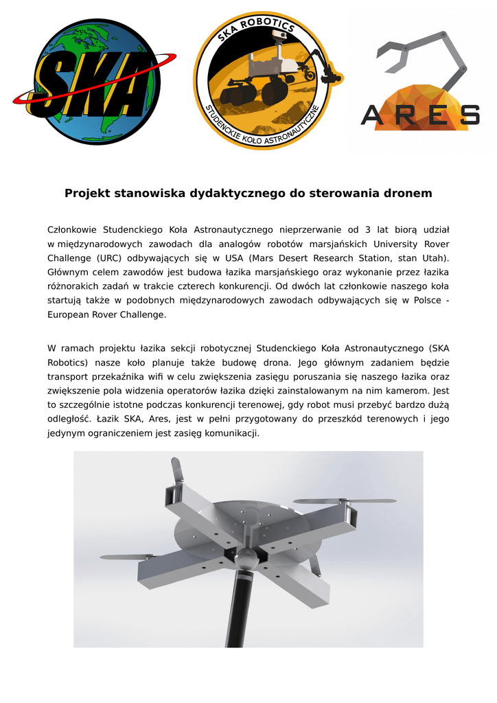 Projekt stanowiska dydaktycznego do sterowania dronem Członkowie Studenckiego Koła Astronautycznego nieprzerwanie od 3 lat biorą udział w międzynarodowych zawodach dla analogów robotów marsjańskich University Rover Challenge (URC) odbywających się w USA (Mars Desert Research Station, stan Utah). Głównym celem zawodów jest budowa łazika marsjańskiego oraz wykonanie przez łazika różnorakich zadań w trakcie czterech konkurencji. Od dwóch lat członkowie naszego koła startują także w podobnych międzynarodowych zawodach odbywających się w Polsce European Rover Challenge. W ramach projektu łazika sekcji robotycznej Studenckiego Koła Astronautycznego (SKA Robotics) nasze koło planuje także budowę drona. Jego głównym zadaniem będzie transport przekaźnika wifi w celu zwiększenia zasięgu poruszania się naszego łazika oraz zwiększenie pola widzenia operatorów łazika dzięki zainstalowanym na nim kamerom. Jest to szczególnie istotne podczas konkurencji terenowej, gdy robot musi przebyć bardzo dużą odległość. Łazik SKA, Ares, jest w pełni przygotowany do przeszkód terenowych i jego jedynym ograniczeniem jest zasięg komunikacji. W naszym kole nie mieliśmy do tej pory okazji budować maszyn takich jak dron. Co więcej, regulamin zawodów wymaga od nas, by dron startował i lądował na platformie mobilnej Aresa, co ze względu na delikatność innych podzespołów łazika wymaga od operatora bardzo dużej precyzji. Postanowiliśmy zaprojektować najpierw stanowisko do programowania elektroniki związanej ze sterowaniem dronem. Prosta i bezpieczna konstrukcja ma uzbroić nas w doświadczenie potrzebne do kolejnych etapów rozwoju projektu drona na potrzeby zawodów. Dodatkowo zapewnia ona możliwość dalszej ewolucji stacji, np. przez dodanie siłomierza w celu zbadania ciągu silników. Takie stanowisko może znaleźć również zastosowanie na piknikach przy prezentacji wpływu zmiany ciągu danego silnika na zachowanie drona w powietrzu, jak i przy pisaniu prac przejściowych lub dyplomowych z dziedziny bezzałogowych statków powietrznych. Naszym celem jest przetestowanie naszych rozwiązań i wyszkolenie operatora do września 2016 roku, kiedy nasz zespół będzie brał udział w zawodach European Rover Challenge 2016. W dalszej perspektywie doświadczenie zdobyte w trakcie zawodów i testów pozwoliłoby nam na pełen sukces wykorzystania drona w trakcie University Rover Challenge 2017.