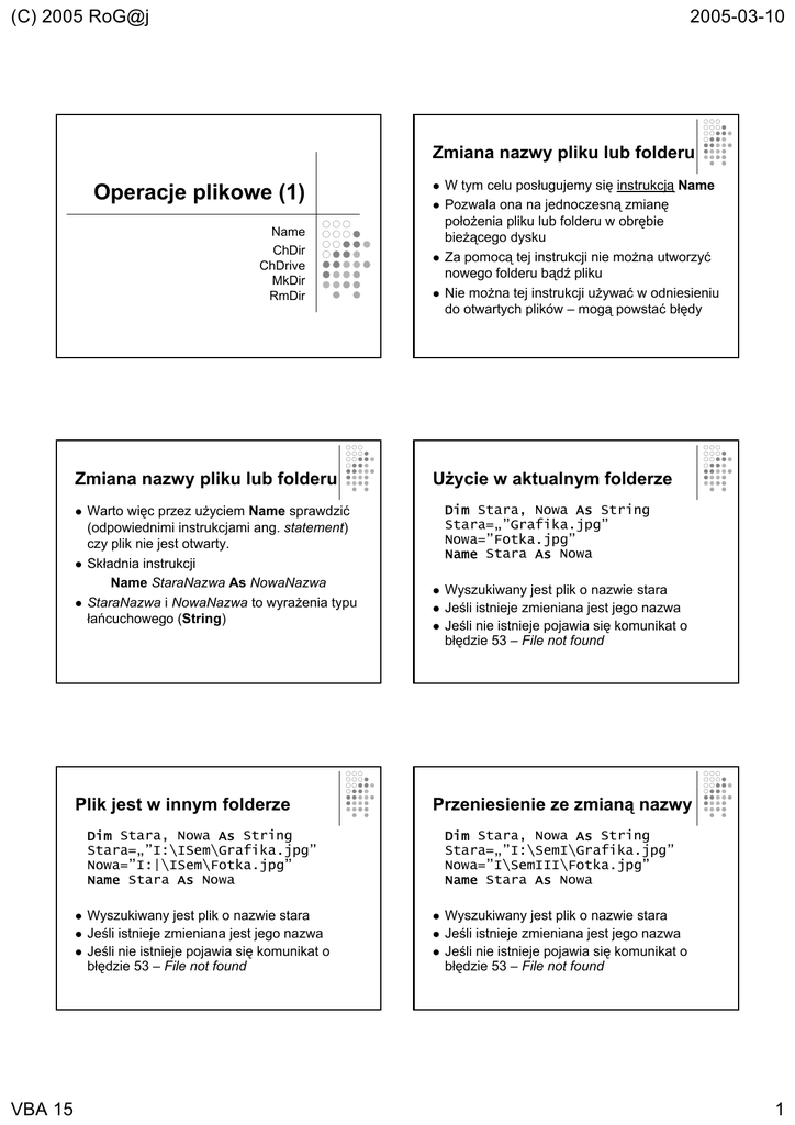 (C) 2005 RoG@j 2005-03-10 Zmiana nazwy pliku lub folderu Operacje plikowe (1) Name ChDir ChDrive MkDir RmDir Zmiana nazwy pliku lub folderu ! ! ! Warto więc przez użyciem Name sprawdzić (odpowiednimi instrukcjami ang. statement) czy plik nie jest otwarty. Składnia instrukcji Name StaraNazwa As NowaNazwa StaraNazwa i NowaNazwa to wyrażenia typu łańcuchowego (String) Plik jest w innym folderze ! ! ! ! Użycie w aktualnym folderze Dim Stara, Nowa As String Stara=„”Grafika.jpg” Nowa=”Fotka.jpg” Name Stara As Nowa ! ! ! ! ! VBA 15 Wyszukiwany jest plik o nazwie stara Jeśli istnieje zmieniana jest jego nazwa Jeśli nie istnieje pojawia się komunikat o błędzie 53 – File not found Wyszukiwany jest plik o nazwie stara Jeśli istnieje zmieniana jest jego nazwa Jeśli nie istnieje pojawia się komunikat o błędzie 53 – File not found Przeniesienie ze zmianą nazwy Dim Stara, Nowa As String Stara=„”I:\ISem\Grafika.jpg” Nowa=”I:|\ISem\Fotka.jpg” Name Stara As Nowa ! W tym celu posługujemy się instrukcją Name Pozwala ona na jednoczesną zmianę położenia pliku lub folderu w obrębie bieżącego dysku Za pomocą tej instrukcji nie można utworzyć nowego folderu bądź pliku Nie można tej instrukcji używać w odniesieniu do otwartych plików – mogą powstać błędy Dim Stara, Nowa As String Stara=„”I:\SemI\Grafika.jpg” Nowa=”I\SemIII\Fotka.jpg” Name Stara As Nowa ! ! ! Wyszukiwany jest plik o nazwie stara Jeśli istnieje zmieniana jest jego nazwa Jeśli nie istnieje pojawia się komunikat o błędzie 53 – File not found 1 (C) 2005 RoG@j 2005-03-10 Zmiana bieżącego folderu ! ! ! Wiele operacji plikowych wiąże się z koniecznością zmiany bieżącego folderu Bieżący katalog można zmienić za pomocą instrukcji ChDir (Change Directory) Instrukcja ta ma tylko jeden argument typu String – ścieżkę dostępu do katalogu Zmiana bieżącego folderu ! ! ! ! ! Argument może być podany jako łańcuch ChDir ”Dane\Arkusz” Argument może być zmienną Instrukcja ChDir nie zmienia dysku bieżącego Można jej jednak użyć do ustawienia folderu domyślnego na dysku innym niż bieżący ChDir NowaSciezka Zmiana bieżącego dysku ! ! Dysk bieżący zmieniamy za pomocą prostej instrukcji ChDrive (Change Drive) ChDrive Litera Dysku Argument LiteraDysku może zostać podany bezpośrednio jako jednoznakowy łańcuch w ”” lub z wykorzystaniem zmiennej typu String Tworzenie folderu (1) ! ! ! Tworzenie folderu (2) ! ! Można utworzyć nowy folder „zdalnie” podając jako argument pełną ścieżkę dostępu MkDir pozwala na utworzenie jedynie pojedynczego folderu – nie można utworzyć całej gałęzi folderów ! VBA 15 W tym celu należy używać instrukcji wielokrotnie Nowy folder można utworzyć za pomocą instrukcji MkDir (Make Directory) MkDir Sciezka Jeśli jako argument zostanie podana sama tylko nazwa folderu to nowy folder zostanie utworzony w bieżącym folderze na bieżącym dysku Gdy chcemy utworzyć folder na dysku, który nie jest bieżący nie wystarczy tylko ChDir Usunięcie folderu ! ! ! Folder można usunąć za pomocą instrukcji RmDir (Remove Directory) Argumentem jest ścieżka dostępu do usuwanego folderu RmDir Sciezka RmDir można używać jedynie w odniesieniu do pustych folderów 2