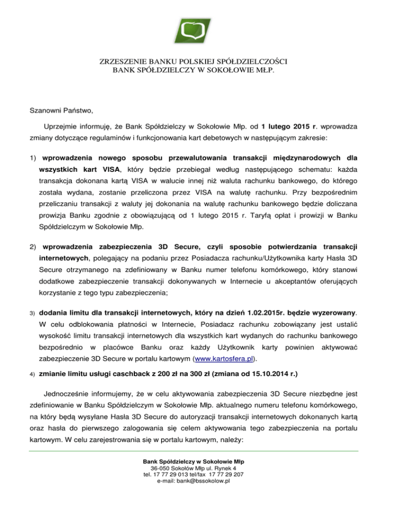 ZRZESZENIE BANKU POLSKIEJ SPÓŁDZIELCZOŚCI BANK SPÓŁDZIELCZY W SOKOŁOWIE MŁP. Szanowni Państwo, Uprzejmie informuję, że Bank Spółdzielczy w Sokołowie Młp. od 1 lutego 2015 r. wprowadza zmiany dotyczące regulaminów i funkcjonowania kart debetowych w następującym zakresie: 1) wprowadzenia nowego sposobu przewalutowania transakcji międzynarodowych dla wszystkich kart VISA, który będzie przebiegał według następującego schematu: każda transakcja dokonana kartą VISA w walucie innej niż waluta rachunku bankowego, do którego została wydana, zostanie przeliczona przez VISA na walutę rachunku. Przy bezpośrednim przeliczaniu transakcji z waluty jej dokonania na walutę rachunku bankowego będzie doliczana prowizja Banku zgodnie z obowiązującą od 1 lutego 2015 r. Taryfą opłat i prowizji w Banku Spółdzielczym w Sokołowie Młp. 2) wprowadzenia zabezpieczenia 3D Secure, czyli sposobie potwierdzania transakcji internetowych, polegający na podaniu przez Posiadacza rachunku/Użytkownika karty Hasła 3D Secure otrzymanego na zdefiniowany w Banku numer telefonu komórkowego, który stanowi dodatkowe zabezpieczenie transakcji dokonywanych w Internecie u akceptantów oferujących korzystanie z tego typu zabezpieczenia; 3) dodania limitu dla transakcji internetowych, który na dzień 1.02.2015r. będzie wyzerowany. W celu odblokowania płatności w Internecie, Posiadacz rachunku zobowiązany jest ustalić wysokość limitu transakcji internetowych dla wszystkich kart wydanych do rachunku bankowego bezpośrednio w placówce Banku oraz każdy Użytkownik karty powinien aktywować zabezpieczenie 3D Secure w portalu kartowym (www.kartosfera.pl). 4) zmianie limitu usługi caschback z 200 zł na 300 zł (zmiana od 15.10.2014 r.) Jednocześnie informujemy, że w celu aktywowania zabezpieczenia 3D Secure niezbędne jest zdefiniowanie w Banku Spółdzielczym w Sokołowie Młp. aktualnego numeru telefonu komórkowego, na który będą wysyłane Hasła 3D Secure do autoryzacji transakcji internetowych dokonanych kartą oraz hasła do pierwszego zalogowania się celem aktywowania tego zabezpieczenia na portalu kartowym. W celu zarejestrowania się w portalu kartowym, należy: Bank Spółdzielczy w Sokołowie Młp 36-050 Sokołów Młp ul. Rynek 4 tel. 17 77 29 013 tel/fax 17 77 29 207 e-mail: [email protected] 1) wejść na stronę internetową portalu kartowego www.kartosfera.pl; 2) podać numer PESEL 3) wpisać otrzymane na numer telefonu komórkowego hasło do pierwszego zalogowania się w portalu kartowym. Portal kartowy będzie dostępny dla Państwa od 1 lutego 2015r. i za jego pośrednictwem będą Państwo mogli dokonać następujących czynności: - aktywować zabezpieczenie 3D Secure, - zmieniać kod PIN, - zastrzegać kartę. O dodaniu kolejnych funkcjonalności w portalu będziemy Państwa informować na bieżąco. Wierzymy, że proponowane zmiany przyczynią się do wzrostu Państwa zadowolenia z naszych usług oraz bezpieczeństwa w przypadku płatności internetowych kartą. Z wyrazami szacunku Zarząd Banku Spółdzielczego w Sokołowie Młp.