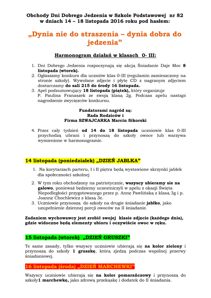 Obchody Dni Dobrego Jedzenia w Szkole Podstawowej nr 82 w dniach 14 – 18 listopada 2016 roku pod hasłem: „Dynia nie do straszenia – dynia dobra do jedzenia” Harmonogram działań w klasach 0- III: 1. Dni Dobrego Jedzenia rozpoczynają się akcją Śniadanie Daje Moc 8 listopada (wtorek). 2. Ogłaszamy konkurs dla uczniów klas 0-III (regulamin zamieszczony na stronie szkoły). Wywołane zdjęcie i płytę CD z nagranym zdjęciem dostarczamy do sali 215 do środy 16 listopada. 3. Apel podsumowujący 18 listopada (piątek), który organizuje P. Paulina Franaszek ze swoją klasą 2g. Podczas apelu nastąpi nagrodzenie zwycięzców konkursu. Fundatorami nagród są: Rada Rodziców i Firma SZWAJCARKA Marcin Sikorski 4. Przez cały tydzień od 14 do 18 listopada uczniowie klas 0-III przychodzą ubrani i przynoszą do szkoły owoce lub warzywa wymienione w harmonogramie. 14 listopada (poniedziałek) „DZIEŃ JABŁKA” 1. Na korytarzach parteru, I i II piętra będą wystawione skrzynki jabłek dla społeczności szkolnej 2. W tym roku obchodzony na patriotycznie, wszyscy ubieramy sie na galowo, ponieważ będziemy uczestniczyli w apelu z okazji Święta Niepodległości przygotowanego przez p. Annę Pawlińską z klasą 3g i p. Joannę Chochlewicz z klasą 3e. 3. Uczniowie przynoszą do szkoły na drugie śniadanie jabłko, jako uzupełnienie dziennej porcji owoców na II śniadanie. Zadaniem wychowawcy jest zrobić swojej klasie zdjęcie (każdego dnia), gdzie widoczne będą elementy ubioru i oczywiście owoc w ręku. 15 listopada (wtorek) „DZIEŃ GRUSZKI” Te same zasady, tylko wszyscy uczniowie ubierają się na kolor zielony i przynoszą do szkoły 1 gruszkę, którą zjedzą podczas wspólnej przerwy śniadaniowej. 16 listopada (środa) „DZIEŃ MARCHEWKI” Wszyscy uczniowie ubierają się na kolor pomarańczowy i przynoszą do szkoły1 marchewkę, jako zdrową przekąskę i dodatek do II śniadania. 17 listopada (czwartek) „DZIEŃ ŚLIWKI” Wszyscy uczniowie ubierają się na kolor fioletowy i przynoszą do szkoły śliwki jako uzupełnienie porcji owoców do II śniadania. 18 listopada (piątek) „DZIEŃ POMIDORKA” Wszyscy uczniowie ubierają się na kolor czerwony i przynoszą do szkoły 1 pomidora/pomidorki koktajlowe (każdy uczeń) porcja warzyw do II śniadania. Chętne klasy 0 i I, II, III przygotują kiermasz zdrowych potraw z dyni, jabłek i marchewki pod hasłem przewodnim: „Dynia nie do straszenia – dynia dobra do jedzenia” 17 listopada na korytarzu I pietra przy salach 104 i 103. Pierwsza zmiana klasy: „0”, 2c, 2b, 2i, 3g, 3c, 3h: od 9.50 do 10.35 Druga zmiana klasa 3e, 2h, 3f: od 12.45 do 13.30 Pozostałe klasy serdecznie zapraszamy do kupowania i smakowania Przygotowane potrawy będą sprzedawane od 1zł do 2zł. Zebrane pieniądze trafią do budżetu klasowego. Życzymy wszystkim wspaniałej i kreatywnej zabawy! Koordynator obchodów w ramach Realizacji Projektu SzPZ: Magda Orzoł- Długołęcka z Zespołem