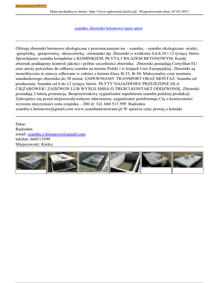 Dane pochodzą ze strony: http://www.ogloszenia-kielce.pl/. Wygenerowano dnia: 03-03-2017. szambo zbiorniki betonowe tanio atest Oferuję zbiorniki betonowe ekologiczne z przeznaczeniem na: - szambo, - szambo ekologiczne -ścieki, -gnojówkę, -gnojownicę, -deszczówkę, -ziemianki itp. Zbiorniki o wielkości 4,6,8,10 i 12 tysięcy litrów. Sprzedajemy szamba kompletne z KOMINKIEM, PŁYTĄ I WŁAZEM BETONOWYM. Każdy zbiornik poddajemy kontroli jakości i próbie szczelności zbiornika. Zbiorniki posiadają Certyfikat EU oraz atesty potrzebne do odbioru szamba na terenie Polski i w krajach Unii Europejskiej. Zbiorniki są monolityczne to znaczy odlewane w całości z betonu klasy B-25, B-30. Maksymalny czas montażu standardowego zbiornika do 30 minut. ZAPEWNIAMY TRANSPORT ORAZ MONTAŻ. Szamba od producenta. Szamba od 4 do 12 tysięcy litrów. PŁYTY NAJAZDOWE PRZEJEZDNE DLA CIĘŻARÓWEK! ZADZWOŃ LUB WYŚLIJ SMSA O TREŚCI KONTAKT ODDZWONIĘ. Zbiorniki posiadają 2-letnią gwarancję. Bezprzewodowy sygnalizator napełnienia szamba polskiej produkcji. Zabezpiecz się przed nieprzewidywalnym zdarzeniem, sygnalizator poinformuje Cię o konieczności wywozu nieczystości cena czujnika – 200 zł. Tel. 660 513 599 Radosław [email protected] www.szambaatestowane.pl W sprawie ceny proszę o kontakt Dane: Radosław email: [email protected] telefon: 660513599 Miejscowość: Kielce