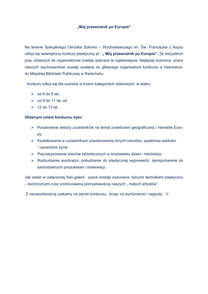 „Mój przewodnik po Europie” Na terenie Specjalnego Ośrodka Szkolno – Wychowawczego im. Św. Franciszka z Asyżu odbył się wewnętrzny konkurs plastyczny pt : „ Mój przewodnik po Europie”. Ze wszystkich prac oddanych do organizatorów zostały wybrane te najładniejsze. Najlepiej ocenione prace naszych wychowanków zostały wysłane do głównego organizatora konkursu a mianowice: do Miejskiej Biblioteki Publicznej w Radomsku. Konkurs odbył się dla uczniów w trzech kategoriach wiekowych: w wieku: od 6 do 8 lat, od 9 do 11 lat, od 12 do 13 lat. Głównym celem konkursu było: Poszerzenie wiedzy uczestników na temat przestrzeni geograficznej i narodów Europy; Kształtowania w uczestnikach poszanowania innych narodów, systemów wartości i sposobów życia; Popularyzowanie zbiorów bibliotecznych w środowisku dzieci i młodzieży; Rozbudzenie wyobraźni, pobudzenie do plastycznej wypowiedzi, zainspirowanie do samodzielnych poszukiwań i obserwacji. Jak widać w załączonej foto-galerii prace zostały wykonane różnymi technikami plastyczno – technicznymi oraz zróżnicowaną pomysłowością naszych „ małych artystów”. Z niecierpliwością czekamy na wyniki konkursu, licząc na wyróżnienie i nagrody . O to kilka wysłanych prac Praca wykonana przez uczennicę Małgorzatę Maruszewską Praca wykoanana przez uczennicę Anitę Rylską Praca wykonana przez ucznia Oskara Kwietnia Praca wykonana przez Weronikę Bielecką Opracowanie : Anna Piwnik Joanna Skrzydłowska