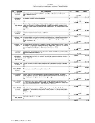Przedmiar Naprawy cząstkowe na połaciach dachowych Pałacu Młodzieży Lp. Podstawa 1 KNR 4-01 0420-01 2 KNR 4-01 0420-04 3 kalk. własna 4 KNR 2-02 0514-06 Opis i wyliczenia Wykonanie zastaw zabezpieczających - analogia - wygrodzenie strefy niebezpiecznej wokół budynku. 100 j.m. m Wykonanie daszków zabezpieczających. m2 40 m2 m Montaż słupków asekuracyjnych z punkrem zaczepowym - do asekuracji pracow- szt ników. (z wycięciem styropianu i izolacji aż do stabilnego podłoża i odtworzeniem kolejnych warstw izolacji) Wymagany atest wytrzymałości dla minimum dwóch pracowników 15 szt Obsadzenie wpustów dachowych z kołpakiem szt. 18 szt. 5 KNR-W 2-02 Pokrycie dachów papą termozgrzewalną jednowarstwowe (papa termozgrzewalna m2 0504-01 gr. minimum 5,2 mm SBS na osnowie z włukniny poliestrowej z gwarancją producenta minimum 10 lat) 150 m2 6 KNR-W 2-02 Pokrycie dachów papą termozgrzewalną - obróbki z papy nawierzchniowej (obrób- m2 0504-03 ki kominów i i koryt) (papa termozgrzewalna gr. minimum 5,2 mm SBS na osnowie z włukniny poliestrowej z gwarancją producenta minimum 10 lat) 170 m2 7 KNR 4-01 0530-06 Uzupełnienie obróbek blacharskich gzymsów i pasów elewacyjnych z blachy ocyn- m2 kowanej o szerokości ponad 25 cm 40 m2 8 KNR 4-01 Rozbiórka pokrycia z papy na dachach betonowych - pierwsza warstwa - powierz- m2 0519-06 z.sz. chnia do 25 m2 2.3. 9909-02 50 m2 9 KNR-W 4-01 Drobne naprawy pokrycia z papy polegające na umocowaniu pokrycia i zakitowa0518-01 niu 30 10 KNR 4-01 0534-07 11 KNR 2-02 0609-09 12 KNR 4-04 1101-02 13 KNR 4-04 1101-05 14 Poszcz Razem 100.000 RAZEM 100.000 40.000 RAZEM 40.000 15.000 RAZEM 15.000 18.000 RAZEM 18.000 150.000 RAZEM 150.000 170.000 RAZEM 170.000 40.000 RAZEM 40.000 50.000 RAZEM 50.000 30.000 RAZEM 30.000 100.000 RAZEM 100.000 15.000 RAZEM 15.000 3.000 RAZEM 3.000 3.000 RAZEM 3.000 3.000 RAZEM 3.000 m2 m2 Prowizoryczne zabezpieczenie połaci dachowych m2 100 m2 Izolacje cieplne i przeciwdźwiękowe z płyt styropianowych pionowe na lepiku z siatką metalową - analogia - styropian dwustronnie laminowany laminowany gr 10 cn - Wyrównanie styropapą uskoku murka ogniowego. 15 m2 m2 Wywiezienie gruzu z terenu rozbiórki przy ręcznym załadowaniu i wyładowaniu. m3 Transport gruzu samochodem ciężarowym skrzyniowym na odległość 1 km wraz z transportem technologicznym z dachu na miejsce załadunku 3 m3 Wywiezienie gruzu z terenu rozbiórki przy ręcznym za- i wyładunku. Nakłady uzu- m3 pełniające na każdy dalszy rozpoczęty km odległ. ponad 1km samochodem ciężarowym Krotność = 10 3 m3 Utylizacja odpadów, w tym papy m3 3 m3 kalk. własna Norma PRO Wersja 4.37a Nr seryjny: 28541