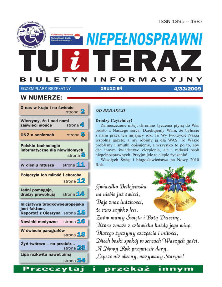 ISSN 1895 – 4987 NIEPEŁNOSPRAWNI TU i TERAZ B I U L E T Y N I N F O R M A C Y J N Y GRUDZIEŃ EGZEMPLARZ BEZPŁATNY 4/33/2009 W NUMERZE: O nas w kraju i na świecie strona 2 Wierzymy, że i nad nami zaświeci słońce strona 4 ONZ o seniorach 6 strona Polskie technologie informatyczne dla niewidomych strona 8 W cieniu ratusza strona 11 OD REDAKCJI Drodzy Czytelnicy! Zamieszczone niżej, skromne życzenia płyną do Was prosto z Naszego serca. Dziękujemy Wam, że byliście z nami przez ten mijający rok. To Wy tworzycie Naszą wspólną gazetę, a my robimy ją dla WAS. To Wasze problemy i smutki opisujemy, a wszystko to po to, aby dać innym świadectwo cierpienia, ale i radości osób niepełnosprawnych. Przyjmijcie te ciepłe życzenia! Wesołych Świąt i błogosławieństwa na Nowy 2010 Rok. Połączyła Ich miłość i choroba Jedni pomagają, drudzy prowokują strona 12 strona 14 Gwiazdka Betlejemska na niebie już świeci, Daje znać ludzkości, że czas szybko leci. Znów mamy Święta i Bożą Dziecinę, Która zmaże z człowieka każdą jego winę. Dlatego życzymy szczęścia i miłości, Niech boski spokój w sercach Waszych gości, A Nowy Rok przyniesie dary, Lepsze niż obecny, nazywany Starym! Inicjatywa Środkowoeuropejska jest faktem. Reportaż z Cieszyna strona 15 strona 16 W świecie paragrafów strona 18 Żyć twórczo – na przekór... strona 23 Nowinki medyczne Lipa rozkwita nawet zimą strona 24 Przeczytaj i przekaż innym O NAS W KRAJU I NA ŚWIECIE PARK ORIENTACJI PRZESTRZENNEJ W Specjalnym Ośrodku Szkolno-Wychowawczym dla Dzieci Niewidomych w Owińskach koło Poznania powstaje jedyny w Europie park orientacji przestrzennej, gdzie niewidome dzieci będą uczyły się samodzielnego poruszania w terenie. Zajmie powierzchnię ok. 2 ha na terenie ogrodu przylegającego do zabytkowego, barokowego zespołu budynków pocysterskich, w których mieści się ośrodek. Koszt inwestycji wyniesie około 5 mln zł. W parku znajdą się symulacje różnych zdarzeń i sytuacji. Trzeba będzie przykładowo poruszać się po różnych nawierzchniach, pokonywać krawężniki, przewidziano groty ciszy, kaskady, molo, plac zabaw i rozmaite przyrządy do ćwiczeń. Część uliczek zostanie podświetlona. Tworzona jest biblioteka dźwięków – sygnalizacja świetlna, autobus jadący w deszczu i w pogodny dzień, itp. Park ma zacząć działać za 3 lata. NASI PRZODKOWIE OPIEKOWALI SIĘ CHORYMI Naukowcy odnaleźli na stanowisku paleontologicznym Sima de los Huesos w Hiszpanii czaszkę dziecka z bardzo rzadką wadą wrodzoną charakteryzującą się spłaszczeniem głowy z tyłu i wybrzuszeniem za uchem u góry. Pochodzi sprzed 530 tys. lat. Jest to najstarszy dowód w ludzkiej ewolucji na wystąpienie tej patologii. Oznacza jednocześnie, że ówcześni ludzie nie eliminowali chorych, jak powszechnie się uważa, ale musieli opiekować się nimi. Dziecko zaś takie zapewne wymagało dodatkowej opieki w porównaniu ze zdrowymi rówieśnikami. WIDZIEĆ Z POMOCĄ JĘZYKA Naukowcy amerykańscy opracowali rewolucyjną technologię umożliwiającą częściowe przywrócenie niewidomym osobom wzroku za pomocą końcówek nerwowych języka. Teoretyczne jej podstawy powstały jeszcze w latach 60. Polegały na przypuszczeniu, że człowiek widzi nie oczami, lecz mózgiem. Wzrok służy tylko jako „dostawca” zewnętrznych sygnałów świetlnych. Przyrząd stworzony w USA to okulary, które wyławiają światło i przekazują informacje do specjalnego miniaturowego urządzenia. Przekształca ono fale świetlne w sygnały elektryczne, które cienkim kablem przepływają do języka. Został on wybrany jako kanał do przekazywania sygnałów do mózgu, gdyż jego zakończenia nerwowe są bardzo czułe i mogą przekazywać dużą ilość informacji. Tym samym język częściowo zastępuje 2 miliony nerwów wzrokowych, prowadzących z gałki ocznej człowieka do mózgu. W trakcie przeprowadzonych testów niewidomi mogli zobaczyć drzwi, przyciski w windzie do wjazdu na potrzebne piętro, a nawet litery. Na to, aby człowiek mógł nauczyć się widzieć za pomocą języka potrzeba około tygodnia. OPERA DLA NIEDOSŁYSZĄCYCH W Operze i Filharmonii Podlaskiej w Białymstoku zainstalowano specjalne słuchawki, które pozwalają 36 niedosłyszącym na uczestniczenie w koncertach. Mogą być wykorzystywane zarówno przez osoby posiadające aparaty słuchowe, jak i w pełni słyszące do tłumaczeń symultanicznych. Posłużą też niewidomym i niedowidzącym w czasie projekcji filmów z audiodeskrypcją, czyli lektorskim opisem tego, co dzieje się na ekranie. Docelowo Filharmonia chce zainstalować w swoich salach koncertowych sto takich słuchawek i nadajników. Opracował gel NIEPEŁNOSPRAWNI TU i TERAZ B I U L E T Y N I N F O R M A C Y J N Y egzemplarz bezpłatny DOFINANSOWANY ZE ŚŚRODKÓW PFRON DOFINANSO Wydawca: Karkonoski Sejmik Osób Niepełnosprawnych Partner: Stowarzyszenie „Działajmy Razem” – TRIANON PL w Cieszynie Redaktor naczelna: Justyna Bytnar, stale współpracują Andrzej Grzelak, Romuald Witczak, Krystyna Susabowska, Ryszard Chromik. Koordynator Projektu: Krystyna Ogrodnik-Turakiewicz. Adres wydawcy i redakcji: ul. Grabowskiego 7, 58-500 Jelenia Góra, tel.: 075 75 242 54, tel./fax 075 75 231 83, [email protected] • www.kson.pl Skład i druk: AD REM, 58-500 Jelenia Góra, ul. Okrzei 12 Nakład 3000 egz. 2 TU i TERAZ PERŁA ZACHODU wita niepełnosprawnych 13 listopada w Gościńcu „Perła Zachodu” odbyło się spotkanie przedstawicieli władz Powiatu Jeleniogórskiego, Karkonoskiego Parku Narodowego, Lasów Państwowych, Spółki Sudeckie Hotele i Schroniska PTTK oraz Karkonoskiego Sejmiku Osób Niepełnosprawnych poświęcone działaniom zmierzającym do udostępniania osobom niepełnosprawnym kolejnych atrakcyjnych miejsc w Karkonoszach i Kotlinie Jeleniogórskiej. Głównym celem spotkania było omówienie działań zmierzających do dostosowania obiektów t