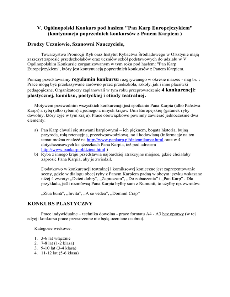 V. Ogólnopolski Konkurs pod hasłem "Pan Karp Europejczykiem" (kontynuacja poprzednich konkursów z Panem Karpiem ) Drodzy Uczniowie, Szanowni Nauczyciele, Towarzystwo Promocji Ryb oraz Instytut Rybactwa Śródlądowego w Olsztynie mają zaszczyt zaprosić przedszkolaków oraz uczniów szkół podstawowych do udziału w V Ogólnopolskim Konkursie zorganizowanym w tym roku pod hasłem: "Pan Karp Europejczykiem", który jest kontynuacją poprzednich konkursów z Panem Karpiem. Poniżej przedstawiamy regulamin konkursu rozgrywanego w okresie marzec - maj br. : Prace mogą być przekazywane zarówno przez przedszkola, szkoły, jak i inne placówki pedagogiczne. Organizatorzy zaplanowali w tym roku przeprowadzenie 4 konkurencji: plastycznej, komiksu, poetyckiej i etiudy teatralnej. Motywem przewodnim wszystkich konkurencji jest spotkanie Pana Karpia (albo Państwa Karpi) z rybą (albo rybami) z jednego z innych krajów Unii Europejskiej (gatunek ryby dowolny, który żyje w tym kraju). Prace obowiązkowo powinny zawierać jednocześnie dwa elementy: a) Pan Karp chwali się stawami karpiowymi – ich pięknem, bogatą historią, bujną przyrodą, rolą retencyjną, przeciwpowodziową, no i hodowlaną (informacje na ten temat można znaleźć na http://www.pankarp.pl/dziennikarze.html oraz w 4 dotychczasowych książeczkach Pana Karpia, też pod adresem http://www.pankarp.pl/dzieci.html ) b) Ryba z innego kraju przedstawia najbardziej atrakcyjne miejsce, gdzie chciałaby zaprosić Pana Karpia, aby je zwiedził. Dodatkowo w konkurencji teatralnej i komiksowej konieczne jest zaprezentowanie sceny, gdzie w dialogu obcej ryby z Panem Karpiem padną w obcym języku wskazane niżej 4 zwroty: „Dzień dobry”, „Zapraszam”, „Do zobaczenia” i „Pan Karp” . Dla przykładu, jeśli rozmówcą Pana Karpia byłby sum z Rumunii, to użyłby np. zwrotów: „Ziua bună”, „Invita”, „A se vedea”, „Domnul Crap” KONKURS PLASTYCZNY Prace indywidualne – technika dowolna - prace formatu A4 - A3 bez oprawy (w tej edycji konkursu prace przestrzenne nie będą oceniane osobno). Kategorie wiekowe: 1. 2. 3. 4. 3-6 lat włącznie 7-8 lat (1-2 klasa) 9-10 lat (3-4 klasa) 11-12 lat (5-6 klasa) KOMIKS Prace indywidualne – historyjki obrazkowe niezależnie od ich liczby powinny się zmieścić na jednej kartce formatu A4-A3 – bez oprawy. Kategorie wiekowe: 9 – 10 lat 11 – 12 lat KONKURS POETYCKI Wiersze zaopatrzone w rymy, składające się maksymalnie z 24 wersów i zawsze posiadające wątek reklamowania karpiowych stawów i wątek zachęcania Pana Karpia przez obcą rybę do odwiedzenia jej kraju (np. Rumunii). Przykładowy początek: Witaj sumie nasz z Rumunii, Miło widzieć gościa z Unii, Dziś pokażę Ci jak w stawie Życie płynie na zabawie. Ciąg dalszy… Panie Karpiu u nas w sumie, Każdy sum Ci wskazać umie, Że na całej ziemskiej kuli, Nie ma to jak u Drakuli… W Transylwanii w jego zamku, Cisza szepce o poranku, Wcześniej nocą coś tam wyje, Duch Drakuli zęby myje… Kategoria wiekowa – szkoła podstawowa ETIUDY TEATRALNE – zespołowe – na płytach DVD Czas trwania etiudy do 10 minut Kategoria wiekowa - szkoła podstawowa Udział w konkursie jest bezpłatny. Aby wziąć udział w konkursie, przedszkole, szkoła lub placówka pedagogiczna powinna przesłać: 1. Maksymalnie po 10 prac plastycznych z każdej ww. kategorii wiekowej w technice dowolnej i formacie A4-A3 bez oprawy. 2. Maksymalnie 10 prac komiksowych (każda na 1 kartce A4-A3, bez oprawy) 3. Dowolną liczbę przedstawień teatralnych nagranych na płytach w formacie DVD (każda inna technika z powodów technicznych może utrudnić lub uniemożliwić ocenianie) Uwaga: 1. Każda szkoła lub placówka oświatowa może wziąć udział we wszystkich konkurencjach! 2. Każda praca powinna być: a) podpisana imieniem i nazwiskiem dziecka i numerem klasy, do której uczęszcza lub w przypadku prac zbiorowych podpisana nazwą klasy, szkoły, placówki. b) oznaczona wyraźną pieczątką szkoły z adresem i telefonem, c) zaopatrzona w kontakt do osoby odpowiedzialnej w danej placówce, w tym adres elektroniczny. Prace bez danych z pkt. a) i pkt. b) nie będą klasyfikowane! Początek konkursu – 28 marca. Termin nadsyłania prac 21 maja br. - decyduje data stempla pocztowego (sugerowana forma korespondencji - priorytet). Rozstrzygnięcie konkursu nastąpi do 11 czerwca br. Nagrody - Przewidujemy nagrodzenie: 1. Dyplomem i książką każdej szkoły i placówki pedagogicznej, której uczniowie wezmą udział w konkursie. 2. Książkami i dyplomami indywidualnymi uczniów wyróżnionych w konkurencji plastycznej i komiksów. 3. Dyplomami drużynowymi i książkami w konkurencji teatralnej – dla członków wyróżnionych zespołów teatralnych. 4. Laureatów poszczególnych konkursów we wszystkich kategoriach wiekowych – zaproszeniem we wrześniu br. na Galę Finałową, a tam nagrodzenie sprzętem elektronicznym i książkami. 5. Zaproszeniem wybranego zespołu teatralnego na spotkanie przedstawicieli Unii Europejskiej we wrześniu 2011 roku (prawdopodobnie do Kazimierza Dolnego nad Wisłą) Adres do korespondencji: Konkurs „Pan Karp Europejczykiem” – Klub Kultury „MARYSIN”, ul. Korkowa 96; 04-519 Warszawa. Serwis konkursu wraz ze szczegółowym regulaminem i aktualnościami podczas jego trwania będzie prowadzony na stronie http://www.pankarp.pl/konkursy.html od dnia 28.03.br. Kierownik konkursu - Zbigniew Szczepański (e-mail [email protected] ; tel. 501 046 324)