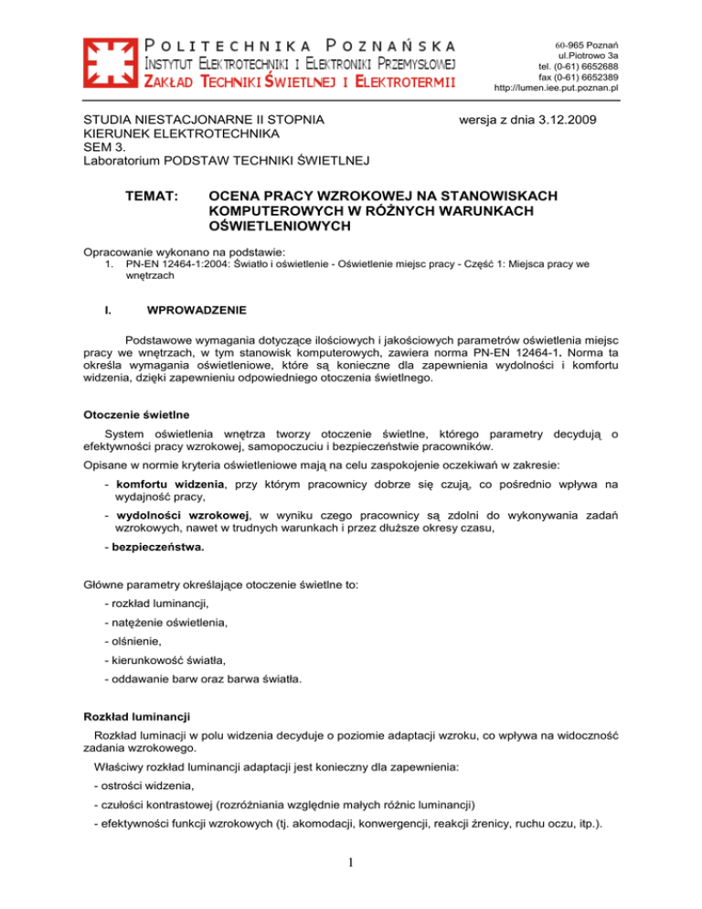 60-965 Poznań ul.Piotrowo 3a tel. (0-61) 6652688 fax (0-61) 6652389 http://lumen.iee.put.poznan.pl STUDIA NIESTACJONARNE II STOPNIA KIERUNEK ELEKTROTECHNIKA SEM 3. Laboratorium PODSTAW TECHNIKI ŚWIETLNEJ TEMAT: wersja z dnia 3.12.2009 OCENA PRACY WZROKOWEJ NA STANOWISKACH KOMPUTEROWYCH W RÓśNYCH WARUNKACH OŚWIETLENIOWYCH Opracowanie wykonano na podstawie: 1. I. PN-EN 12464-1:2004: Światło i oświetlenie - Oświetlenie miejsc pracy - Część 1: Miejsca pracy we wnętrzach WPROWADZENIE Podstawowe wymagania dotyczące ilościowych i jakościowych parametrów oświetlenia miejsc pracy we wnętrzach, w tym stanowisk komputerowych, zawiera norma PN-EN 12464-1. Norma ta określa wymagania oświetleniowe, które są konieczne dla zapewnienia wydolności i komfortu widzenia, dzięki zapewnieniu odpowiedniego otoczenia świetlnego. Otoczenie świetlne System oświetlenia wnętrza tworzy otoczenie świetlne, którego parametry decydują o efektywności pracy wzrokowej, samopoczuciu i bezpieczeństwie pracowników. Opisane w normie kryteria oświetleniowe mają na celu zaspokojenie oczekiwań w zakresie: - komfortu widzenia, przy którym pracownicy dobrze się czują, co pośrednio wpływa na wydajność pracy, - wydolności wzrokowej, w wyniku czego pracownicy są zdolni do wykonywania zadań wzrokowych, nawet w trudnych warunkach i przez dłuŜsze okresy czasu, - bezpieczeństwa. Główne parametry określające otoczenie świetlne to: - rozkład luminancji, - natęŜenie oświetlenia, - olśnienie, - kierunkowość światła, - oddawanie barw oraz barwa światła. Rozkład luminancji Rozkład luminacji w polu widzenia decyduje o poziomie adaptacji wzroku, co wpływa na widoczność zadania wzrokowego. Właściwy rozkład luminancji adaptacji jest konieczny dla zapewnienia: - ostrości widzenia, - czułości kontrastowej (rozróŜniania względnie małych róŜnic luminancji) - efektywności funkcji wzrokowych (tj. akomodacji, konwergencji, reakcji źrenicy, ruchu oczu, itp.). 1 60-965 Poznań ul.Piotrowo 3a tel. (0-61) 6652688 fax (0-61) 6652389 http://lumen.iee.put.poznan.pl Rozkład luminancji w polu widzenia wpływa równieŜ na komfort widzenia. NaleŜy unikać: - zbyt wysokich luminancji, które mogą powodować olśnienie, - zbyt duŜych kontrastów luminancji, które powodują zmęczenie związane z ciągłą readaptacją wzroku, - zbyt niskich luminancji i zbyt małych kontrastów luminancji związanych z nieciekawym, nie stymulującym środowiskiem pracy. NatęŜenie oświetlenia Poziom i rozkład natęŜenia oświetlenia w polu pracy wzrokowej i w strefie otaczającej ma duŜy wpływ na szybkość, bezpieczeństwo i wygodę widzenia oraz łatwość wykonania zadania wzrokowego. Wszystkie wartości natęŜenia oświetlenia wyszczególnione w tej normie są wartościami eksploatacyjnymi (maintained illuminances) dostosowanymi do wymagań związanych z komfortem widzenia i wydolnością wzrokową. Tab.1. Wymagania dla pomieszczeń biurowych Lp. 1. 2. 3. 4. 5. 6. Rodzaj wnętrza, zadania lub czynności Segregowanie, kopiowanie itp Pisanie ręczne, czytanie, przetwarzanie danych Kreślenie techniczne Stanowiska pracy CAD Pokoje spotkań konferencji Recepcja i Em lx 300 UGR Ra 19 80 500 19 80 750 500 500 16 19 19 80 80 80 300 22 80 Uwagi Praca z DSE Praca z DSE Oświetlenie powinno być regulowane Wartości eksploatacyjne natęŜenia oświetlenia zestawione w tabeli 1 dotyczą zadań wzrokowych wykonywanych na poziomych, pionowych lub ukośnych płaszczyznach roboczych. Średnie wartości natęŜenia oświetlenia nie powinny być mniejsze od podanych wartości bez względu na wiek i stan instalacji. Podane wartości odpowiadają normalnym warunkom widzenia i uwzględniają: - psychofizjologiczne aspekty takie jak wygoda widzenia i dobre samopoczucie, - wymagania związane z zadaniem wzrokowym, - ergonomię widzenia, - doświadczenia praktyczne, - bezpieczeństwo, - ekonomikę. Wartość natęŜenia oświetlenia moŜna przyjąć, o co najmniej stopień wyŜszą w podanej skali, jeśli warunki widzenia róŜnią się od przyjętych w normalnych ocenach. NatęŜenie oświetlenia w bezpośrednim otoczeniu Poziom natęŜenia oświetlenia w bezpośrednim otoczeniu pola pracy powinien być dostosowany do natęŜenia oświetlenia pola pracy i powinien zapewnić zrównowaŜony rozkład luminancji w polu widzenia. 2 60-965 Poznań ul.Piotrowo 3a tel. (0-61) 6652688 fax (0-61) 6652389 http://lumen.iee.put.poznan.pl Znaczne róŜnice w przestrzennym rozkładzie natęŜenia oświetlenia wokół pola pracy mogą prowadzić do zmęczenia wzroku i odczuwania dyskomfortu. NatęŜenie oświetlenia w bezpośrednim otoczeniu pola pracy powinno być niŜsze niŜ natęŜenie oświetlenia pola pracy, ale nie mniejsze od wartości podanych w tabeli 2. Tab. 2. Równomierności oświetlenia oraz zalecane poziomy natęŜenia oświetlenia pola otaczającego w zaleŜności od natęŜenia oświetlenia pola pracy NatęŜenie oświetlenia pola pracy NatęŜenie oświetlenia otoczenia pola pracy lx lx ≥ 750 500 500 300 300 200 ≤200 Epola pracy Równomierność ≥ 0,7 Równomierność ≥ 0,5 Równomierność Oświetlenie pola pracy powinno być moŜliwie jak najbardziej równomierne. Równomierność oświetlenia pola pracy i jego otoczenia nie powinna być niŜsza od wartości podanych w tablicy 2 Olśnienie Jaskrawe źródła światła mogą powodować olśnienie i pogarszać widoczność. NaleŜy tego unikać np. przez odpowiednie osłanianie lamp lub zasłanianie okien. Odbicia dekontrastujące (zamgleniowe) i olśnienie odbiciowe Jaskrawe odbicia w przedmiocie pracy wzrokowej mogą zmienić widoczność zadania wzrokowego, zwykle je pogarszając. Odbiciom dekontrastującym i olśnieniu odbiciowemu moŜna zapobiegać lub je redukować przez: - odpowiednie wzajemne usytuowanie opraw i stanowisk pracy, - wykończenie powierzchni (powierzchnie matowe), - ograniczenie luminancji opraw, - zwiększenie świecącej