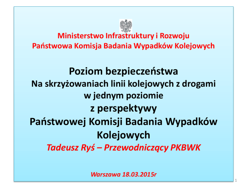 Ministerstwo Infrastruktury i Rozwoju Państwowa Komisja Badania Wypadków Kolejowych Poziom bezpieczeństwa Na skrzyżowaniach linii kolejowych z drogami w jednym poziomie z perspektywy Państwowej Komisji Badania Wypadków Kolejowych Tadeusz Ryś – Przewodniczący PKBWK Warszawa 18.03.2015r 1 Rola PKBWK • Komisja realizuje swoje zadania w imieniu Ministra właściwego do spraw transportu. Prowadzi ona postępowanie po każdym poważnym wypadku na sieci kolejowej mającym oczywisty negatywny wpływ na regulacje bezpieczeństwa kolei lub na zarządzanie bezpieczeństwem, z wyłączeniem najechania pojazdu kolejowego na osoby podczas przechodzenia przez tory. • W ramach swojej działalności Komisja prowadzi lub nadzoruje dochodzenia, których celem jest ustalenie przyczyn, okoliczności zdarzeń jak również określenie wniosków zapobiegawczych. Komisja może również prowadzić postępowanie w odniesieniu do wypadków lub incydentów, które w nieznacznie różniących się warunkach byłyby poważnymi wypadkami powodującymi zaprzestanie funkcjonowania podsystemów strukturalnych lub składników interoperacyjności transeuropejskiego systemu kolei dużych prędkości transeuropejskiego systemu kolei konwencjonalnej. Decyzję dotyczącą podjęcia postępowania przez Komisję podejmuje jej Przewodniczący w ciągu tygodnia od dnia uzyskania informacji o poważnym wypadku, wypadku lub incydencie kolejowym na podstawie otrzymanego protokółu oględzin miejsca wypadku lub ustaleń końcowych. Podjęcie decyzji przez Przewodniczącego o wszczęciu postępowania może nastąpić również na wniosek podmiotu związanego z zaistniałym zdarzeniem (Art. 28e ust3 pkt4) Państwowa Komisja Badania Wypadków Kolejowych 2 Rola PKBWK • Przewodniczący Komisji prowadzi również nadzór nad pracami komisji kolejowych badających zaistniałe zdarzenia. Komisje kolejowe mają obowiązek zakończyć postępowanie w ciągu 30 dni roboczych od zaistnienia zdarzenia. Przewodniczący Komisji ma prawo do prolongaty terminu zakończenia dochodzenia o maksymalnie 5 miesięcy na pisemne wystąpienie przewodniczącego komisji kolejowej. W ramach nadzoru nad pracami komisji kolejowych, członkowie stali i doraźni Komisji mogą uczestniczyć w pracach tych komisji. Członkowie Komisji mogą również być wyznaczeni przez Przewodniczącego Komisji do przewodniczenia każdej komisji kolejowej. W spornych przypadkach, Przewodniczący Komisji ma prawo do powołania nowego składu komisji kolejowej. Po zakończeniu każdego postępowania Komisja dokonuje analizy protokołów ustaleń końcowych otrzymanych od komisji kolejowych badających wypadki lub incydenty kolejowe. • Wg stanu na dzień 31.12.2014 r. w skład Komisji wchodziło 4 członków stałych oraz zatrudniony był 1 pracownik obsługi komisji prowadzący sprawy administracyjnobiurowe i sekretariat Przewodniczącego Komisji. Komisja ma swoją siedzibę w Ministerstwie Infrastruktury i Rozwoju j w Warszawie. W razie wystąpienia zdarzenia Komisja może zatrudniać tzw. członków doraźnych umieszczonych na Liście Ministra. Państwowa Komisja Badania Wypadków Kolejowych 3 Trendy 2013 - 2014 • Znaczące zmniejszenie ogólnej liczby wypadków na przejazdach w 2014 r. w stosunku do 2013 r. – spadek o 18%; spadek liczby wypadków dotyczy przejazdów kat. A,B i D; • Wzrost liczby wypadków na przejazdach kat. C o ponad 20%. Państwowa Komisja Badania Wypadków Kolejowych 4 Liczba Wypadki na przejazdach 2010 - 2014 180 160 140 120 100 80 60 40 20 0 Przejazdy publiczne kat. A Przejazdy publiczne kat. B Przejazdy publiczne kat. C Przejazdy publiczne kat. D 2010 2011 2012 22 6 9 16 19 16 62 39 46 167 149 156 2013 9 5 15 11 33 40 166 131 2014 Państwowa Komisja Badania Wypadków Kolejowych 5 Przejazdy kolejowe Dz.U.96.33.144 2000.12.06 zm. Dz.U.00.100.1082 § 1 ROZPORZĄDZENIE MINISTRA TRANSPORTU I GOSPODARKI MORSKIEJ z dnia 26 lutego 1996 r. w sprawie warunków technicznych, jakim powinny odpowiadać skrzyżowania linii kolejowych z drogami publicznymi i ich usytuowanie. (Dz. U. z dnia 20 marca 1996 r.) Na podstawie art. 7 ust. 2 pkt 2 ustawy z dnia 7 lipca 1994 r. - Prawo budowlane (Dz. U. Nr 89, poz. 414) oraz art. 6 ustawy z dnia 2 grudnia 1960 r. o kolejach (Dz. U. z 1989 r. Nr 52, poz. 310, z 1990 r. Nr 34, poz. 198 i z 1991 r. Nr 107, poz. 462) zarządza się, co następuje: § 8. • Projekty skrzyżowań linii kolei użytku publicznego z drogami powinny być zatwierdzone przez zarząd drogi i zarząd kolei, a projekty skrzyżowań linii kolei użytku niepublicznego z drogami - ponadto przez właściwą miejscowo dyrekcję okręgową kolei państwowych. Państwowa Komisja Badania Wypadków Kolejowych - NIB POLAND 7 § 22. • 1. Ustalenie sposobu zabezpieczenia nowego przejazdu lub przejścia użytku publicznego, zmiana sposobu istniejącego zabezpieczenia, z wyjątkiem przypadków określonych w ust. 4-6 i 8, ustalenie kategorii przejazdu, zlikwidowanie przejazdu lub przejścia użytku publicznego oraz ustalenie warunków ich widoczności powinny być dokonywane w terenie przez zarząd kolei w porozumieniu z właściwym zarządem drogi i komendantem wojewódzkim Policji, a w odniesieniu do przejazdów i przejść na liniach kolei użytku niepublicznego ponadto w porozumieniu z właściwą miejscowo dyrekcją okręgową kolei państwowych. Ustalenia te powinny być zawarte w dokumentacji (metryce) przejazdu lub przejścia. Państwowa Komisja Badania Wypadków Kolejowych - NIB POLAND 8 § 22. • • • • • 8. W przypadku braku dróżników przejazdowych do strzeżenia przejazdów kategorii A przez okres dłuższy niż 7 dni lub niemożności zorganizowania strzeżenia przejazdów kategorii B lub C z uszkodzoną samoczynną sygnalizacją świetlną, której naprawa nie może być dokonana w terminie 7 dni: 1) znak drogowy "Przejazd kolejowy z zaporami" zostanie zmieniony na znak drogowy "Przejazd kolejowy bez zapór" i przed przejaz