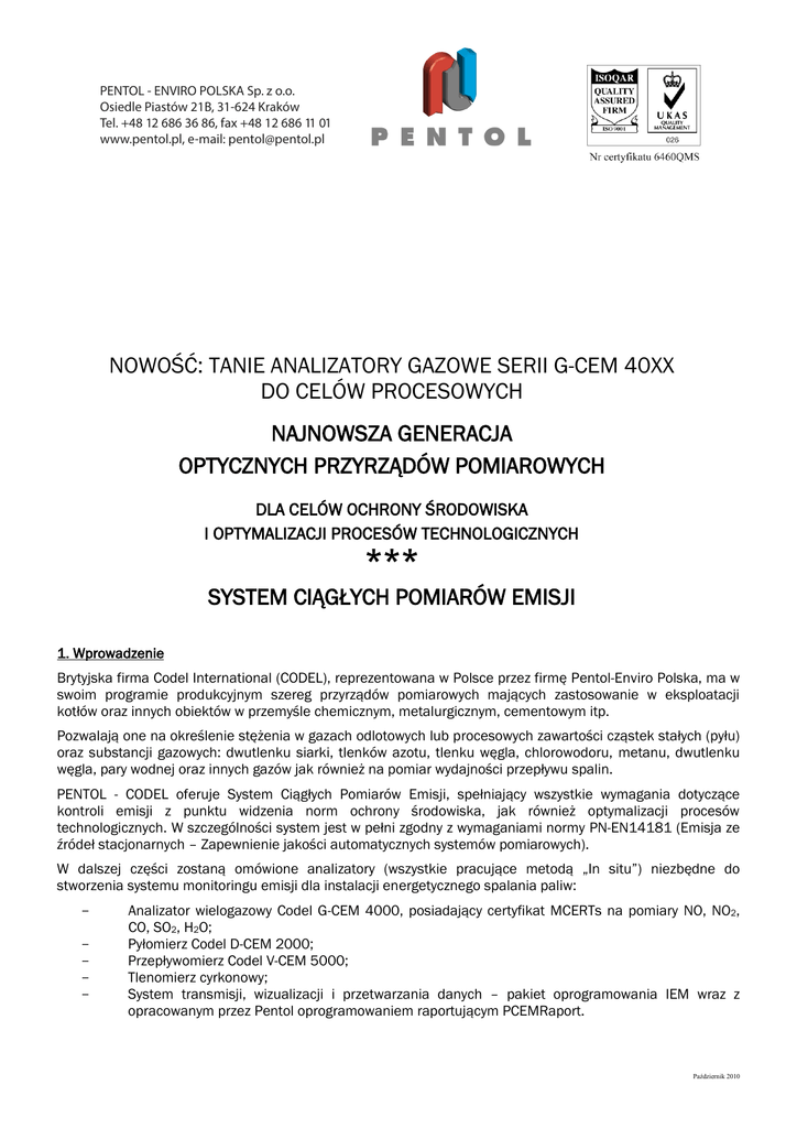 PENTOL - ENVIRO POLSKA Sp. z o.o. Osiedle Piastów 21B, 31-624 Kraków Tel. +48 12 686 36 86, fax +48 12 686 11 01 www.pentol.pl, e-mail: [email protected] NOWOŚĆ: TANIE ANALIZATORY GAZOWE SERII G-CEM 40XX DO CELÓW PROCESOWYCH NAJNOWSZA GENERACJA OPTYCZNYCH PRZYRZĄDÓW POMIAROWYCH DLA CELÓW OCHRONY ŚRODOWISKA I OPTYMALIZACJI PROCESÓW TECHNOLOGICZNYCH *** SYSTEM CIĄGŁYCH POMIARÓW EMISJI 1. Wprowadzenie Brytyjska firma Codel International (CODEL), reprezentowana w Polsce przez firmę Pentol-Enviro Polska, ma w swoim programie produkcyjnym szereg przyrządów pomiarowych mających zastosowanie w eksploatacji kotłów oraz innych obiektów w przemyśle chemicznym, metalurgicznym, cementowym itp. Pozwalają one na określenie stężenia w gazach odlotowych lub procesowych zawartości cząstek stałych (pyłu) oraz substancji gazowych: dwutlenku siarki, tlenków azotu, tlenku węgla, chlorowodoru, metanu, dwutlenku węgla, pary wodnej oraz innych gazów jak również na pomiar wydajności przepływu spalin. PENTOL - CODEL oferuje System Ciągłych Pomiarów Emisji, spełniający wszystkie wymagania dotyczące kontroli emisji z punktu widzenia norm ochrony środowiska, jak również optymalizacji procesów technologicznych. W szczególności system jest w pełni zgodny z wymaganiami normy PN-EN14181 (Emisja ze źródeł stacjonarnych – Zapewnienie jakości automatycznych systemów pomiarowych). W dalszej części zostaną omówione analizatory (wszystkie pracujące metodą „In situ”) niezbędne do stworzenia systemu monitoringu emisji dla instalacji energetycznego spalania paliw: - Analizator wielogazowy Codel G-CEM 4000, posiadający certyfikat MCERTs na pomiary NO, NO2, CO, SO2, H2O; Pyłomierz Codel D-CEM 2000; Przepływomierz Codel V-CEM 5000; Tlenomierz cyrkonowy; System transmisji, wizualizacji i przetwarzania danych – pakiet oprogramowania IEM wraz z opracowanym przez Pentol oprogramowaniem raportującym PCEMRaport. Październik 2010 -2- Opisano również analizatory umożliwiające rozszerzenie systemu o pomiary niezbędne dla instalacji spalania lub współspalania odpadów: - Pomiar HCl – zintegrowany w analizatorze Codel G-CEM 4000; Pomiar HF – za pomocą analizatora Norsk Elektro Optikk LaserGas; Pomiar całkowitego węgla organicznego – za pomocą analizatora Thermo-FID MK. W stosunkowo nielicznych przypadkach metoda „In situ” nie jest rozwiązaniem optymalnym. Ma to miejsce przede wszystkim gdy temperatura spalin jest bardzo niska – poniżej wodnego punktu rosy (np. mokra metoda odsiarczania bez przegrzewu spalin) albo bardzo wysoka (np. turbina gazowa bez kotła odzysknicowego), ponadto gdy stężenia mierzonych gazów są bardzo niskie. W takich przypadkach analizator gazowy G-CEM 4000 może być zastąpiony modelem ekstrakcyjnym z gorącą próbką G-CEM 4100. Ponadto przedstawiono najnowsze rozwiązania Codela – rodzinę jedno- i wielogazowych analizatorów serii GCEM 40xx, przeznaczonych zarówno do celów procesowych jak też do uzupełnienia istniejących systemów monitoringu emisji, np. o pomiar pary wodnej lub CO2 – analizator optyczny „In situ” do pomiaru CO w warunkach wysokiego zapylenia i wysokiej temperatury – przeznaczony do monitorowania procesów technologicznych. 2. Optyczne pomiary zanieczyszczeń gazowych 2.1 Zasada pomiaru analizatora wielogazowego G-CEM 4000 Pomiar stężenia gazów wykorzystuje zjawisko absorpcji promieniowania podczerwonego o określonej częstotliwości przez poszczególne gazy. Na rysunku 1 przedstawiono przykładowe charakterystyki częstotliwościowe absorpcji dla dwutlenku siarki, tlenku węgla, dwutlenku węgla i pary wodnej. Należy zauważyć, że termin NOx oznacza wszystkie tlenki azotu tzn. NO, NO2, N2O, N2O3, N2O5. Analizator zdolny do pomiaru wszystkich tych gazów byłby bardzo skomplikowany i drogi. Analizy wykazały, że z całości emisji wszystkich tlenków azotu NO stanowi 95%, a 5% pozostałe tlenki. Miernik w wersji podstawowej mierzy więc tylko stężenie NO z przeliczeniem na NOx według stałego współczynnika (zgodnie z obowiązującymi powszechnie przepisami stężenie NOx jest ponadto przeliczane na NO2). Jako opcję CODEL może zamontować oprócz pomiaru NO również dodatkowy kanał do pomiaru NO2. Zasada pomiaru stężeń wszystkich gazów (oprócz SO2 i pary wodnej) oparta jest na porównaniu wskazań detektora mierzącego intensywność promieniowania podczerwonego o określonej częstotliwości dobranej indywidualnie dla każdego mierzonego gazu - w warunkach roboczych i warunkach odniesienia. Znajdujący się w odbiorniku zespół filtrów i celek z gazami wzorcowymi zawiera po 2 zestawy dla każdego gazu. Zestaw „roboczy” zawiera filtr i pustą celkę - detektor mierzy wskazanie D2 zależne od stężenia mierzonego gazu (oraz od wszystkich czynników zakłócających pomiar). Po przesunięciu zespołu filtrów i celek w pozycję „odniesienia” dla tego samego gazu, promieniowanie podczerwone przechodzi przez taki sam filtr i dodatkowo przez celkę wypełnioną gazem mierzonym o stuprocentowym stężeniu. Stopień pochłaniania promieniowania podczerwonego przez mierzony gaz w kanale spalin lub kominie jest pomijalnie mały w stosunku do pochłaniania przez gaz w celce. Wskazanie detektora D1 nie zależą od stężenia mierzonego gazu, natomiast wpływ wszystkich czynników zakłócających pomiar jest identyczny jak dla pomiaru roboczego D2. Pozwala to na kompensację wszystkich czynników mogących zniekształcić pomiar. Funkcja D2 Y = 1 - K • ---D1 jest jednoznaczną funkcją stężenia mierzonego gazu (K jest współczynnikiem proporcjonalności nastawianym podczas kalibracji przyrządu Październik 2010 -3100 SO2 0 2 3 4 5 6 7 8 9 10 11 12 13 14 100 15 µm CO 0 2 3 4 5 6 7 8 9 10 11 12 13 14 15µm 100 CO2 0 2 3 4 5 6 7 8 9 10 11 12 13 14 15µm 100 PARA WODNA 0 2 3 4 5 6 7 8 9 10 11 12 13 14 15µm Rysunek 1 Porównanie charakterystyk częstotliwości