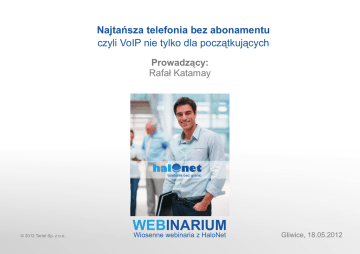 Najtańsza telefonia bez abonamentu czyli VoIP nie tylko dla początkujących Prowadzący: Rafał Katamay WEBINARIUM © 2012 Tartel Sp. z o.o. Wiosenne webinaria z HaloNet Gliwice, 18.05.2012 Harmonogram prelekcji: 1. Czy darmo znaczy za darmo? Idea telefonii bez granic Jak działa telefonia internetowa? Na co zwrócić uwagę podczas kupowania "darmowych" usług 2. Jak uruchomić VoIP? Internet Założenie profilu Potrzebny sprzęt Sposoby płatności 3. Konfiguracja - to może być proste! Automatyczna konfiguracja sprzętu Cisco Konfiguracja ręczna 4. Możliwości VoIP Własny numer telefonu (w tym przeniesienie) Mobilny telefon stacjonarny Za granicą bez roamingu 5. Usługi podstawowe i dodane Billing online Fax wirtualny i usługa SMS Dostęp dodzwaniany i HaloSpinacz Przekierowania połączeń i poczta głosowa Bezpieczeństwo i prywatność - blokada niepożądanych połączeń i limit na drogie połączenia 6. Ile to naprawdę kosztuje? Co jest za darmo? Przedpłata i abonament Brak limitów i ograniczeń Ile oszczędzamy? © 2012 Tartel Sp. z o.o. WEBINARIUM Wiosenne webinaria z HaloNet © 2012 Tartel Sp. z o.o. WEBINARIUM Wiosenne webinaria z HaloNet VoIP = Voice over Internet Protocol = telefonia internetowa © 2012 Tartel Sp. z o.o. WEBINARIUM Wiosenne webinaria z HaloNet Koszty poza usługą: sprzęt Koszty “darmowej” usługi często przemilczane: - abonament - opłata za utrzymanie konta - konieczność cyklicznego doładowywania - opłata za numer telefoniczny Internet prąd © 2012 Tartel Sp. z o.o. - opłata za dodatkowe usługi - naliczanie sekundowe nie od pierwszej sekundy WEBINARIUM Wiosenne webinaria z HaloNet Rozmowa VoIP 8kb/s dla kodeka G.729 64kb/s dla kodeka G.711 Najczęstsze przyczyny problemów: - Internet radiowy - Zła jakość łącza - Obciążone łącze © 2012 Tartel Sp. z o.o. WEBINARIUM Wiosenne webinaria z HaloNet © 2012 Tartel Sp. z o.o. WEBINARIUM Wiosenne webinaria z HaloNet słuchawki z mikrofonem bramka VoIP zwykły telefon darmowe oprogamowanie tzw. softphone telefon IP © 2012 Tartel Sp. z o.o. WEBINARIUM Wiosenne webinaria z HaloNet 1. Tradycyjny przelew na konto Czas oczekiwania: następny dzień roboczy 2. Transfer bankowy Czas oczekiwania: natychmiast 3. Karta kredytowa Czas oczekiwania: natychmiast Nr konta (Bank Millennium S.A.): 34 1160 2202 0000 0001 6458 9598 © 2012 Tartel Sp. z o.o. WEBINARIUM Wiosenne webinaria z HaloNet © 2012 Tartel Sp. z o.o. WEBINARIUM Wiosenne webinaria z HaloNet © 2012 Tartel Sp. z o.o. WEBINARIUM Wiosenne webinaria z HaloNet © 2012 Tartel Sp. z o.o. WEBINARIUM Wiosenne webinaria z HaloNet Warszawa Sosnowiec Katowice Londyn Cena za połączenie i odebranie nie zmienia się! © 2012 Tartel Sp. z o.o. WEBINARIUM Wiosenne webinaria z HaloNet © 2012 Tartel Sp. z o.o. WEBINARIUM Wiosenne webinaria z HaloNet fax SMS HaloNet SMS Email2Fax - służy do wysyłania faksów (max. 100) Fax2Email - służy do odbierania faksów © 2012 Tartel Sp. z o.o. WEBINARIUM Wiosenne webinaria z HaloNet © 2012 Tartel Sp. z o.o. WEBINARIUM Wiosenne webinaria z HaloNet © 2012 Tartel Sp. z o.o. WEBINARIUM Wiosenne webinaria z HaloNet © 2012 Tartel Sp. z o.o. WEBINARIUM Wiosenne webinaria z HaloNet © 2012 Tartel Sp. z o.o. WEBINARIUM Wiosenne webinaria z HaloNet © 2012 Tartel Sp. z o.o. WEBINARIUM Wiosenne webinaria z HaloNet To, co faktycznie jest darmowe: a. założenie i utrzymanie konta b. połączenia pomiędzy użytkownikami HaloNet (trzeba posiadać numer telefoniczny = 1 zł) Usługi dodatkowe całkowicie darmowe: Poczta głosowa Historia połączeń (online) Historia płatności (online) Limit na drogie połączenia Darmowe usługi dodatkowe, Blokada na niechciane połączenia które wiążą się z innymi kosztami Clip, czyli prezentacja numeru Faks internetowy Usługa SMS i program do wysyłki SMS Telekonferencje Przekierowanie połączeń Dostęp dodzwaniany HaloSpinacz © 2012 Tartel Sp. z o.o. WEBINARIUM Wiosenne webinaria z HaloNet Prepaid (przedpłata) brak abonamentu © 2012 Tartel Sp. z o.o. Postpaid (faktura po okresie rozliczeniowym) abonament 25 zł brutto a w nim 300 minut + numer telefoniczny WEBINARIUM Wiosenne webinaria z HaloNet Brak limitów i ograniczeń W HaloNet nie płacimy za: pusty abonamet utrzymania konta dodatkowo: nie ma konieczności cyklicznego wpłacania tylko 1 zł za pierwszy numer brak opłat za dodatkowe uługi naliczanie sekundowe odbywa się od pierwszej sekundy © 2012 Tartel Sp. z o.o. WEBINARIUM Wiosenne webinaria z HaloNet Na czym oszczędzamy: - brak abonamentu - darmowe połączenia i usługi - niski koszt połączeń: Polska stacjonarne – 0,07 zł Europa stacjonarne – przeważnie 0,07-0,09 zł Polska GSM (T-mobile, Orange, Plus) – 0,28 zł Np. Wielka Brytania GSM (O2, H3G, Orange, T-Mobile, Vodafone) i Czechy GSM – 0,39 zł f - brak roamingu - dodatkowy sprzęt (faks) - limit stawki (brak kosztownych połączeń) - biling online (kontrola) © 2012 Tartel Sp. z o.o. WEBINARIUM Wiosenne webinaria z HaloNet