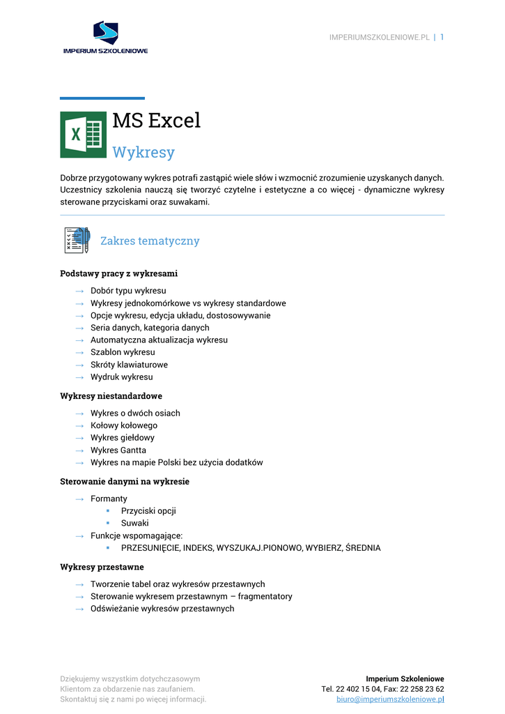 IMPERIUMSZKOLENIOWE.PL | 1 MS Excel Wykresy Dobrze przygotowany wykres potrafi zastąpić wiele słów i wzmocnić zrozumienie uzyskanych danych. Uczestnicy szkolenia nauczą się tworzyć czytelne i estetyczne a co więcej - dynamiczne wykresy sterowane przyciskami oraz suwakami. Zakres tematyczny Podstawy pracy z wykresami → → → → → → → → Dobór typu wykresu Wykresy jednokomórkowe vs wykresy standardowe Opcje wykresu, edycja układu, dostosowywanie Seria danych, kategoria danych Automatyczna aktualizacja wykresu Szablon wykresu Skróty klawiaturowe Wydruk wykresu Wykresy niestandardowe → → → → → Wykres o dwóch osiach Kołowy kołowego Wykres giełdowy Wykres Gantta Wykres na mapie Polski bez użycia dodatków Sterowanie danymi na wykresie → Formanty Przyciski opcji Suwaki → Funkcje wspomagające: PRZESUNIĘCIE, INDEKS, WYSZUKAJ.PIONOWO, WYBIERZ, ŚREDNIA Wykresy przestawne → Tworzenie tabel oraz wykresów przestawnych → Sterowanie wykresem przestawnym – fragmentatory → Odświeżanie wykresów przestawnych Dziękujemy wszystkim dotychczasowym Klientom za obdarzenie nas zaufaniem. Skontaktuj się z nami po więcej informacji. Imperium Szkoleniowe Tel. 22 402 15 04, Fax: 22 258 23 62 [email protected]