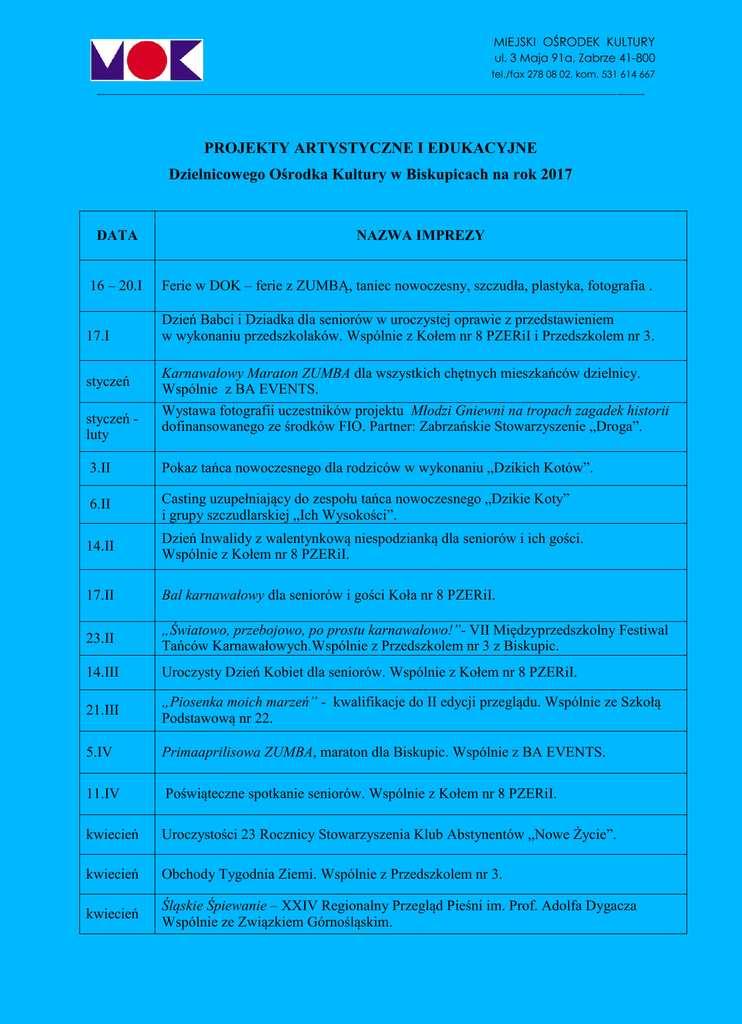 PLAN IMPREZ 2017r. - Miejski Ośrodek Kultury w Zabrzu