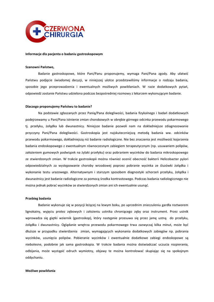 Informacje dla pacjenta o badaniu gastroskopowym Szanowni Państwo, Badanie gastroskopowe, które Pani/Panu proponujemy, wymaga Pani/Pana zgody. Aby ułatwić Państwu podjęcie świadomej decyzji, w niniejszej ulotce przedstawiliśmy informacje o rodzaju badania, sposobie jego przeprowadzenia i ewentualnych możliwych powikłaniach. W razie dodatkowych pytań, odpowiedź zostanie Państwu udzielona podczas bezpośredniej rozmowy z lekarzem wykonującym badanie. Dlaczego proponujemy Państwu to badanie? Na podstawie zgłaszanych przez Panią/Pana dolegliwości, badania fizykalnego i badań dodatkowych podejrzewamy u Pani/Pana istnienie zmian chorobowych w obrębie górnego odcinka przewodu pokarmowego tj. przełyku, żołądka lub dwunastnicy. Niniejsze badanie pozwoli nam na dokładniejsze zdiagnozowanie przyczyny Pani/Pana dolegliwości. Gastroskopia jest najskuteczniejszą metodą badania ww. odcinków przewodu pokarmowego, dokładniejszą niż badanie radiologiczne. Nie bez znaczenia jest możliwość kojarzenia badania endoskopowego z ewentualnym równoczesnym zabiegiem terapeutycznym (np. usuwaniem polipów, założeniem gumowych podwiązek na żylaki przełyku) oraz pobraniem wycinków do badania mikroskopowego ze stwierdzonych zmian. W trakcie gastroskopii można również ocenić obecność bakterii Helicobacter pylori odpowiedzialnych za występowanie choroby wrzodowej poprzez pobranie wycinka ze śluzówki żołądka i wykonanie testu urazowego. Alternatywnym i starszym sposobem diagnostyki schorzeń przełyku, żołądka i dwunastnicy jest badanie radiologiczne za pomocą środka kontrastowego. Podczas badania radiologicznego nie można jednak pobrać wycinków ze stwierdzonych zmian ani ich ewentualnie usunąć. Przebieg badania Badanie wykonuje się w pozycji leżącej na lewym boku, po uprzednim znieczuleniu gardła roztworem lignokainy, wyjęciu protez zębowych i założeniu ustnika chroniącego zęby oraz instrument. Przez ustnik wprowadza się giętki wziernik (gastroskop), który następnie przesuwa się przez jamę ustną do przełyku, żołądka i dwunastnicy. Oglądanie wnętrza przewodu pokarmowego trwa zazwyczaj kilka minut, może być dłuższe w przypadku stwierdzenia zmian, wymagających wykonania dodatkowych zabiegów np. pobrania wycinków, usunięcia polipów. Pobieranie wycinków i ewentualnie dodatkowe zabiegi endoskopowe są niebolesne, podobnie jak sama gastroskopia. W trakcie badania można doświadczać uczucia rozpierania, odbijania, może wystąpić odruch wymiotny, objawy te można kontrolować skupiając się na spokojnym oddychaniu. Możliwe powikłania Każde badanie inwazyjne, do którego należy gastroskopia może być przyczyną powikłań. Zdarzają się one jednak niezmienianie rzadko. Do występujących powikłań należy przedziurawienie (perforacja) ściany przewodu pokarmowego (zwłaszcza przełyku), występująca w 0.55% badań. Wymaga ona natychmiastowego leczenia operacyjnego. Niekiedy, zwłaszcza po wykonaniu polipektomii lub pobraniu dużej liczny wycinków może dojść do krwawienia do przewodu pokarmowego. W zdecydowanej większości wypadków udaje się je zatrzymać metodami endoskopowymi. Bardzo rzadko krwawienie wymaga leczenia operacyjnego. Również bardzo rzadko dochodzi do objawów ze strony innych układów i narządów takich jak ból wieńcowy, zaburzenia rytmu serca, skurcz oskrzeli. Opisywano pojedyncze przypadki zatrzymania czynności serca w trakcie lub po gastroskopii. Postępowanie po badaniu Gastroskopia diagnostyczna wykonywana jest w trybie ambulatoryjnym. Po badaniu można wrócić do domu. Nie ma przeciwwskazań do spożycia posiłku. Po przeprowadzeniu zabiegu leczniczego np. polipektomii pozostaje się w Klinice do następnego dnia. Po zabiegu nie wolno jeść ani pić do czasu, aż lekarz na to zezwoli (z reguły jest to okres kilku godzin). Mamy nadzieję, iż powyższe informacje pomogą Państwu w podjęciu świadomej decyzji i wyrażeniu zgody na proponowanie badanie. W razie dodatkowych pytań prosimy o ich zadanie lekarzowi. Informacje organizacyjne Do badania bardzo proszę zgłosić się z aktualnym (nie starszym niż 3 miesiące) wynikiem badania antyHCV oraz HBsAg. W przypadku pacjentów po pełnym cyklu szczepienia na żółtaczkę typu B nie ma konieczności oznaczania HBsAg i w takim przypadku wystarczy zaświadczenie o przebytym szczepieniu oraz aktualny wynik anty-HCV. Nasza pracownia może wykonać dziennie ograniczoną ilość badań, co powoduje niejednokrotnie wydłużony czas oczekiwania na termin badania, dlatego bardzo prosimy o możliwie wczesne informowanie o ewentualnej rezygnacji z ustalonego terminu, co pomoże nam skrócić kolejkę do badania. Ewentualną rezygnację, lub chęć zmiany terminu badania, uprzejmie prosimy zgłaszać pod numerem telefonu 12 4248236, lub osobiście w Pracowni Gastroskopowej. Zaświadczam, iż przedstawione powyżej informacje są dla mnie w pełni zrozumiałe oraz, iż wszystkie moje ewentualne wątpliwości dotyczące badania zostały mi w sposób jasny i wyczerpujący wyjaśnione. Planowany termin badania: Pani/Pan …………………….…………………. PESEL ……………………………. data ……….………….. podpis ………………………