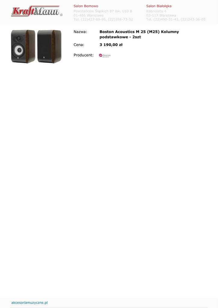 Salon Bemowo Salon Białołęka Powstańców Śląskich 87 lok. U10 B 01-466 Warszawa Tel. (22)427-89-95, (22)398-73-32 Kabrioletu 4 03-117 Warszawa Tel. (22)490-31-43, (22)243-36-05 Nazwa: Boston Acoustics M 25 (M25) Kolumny podstawkowe - 2szt Cena: 3 190,00 zł Producent: akcesoriamuzyczne.pl