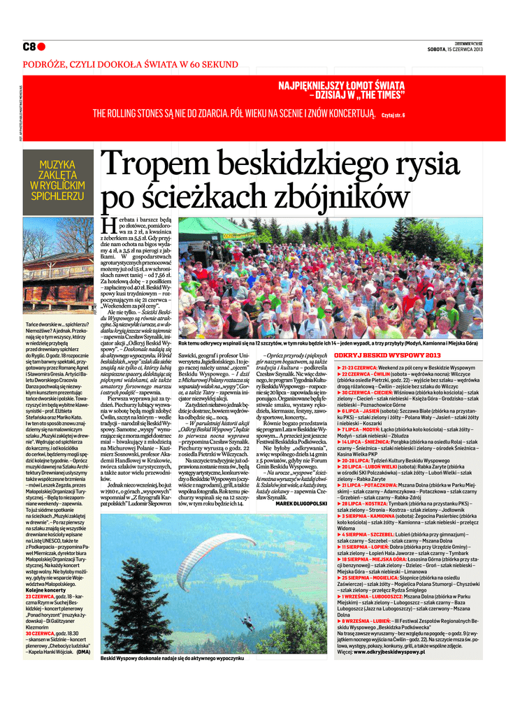 C8 a SOBOTA, 15 CZERWCA 2013 PODRÓŻE, CZYLI DOOKOŁA ŚWIATA W 60 SEKUND FOT. AP PHOTO/PABLO MARTINEZ MONSIVAIS NAJPIĘKNIEJSZY ŁOMOT ŚWIATA – DZISIAJ W „THE TIMES” THE ROLLING STONES SĄ NIE DO ZDARCIA. PÓŁ WIEKU NA SCENIE I ZNÓW KONCERTUJĄ. Czytaj str. 6 Tropem beskidzkiego rysia po ścieżkach zbójników MUZYKA ZAKLĘTA W RYGLICKIM SPICHLERZU FOT. MOT H Tańce dworskie w... spichlerzu? Tañce Niemo¿liwe? A jednak. PrzekoNiemożliwe? nają się o tym wszyscy, którzy w niedzielę przybędą przed drewniany spichlerz do Ryglic. O godz. 18 rozpocznie się tam barwny spektakl, przygotowany przez Romanę Agnel i Sławomira Gresia. Artyści Baletu Dworskiego Cracovia Danza pochwalą się niezwykłym kunsztem prezentując tańce dworskie i polskie. Towarzyszyć im będą wybitne klawesynistki – prof. Elżbieta Stefańska oraz Mariko Kato. I w ten oto sposób znowu znajdziemy się na malowniczym szlaku „Muzyki zaklętej w drewnie”. Wędrując od spichlerza do karczmy, i od kościółka do cerkwi, będziemy mogli spędzić kolejne tygodnie. – Oprócz muzyki dawnej na Szlaku Architektury Drewnianej usłyszymy także współczesne brzmienia – mówi Leszek Zegzda, prezes Małopolskiej Organizacji Turystycznej. – Będą to niezapomniane weekendy – zapewnia. To już siódme spotkanie na ścieżkach „Muzyki zaklętej w drewnie”. – Po raz pierwszy na szlaku znajdą się wszystkie drewniane kościoły wpisane na Listę UNESCO, także te z Podkarpacia – przypomina Paweł Mierniczak, dyrektor biura Małopolskiej Organizacji Turystycznej. Na każdy koncert wstęp wolny. Nie byłoby możliwy, gdyby nie wsparcie Województwa Małopolskiego. Kolejne koncerty 23 CZERWCA, godz. 18 – karczma Rzym w Suchej Beskidzkiej – koncert plenerowy „Ponad horyzont” (muzyka żydowska) – Di Galitzyaner Klezmorim 30 CZERWCA, godz. 18.30 – skansen w Sidzinie – koncert plenerowy „Chebociyz ludziska” – Kapela Hanki Wójciak. (DMA) erbata i barszcz będą po złotówce, pomidorowa za 2 zł, a kwaśnica z żeberkiem za 5,5 zł. Gdy przyjdzie nam ochota na bigos wydamy 4 zł, a 3,5 zł na pierogi z jabłkami. W gospodarstwach agroturystycznych przenocować możemy już od 15 zł, a w schroniskach nawet taniej – od 7,56 zł. Za hotelową dobę – z posiłkiem – zapłacimy od 40 zł. Beskid Wyspowy kusi trzydniowym – rozpoczynającym się 21 czerwca – „Weekendem za pół ceny”. Ale nie tylko. – Ścieżki Beskidu Wyspowego są równie atrakcyjne. Są niezwykłe i urocze, a w dodatku kryją jeszcze wiele tajemnic – zapewnia Czesław Szynalik, inicjator akcji „Odkryj Beskid Wyspowy”. – Doskonale nadają się do aktywnego wypoczynku. Wśród beskidzkich „wysp” szlak dla siebie znajdą nie tylko ci, którzy lubią niespieszne spacery, delektując się pięknymi widokami, ale także amatorzy forsownego marszu i ostrych podejść – zapewnia. Pierwsza wyprawa już za tydzień. Piechurzy lubiący wyzwania w sobotę będą mogli zdobyć Ćwilin, szczyt na którym – wedle tradycji – narodził się Beskid Wyspowy. Samotne „wyspy” wynurzające się z morza mgieł dostrzec miał – biwakujący z młodzieżą na Michurowej Polanie – Kazimierz Sosnowski, profesor Akademii Handlowej w Krakowie, twórca szlaków turystycznych, a także autor wielu przewodników. Jednak nieco wcześniej, bo już w 1910 r., o górach „wyspowych” wspomniał w „Z fizyografii Karpat polskich” Ludomir Ślepowron Rok temu odkrywcy wspinali się na 12 szczytów, w tym roku będzie ich 14 – jeden wypadł, a trzy przybyły (Modyń, Kamionna i Miejska Góra) Sawicki, geograf i profesor Uniwersytetu Jagiellońskiego. I to jego raczej należy uznać „ojcem” Beskidu Wyspowego. – I dziś z Michurowej Polany roztacza się wspaniały widok na „wyspy”, Gorce, a także Tatry – zapewnia inicjator niezwykłej akcji. Za tydzień niełatwo jednak będzie je dostrzec, bowiem wędrówka odbędzie się... nocą. – W paruletniej historii akcji „Odkryj Beskid Wyspowy”, będzie to pierwsza nocna wyprawa – przypomina Czesław Szynalik. Piechurzy wyruszą o godz. 22 z osiedla Pietrzki w Wilczycach. Na szczycie tradycyjnie już odprawiona zostanie msza św., będą występy artystyczne, konkurs wiedzy o Beskidzie Wyspowym (oczywiście z nagrodami), grill, a także wspólna fotografia. Rok temu piechurzy wspinali się na 12 szczytów, w tym roku będzie ich 14. Beskid Wyspowy doskonale nadaje się do aktywnego wypoczynku – Oprócz przyrody i pięknych gór naszym bogactwem, są także tradycja i kultura – podkreśla Czesław Szynalik. Nic więc dziwnego, że program Tygodnia Kultury Beskidu Wyspowego – rozpocznie się 20 lipca – zapowiada się imponująco. Organizowane będą festiwale smaku, wystawy rękodzieła, kiermasze, festyny, zawody sportowe, koncerty... Równie bogato przedstawia się program Lata w Beskidzie Wyspowym... A przecież jest jeszcze Festiwal Beskidzka Podkówecka. Nie byłoby „odkrywania”, a więc wspólnego dzieła 14 gmin z 5 powiatów, gdyby nie Forum Gmin Beskidu Wyspowego. – Na urocze „wyspowe” ścieżki można wyruszyć w każdej chwili. Szlaków jest wiele, a każdy inny, każdy ciekawy – zapewnia Czesław Szynalik. MAREK DŁUGOPOLSKI ODKRYJ BESKID WYSPOWY 2013 B 21-23 CZERWCA: Weekend za pół ceny w Beskidzie Wyspowym B 22 CZERWCA – ĆWILIN (sobota – wędrówka nocna): Wilczyce (zbiórka osiedle Pietrzki, godz. 22) – wyjście bez szlaku – wędrówka drogą różańcową – Ćwilin – zejście bez szlaku do Wilczyc B 30 CZERWCA – CIECIEŃ: Wiśniowa (zbiórka koło kościoła) – szlak zielony – Ciecień – szlak niebieski – Księża Góra – Grodzisko – szlak niebieski – Poznachowice Górne B 6 LIPCA – JASIEŃ (sobota): Szczawa Białe (zbiórka na przystanku PKS) – szlaki zielony i żółty – Polana Wały – Jasień – szlaki żółty i niebieski – Koszarki B 7 LIPCA – MODYŃ: Łącko (zbi