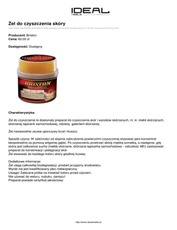 Żel do czyszczenia skóry http://www.idealmeble.pl/pl/offer/srodki-pielegnujace/srodki-pielegnujace-01/zel-do-czyszczenia-skory.html/ Producent: Briston Cena: 60.00 zł Dostępność: Dostępny Charakterystyka: Żel do czyszczenia to doskonały preparat do czyszczenia skór i wyrobów skórzanych, m. in. mebli skórzanych, skórzanej tapicerki samochodowej, odzieży, galanterii skórzanej. Żel niezawodnie usuwa uporczywy brud i tłuszcz. Sposób użycia: W zależności od stopnia zabrudzenia powierzchni czyszczonej stosować jako koncentrat bezpośrednio za pomocą wilgotnej gąbki. Po czyszczeniu przetrzeć skórę miękką szmatką, a następnie, gdy skóra jest całkowicie sucha (meble skórzane, skórzana tapicerka samochodowa – odczekać 48h) zastosować preparat do konserwacji i pielęgnacji skór Żel stosować do każdego koloru skóry gładkiej licowej. Dodatkowe informacje: Żel ulega całkowitej biodegradacji, produkt przyjazny środowisku. Wyrób nie jest kwalifikowany jako niebezpieczny. Uwaga! Zalecana próba na trwałość koloru przed użyciem. Nie używać do weluru, nubuku, zamszu! Preparat posiada certyfikat jakościowy. http://www.idealmeble.pl Dostępne wersje produktu: nazwa produktu Żel do czyszczenia skóry warianty Bristol, 400 g cena 60.00zł http://www.idealmeble.pl dostępne Dostępny Zdjęcia produktu: http://www.idealmeble.pl Powered by TCPDF (www.tcpdf.org)