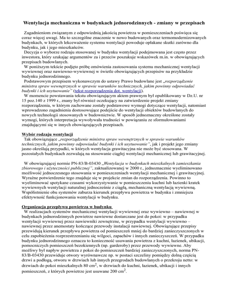 Wentylacja mechaniczna w budynkach jednorodzinnych - zmiany w przepisach Zagadnieniom związanym z odpowiednią jakością powietrza w pomieszczeniach poświęca się coraz więcej uwagi. Ma to szczególne znaczenie w nowo budowanych oraz termomodernizowanych budynkach, w których lekceważenie systemu wentylacji powoduje opłakane skutki zarówno dla budynku, jak i jego mieszkańców. Decyzja o wyborze rodzaju stosowanej w budynku wentylacji podejmowana jest często przez inwestora, który szukając argumentów za i przeciw poszukuje wskazówek m.in. w obowiązujących przepisach budowlanych. W poniższym tekście podjęto próbę omówienia zastosowania systemu mechanicznej wentylacji wywiewnej oraz nawiewno-wywiewnej w świetle obowiązujących przepisów na przykładzie budynku jednorodzinnego. Podstawowym przepisem wykonawczym do ustawy Prawo budowlane jest „rozporządzenie ministra spraw wewnętrznych w sprawie warunków technicznych, jakim powinny odpowiadać budynki i ich usytuowanie” (tekst rozporządzenia dot. wentylacji). W momencie powstawania tekstu obowiązującym aktem prawnym był opublikowany w Dz.U. nr 15 poz.140 z 1999 r., znany był również oczekujący na zatwierdzenie projekt zmiany rozporządzenia, w którym zachowane zostały podstawowe wymogi dotyczące wentylacji, natomiast wprowadzono zagadnienia dostosowujące podejście do wentylacji obiektów budowlanych do nowych technologii stosowanych w budownictwie. W sposób jednoznaczny określone zostały wymogi, których interpretacja wywoływała trudności w powiązaniu ze sformułowaniami znajdującymi się w innych obowiązujących przepisach. Wybór rodzaju wentylacji Tak obowiązujące „rozporządzenie ministra spraw wewnętrznych w sprawie warunków technicznych, jakim powinny odpowiadać budynki i ich usytuowanie”, jak i projekt jego zmiany jasno określają przypadki, w których wentylacja grawitacyjna nie może być stosowana. W pozostałych budynkach zezwalają na stosowanie ciągłej wentylacji mechanicznej lub grawitacyjnej. W obowiązującej normie PN-83/B-03430 „Wentylacja w budynkach mieszkalnych zamieszkania zbiorowego i użyteczności publicznej”, zaktualizowanej w 2000 r., jednoznacznie wyeliminowano możliwość jednoczesnego stosowania w pomieszczeniach wentylacji mechanicznej i grawitacyjnej. Wyraźne potwierdzenie tego znajduje się w projekcie zmian do rozporządzenia. Powinno to wyeliminować spotykane czasami wykorzystywanie w pomieszczeniu kuchni lub łazienki kratek wywiewnych wentylacji naturalnej jednocześnie z ciągłą, mechaniczną wentylacją wywiewną. Współistnienie obu systemów zaburza kierunek przepływu powietrza w budynku i zmniejsza efektywność funkcjonowania wentylacji w budynku. Organizacja przepływu powietrza w budynku W realizacjach systemów mechanicznej wentylacji wywiewnej oraz wywiewno – nawiewnej w budynkach jednorodzinnych powietrze nawiewne dostarczane jest do pokoi: w przypadku wentylacji wywiewnej przez nawiewniki zewnętrzne, w przypadku wentylacji wywiewno – nawiewnej przez anemostaty kończące przewody instalacji nawiewnej. Obowiązujące przepisy przewidują kierunek przepływu powietrza od pomieszczeń mniej do bardziej zanieczyszczonych w celu zapobieżenia rozprzestrzenianiu się wilgoci, zapachów i innych zanieczyszczeń. W przypadku budynku jednorodzinnego oznacza to konieczność usuwania powietrza z kuchni, łazienek, ubikacji, pomocniczych pomieszczeń bezokiennych (np. garderoby) przez przewody wywiewne. Aby możliwy był napływ powietrza z pokoi do pomieszczeń bardziej zanieczyszczonych, norma PN83/B-03430 przewiduje otwory wyrównawcze np. w postaci szczeliny pomiędzy dolną częścią drzwi a podłogą, otworu w drzwiach lub innych przegrodach budowlanych o przekroju netto: w drzwiach do pokoi mieszkalnych 80 cm2, w drzwiach do kuchni, łazienek, ubikacji i innych pomieszczeń, z których powietrze jest usuwane 200 cm2. Na rys.1 przedstawiono przykładową instalację wentylacji nawiewno – wywiewnej z odzyskiem ciepła w budynku jednorodzinnym z uwzględnieniem kierunków przepływu powietrza. Strumień objętości powietrza wentylacyjnego w budynku Ilość wymienianego powietrza powinna zapewniać jego dobrą jakość w budynku. Istotną nowością w nowym projekcie rozporządzenia jest sprecyzowanie wielkości strumienia powietrza usuwanego. Zapis ten ma brzmienie: „Strumień powietrza zewnętrznego doprowadzanego do pomieszczeń, nie będących pomieszczeniami pracy, powinien odpowiadać wymaganiom Polskiej Normy dotyczącej wentylacji, przy czym w mieszkaniach strumień ten powinien wynikać z wielkości strumienia powietrza wywiewanego, lecz być nie mniejszy niż 20 m3/h na osobę przewidywaną na pobyt stały w projekcie budowlanym” . Zapis ten umożliwia jednoznacznie wykorzystanie normy PN-83/B-03430/Az3:2000 do ustalenia ilości wymienianego powietrza z budynków mieszkalnych na podstawie ilości i rodzaju pomieszczeń w budynku. W planowaniu ilości i kierunków przepływu powietrza w budynku należy ponadto uwzględnić paleniska na paliwo stałe, gazowe lub płynne, W nowym projekcie rozporządzenia znalazła się logiczna zmiana i uzupełnienie § 154 ust. 1 i 2 dotychczas obowiązującego przepisu, wg którego: „§ 154 ust. 1 W pomieszczeniu z paleniskami na paliwo stałe, płynne lub z urządzeniami gazowymi pobierającymi powietrze do spalania z pomieszczenia i z grawitacyjnym odprowadzeniem spalin, a także jeżeli powietrze do spalania dostarczane jest z zewnątrz bezpośrednio do paleniska z zamkniętą komorą spalania szczelnym kanałem, stosowanie mechanicznej wentylacji wyciągowej jest zabronione. Ust.2 Przepisu ust. 1 nie stosuje się do pomieszczeń, w których zastosowano wentylację nawiewnowywiewną zblokowaną” . W nowej postaci przypadek ten regulowany jest przez zapisy, które powinny mieć brzmienie: „§ 150 ust. 9 W pomieszczeniu z paleniskami na paliwo stałe, płynne lub 