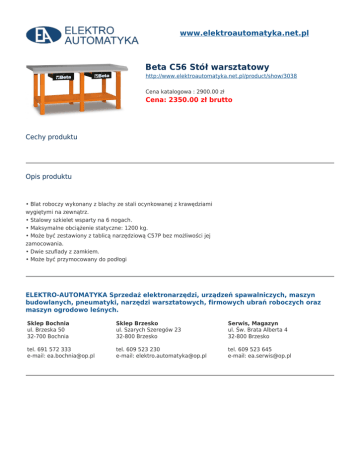 www.elektroautomatyka.net.pl Beta C56 Stół warsztatowy http://www.elektroautomatyka.net.pl/product/show/3038 Cena katalogowa : 2900.00 zł Cena: 2350.00 zł brutto Cechy produktu Opis produktu • Blat roboczy wykonany z blachy ze stali ocynkowanej z krawędziami wygiętymi na zewnątrz. • Stalowy szkielet wsparty na 6 nogach. • Maksymalne obciążenie statyczne: 1200 kg. • Może być zestawiony z tablicą narzędziową C57P bez możliwości jej zamocowania. • Dwie szuflady z zamkiem. • Może być przymocowany do podłogi ELEKTRO-AUTOMATYKA Sprzedaż elektronarzędzi, urządzeń spawalniczych, maszyn budowlanych, pneumatyki, narzędzi warsztatowych, firmowych ubrań roboczych oraz maszyn ogrodowo leśnych. Sklep Bochnia ul. Brzeska 50 32-700 Bochnia Sklep Brzesko ul. Szarych Szeregów 23 32-800 Brzesko Serwis, Magazyn ul. Św. Brata Alberta 4 32-800 Brzesko tel. 691 572 333 e-mail: [email protected] tel. 609 523 230 e-mail: [email protected] tel. 609 523 645 e-mail: [email protected]
