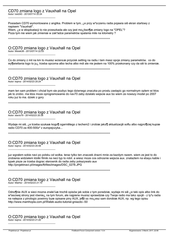 CD70 zmiana logo z Vauxhall na Opel Autor: luki240 - 2013/07/14 22:24 _____________________________________ Posiadam CD70 wymontowane z anglika. Problem w tym, ¿e przy w³±czeniu radia pojawia siê ekran startowy z napisem "Vauxhall". Wiem, ¿e w eksploatacji to nie przeszkada ale czy jest mo¿liwo¶æ zmiany logo na "OPEL"? Poza tym nie wiem jak zmieniæ w zak³adce parametrów spalania mile na kilometry ? ============================================================================ O:CD70 zmiana logo z Vauxhall na Opel Autor: Misiek38 - 2013/07/14 22:53 _____________________________________ Co do zmiany z mil na km to musisz wcisn±æ przycisk setting na radiu i tam masz opcje zmiany parametrów. co do wy¶wietlania logo to ju¿ trzeba opcoma albo techa albo mdi ale nie jestem na 100% przekonany czy da siê to zmieniæ. ============================================================================ O:CD70 zmiana logo z Vauxhall na Opel Autor: kajma - 2014/02/23 20:24 _____________________________________ mam ten sam problem i chcial bym sie pozbyc tego dziwnego znaczka po prostu zastapic go normalnym oplem wi ktos jak to zrobic. ma ktos moze oprogramowanie do nav70 zeby dzialalo wejscie aux bo wiem ze nowszy model po 2007 roku juz to ma. dzieki z gory ============================================================================ O:CD70 zmiana logo z Vauxhall na Opel Autor: slavio79 - 2014/02/23 20:38 _____________________________________ Wydaje mi siê, ¿e trzeba szukaæ kogo¶ ogarniêtego z techem2 i zrobiæ jak±¶ aktualizacjê softu albo najpro¶ciej kupiæ radio CD70 za 400-500z³ z europejczyka... ============================================================================ O:CD70 zmiana logo z Vauxhall na Opel Autor: kajma - 2014/02/23 20:48 _____________________________________ juz wgralem sobie navi po polsku od wolka. teraz tylko ten znaczek drazni mnie za kazdym razem. wiem ze jest to do zrobienia widzialem ktotki filmik na neci typ to robil. a wiesz moze cos odnosnie wejscia aux. znalazlem na ebayu kable i typek pisze ze trzeba dograc sterownik do radia zeby pokazywalo aux http://projektnavi.pl/images/fbfiles/images/DSC_0278.JPG ============================================================================ O:CD70 zmiana logo z Vauxhall na Opel Autor: MieHor - 2014/02/23 21:10 _____________________________________ Odno¶nie AUX w sieci mozna znale¼æ trochê opisów jak sobie z tym poradziæ, wydaje mi siê ¿e taki opis albo link do w³asciwej strony jest równie¿ na tym forum, ale najpierw musisz sprawdziæ czy Twoje radio ma tak± opcjê - z ty³u radia na nalepce z pinologi± powinny byæ opisane piny AUX, je¶li s± mo¿esz sam dorobiæ AUX, np. wg tego opisu http://www.mamhopla.com.pl/Watek-audio-tutorial-gniazdo--50 ============================================================================ O:CD70 zmiana logo z Vauxhall na Opel Autor: kajma - 2014/02/23 21:20 _____________________________________ Projektnavi.pl - Projektnavi.pl FireBoard Forum Component version: 1.0.4 Wygenerowano: 3 March, 2017, 22:08 dzieki wielkie ============================================================================ O:CD70 zmiana logo z Vauxhall na Opel Autor: adnim - 2014/06/30 11:04 _____________________________________ Logo mozna zmieniæ z poziomu menu. Ja mam u siebie opel, ale bez problemu mozna zmieniæ na vauxhall -- robi³em to juz, wiec u Ciebie nie powinno byc problemu. ============================================================================ O:CD70 zmiana logo z Vauxhall na Opel Autor: slavio79 - 2014/07/02 21:40 _____________________________________ adnim napisa³: Logo mozna zmieniæ z poziomu menu. Ja mam u siebie opel, ale bez problemu mozna zmieniæ na vauxhall -- robi³em to juz, wiec u Ciebie nie powinno byc problemu. Mo¿esz podaæ jaki¶ dok³adniejszy opis co i jak - bo ja to bym zmieni³ sobie na vauxhall :-) ============================================================================ O:CD70 zmiana logo z Vauxhall na Opel Autor: Szmic - 2014/07/02 23:31 _____________________________________ Ciekawe jak pierwszy raz przeczyta³em ¿e logo mo¿na zmieniæ z pozycji menu to przeszuka³em wszystko co siê da³o , niestety nie znalaz³em takiej opcji ============================================================================ O:CD70 zmiana logo z Vauxhall na Opel Autor: slavio79 - 2014/07/05 11:40 _____________________________________ Dowiedzia³em siê...Tylko Techem mo¿na to zrobiæ... ============================================================================ O:CD70 zmiana logo z Vauxhall na Opel Autor: adnim - 2014/09/25 10:19 _____________________________________ Jak mam ustawione jednostki europejskie to mam logo opel, jak zmienie na jednostki angielskie to ukazuje siê vauxhal ============================================================================ O:CD70 zmiana logo z Vauxhall na Opel Autor: zdenek2007 - 2014/09/25 21:08 _____________________________________ adnim napisa³: Jak mam ustawione jednostki europejskie to mam logo opel, jak zmienie na jednostki angielskie to ukazuje siê vauxhal Hihihi ale jazda. Opel ci±gle mnie zaskakuje. ============================================================================ O:CD70 zmiana logo z Vauxhall na Opel Autor: slavio79 - 2014/10/22 14:49 _____________________________________ Projektnavi.pl - Projektnavi.pl FireBoard Forum Component version: 1.0.4 Wygenerowano: 3 March, 2017, 22:08 U mnie niestety tylko opel zmiana jednostek nie zmienia loga... ============================================================================ O:CD70 zmiana logo z Vauxhall na Opel Autor: MieHor - 2014/10/23 19:16 _____________________________________ Te¿ próbowa³em i nic z tego ============================================================================ O:CD70 zmiana logo z Vauxhall na Opel Autor: Szmic - 2014/10/24 20:25 _____________________________________ A po co Wam to potrzebne ¿e tak zapytam ====================================
