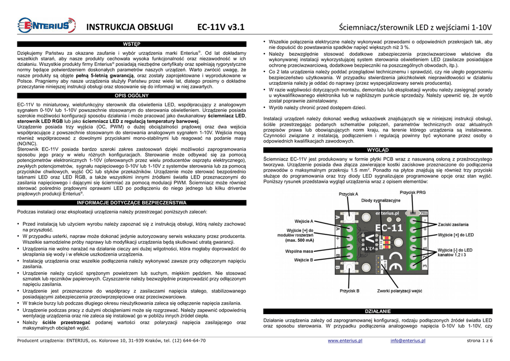 INSTRUKCJA OBSŁUGI EC-11V v3.1 Ściemniacz/sterownik LED z wejściami 1-10V WSTĘP • Wszelkie połączenia elektryczne należy wykonywać przewodami o odpowiednich przekrojach tak, aby Dziękujemy Państwu za okazane zaufanie i wybór urządzenia marki Enterius ®. Od lat dokładamy wszelkich starań, aby nasze produkty cechowała wysoka funkcjonalność oraz niezawodność w ich działaniu. Wszystkie produkty firmy Enterius® posiadają niezbędne certyfikaty oraz spełniają rygorystyczne normy będące potwierdzeniem doskonałych parametrów naszych urządzeń. Warto zwrócić uwagę, że nasze produkty są objęte pełną 5-letnią gwarancją, oraz zostały zaprojektowane i wyprodukowane w Polsce. Pragniemy aby nasze urządzenia służyły Państwu przez wiele lat, dlatego prosimy o dokładne przeczytanie niniejszej instrukcji obsługi oraz stosowanie się do informacji w niej zawartych. • Należy bezwzględnie stosować dodatkowe zabezpieczenia przeciwzwarciowe właściwe dla OPIS OGÓLNY EC-11V to miniaturowy, wielofunkcyjny sterownik dla oświetlenia LED, współpracujący z analogowym sygnałem 0-10V lub 1-10V powszechnie stosowanym do sterowania oświetleniem. Urządzenie posiada szerokie możliwości konfiguracji sposobu działania i może pracować jako dwukanałowy ściemniacz LED, sterownik LED RGB lub jako ściemniacz LED z regulacją temperatury barwowej. Urządzenie posiada trzy wyjścia (OC, PWM) o dużej obciążalności prądowej oraz dwa wejścia współpracujące z powszechnie stosowanym do sterowania analogowym sygnałem 1-10V. Wejścia mogą również współpracować z dowolnymi przyciskami mono-stabilnymi lub reagować na podanie masy (NO/NC). Sterownik EC-11V posiada bardzo szeroki zakres zastosowań dzięki możliwości zaprogramowania sposobu jego pracy w wielu różnych konfiguracjach. Sterowanie może odbywać się za pomocą potencjometrów elektronicznych 1-10V (oferowanych przez wielu producentów osprzętu elektrycznego), zwykłych potencjometrów, sygnału napięciowego 0-10V lub 1-10V z systemów sterowania lub za pomocą przycisków chwilowych, wyjść OC lub styków przekaźników. Urządzenie może sterować bezpośrednio taśmami LED oraz LED RGB, a także wszystkimi innymi źródłami światła LED przeznaczonymi do zasilania napięciowego i dającymi się ściemniać za pomocą modulacji PWM. Ściemniacz może również sterować pośrednio prądowymi oprawami LED po podłączeniu do niego jednego lub kilku driverów prądowych produkcji Enterius®. nie dopuścić do powstawania spadków napięć większych niż 3 %. wykonywanej instalacji wykorzystującej system sterowania oświetleniem LED (zasilacze posiadające ochronę przeciwzwarciową, dodatkowe bezpieczniki na poszczególnych obwodach, itp.). • Co 2 lata urządzenia należy poddać przeglądowi technicznemu i sprawdzić, czy nie uległo pogorszeniu bezpieczeństwo użytkowania. W przypadku stwierdzenia jakichkolwiek nieprawidłowości w działaniu urządzenia należy je oddać do naprawy (przez wyspecjalizowany serwis producenta). • W razie wątpliwości dotyczących montażu, demontażu lub eksploatacji wyrobu należy zasięgnąć porady u wykwalifikowanego elektronika lub w najbliższym punkcie sprzedaży. Należy upewnić się, że wyrób został poprawnie zainstalowany. • Wyrób należy chronić przed dostępem dzieci. Instalacji urządzeń należy dokonać według wskazówek znajdujących się w niniejszej instrukcji obsługi, ściśle przestrzegając podanych schematów połączeń, parametrów technicznych oraz aktualnych przepisów prawa lub obowiązujących norm kraju, na terenie którego urządzenia są instalowane. Czynności związane z instalacją, podłączeniem i regulacją powinny być wykonane przez osoby o odpowiednich kwalifikacjach zawodowych. WYGLĄD Ściemniacz EC-11V jest produkowany w formie płytki PCB wraz z nasuwaną osłoną z przeźroczystego tworzywa. Urządzenie posiada dwa złącza zawierające kostki zaciskowe przeznaczone do podłączenia przewodów o maksymalnym przekroju 1.5 mm 2. Ponadto na płytce znajdują się również trzy przyciski służące do programowania oraz trzy diody LED sygnalizujące programowane opcje oraz stan wyjść. Poniższy rysunek przedstawia wygląd urządzenia wraz z opisem elementów: INFORMACJE DOTYCZĄCE BEZPIECZEŃSTWA Podczas instalacji oraz eksploatacji urządzenia należy przestrzegać poniższych zaleceń: • Przed instalacją lub użyciem wyrobu należy zapoznać się z instrukcją obsługi, którą należy zachować na przyszłość. • W przypadku usterki, napraw może dokonać jedynie autoryzowany serwis wskazany przez producenta. • • • • • • • Wszelkie samodzielne próby naprawy lub modyfikacji urządzenia będą skutkować utratą gwarancji. Urządzenia nie wolno narażać na działanie cieczy ani dużej wilgotności, która mogłaby doprowadzić do skraplania się wody i w efekcie uszkodzenia urządzenia. Instalację urządzenia oraz wszelkie podłączenia należy wykonywać zawsze przy odłączonym napięciu zasilania. Urządzenie należy czyścić sprężonym powietrzem lub suchym, miękkim pędzlem. Nie stosować szmatek lub ręczników papierowych. Czyszczenie należy bezwzględnie przeprowadzić przy odłączonym napięciu zasilania. Urządzenie jest przeznaczone do współpracy z zasilaczami napięcia stałego, stabilizowanego posiadającymi zabezpieczenia przeciwprzepięciowe oraz przeciwzwarciowe. W trakcie burzy lub podczas długiego okresu nieużytkowania zaleca się odłączenie napięcia zasilania. Urządzenie podczas pracy z dużymi obciążeniami może się rozgrzewać. Należy zapewnić odpowiednią wentylację urządzenia oraz nie zaleca się instalować go w pobliżu innych źródeł ciepła. Należy ściśle przestrzegać podanej wartości oraz polaryzacji napięcia zasilającego oraz maksymalnych obciążeń wyjść. Producent urządzenia: ENTERIUS, os. Kolorowe 10, 