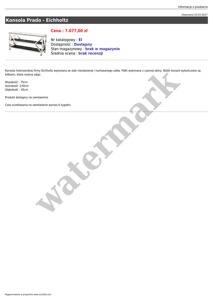 Informacje o produkcie Utworzono 03-03-2017 Konsola Prado - Eichholtz Cena : 7.077,00 zł Nr katalogowy : EI Dostępność : Dostępny Stan magazynowy : brak w magazynie Średnia ocena : brak recenzji Wysokość - 75cm Szerokość -150cm Głębokość - 45cm Produkt dostępny na zamówienie. er m ar k Konsola holenserskiej firmy Eichholtz wykonana ze stali nierdzewnej i hartowanego szkła. Półki wykonane z czarnej skóry. Nóżki konsoli wykończone są kółkami, które można zdjąć. w at Czas oczekiwania na zamówienie wynosi 6 tygodni. Wygenerowano w programie www.oscGold.com