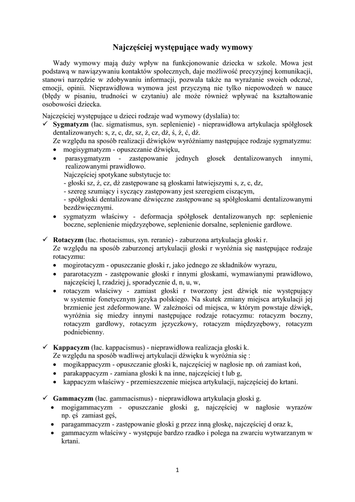 Najczęściej występujące wady wymowy Wady wymowy mają duży wpływ na funkcjonowanie dziecka w szkole. Mowa jest podstawą w nawiązywaniu kontaktów społecznych, daje możliwość precyzyjnej komunikacji, stanowi narzędzie w zdobywaniu informacji, pozwala także na wyrażanie swoich odczuć, emocji, opinii. Nieprawidłowa wymowa jest przyczyną nie tylko niepowodzeń w nauce (błędy w pisaniu, trudności w czytaniu) ale może również wpływać na kształtowanie osobowości dziecka. Najczęściej występujące u dzieci rodzaje wad wymowy (dyslalia) to: Sygmatyzm (łac. sigmatismus, syn. seplenienie) - nieprawidłowa artykulacja spółgłosek dentalizowanych: s, z, c, dz, sz, ż, cz, dż, ś, ź, ć, dź. Ze względu na sposób realizacji dźwięków wyróżniamy następujące rodzaje sygmatyzmu: mogisygmatyzm - opuszczanie dźwięku, parasygmatyzm - zastępowanie jednych głosek dentalizowanych innymi, realizowanymi prawidłowo. Najczęściej spotykane substytucje to: - głoski sz, ż, cz, dż zastępowane są głoskami łatwiejszymi s, z, c, dz, - szereg szumiący i syczący zastępowany jest szeregiem ciszącym, - spółgłoski dentalizowane dźwięczne zastępowane są spółgłoskami dentalizowanymi bezdźwięcznymi. sygmatyzm właściwy - deformacja spółgłosek dentalizowanych np: seplenienie boczne, seplenienie międzyzębowe, seplenienie dorsalne, seplenienie gardłowe. Rotacyzm (łac. rhotacismus, syn. reranie) - zaburzona artykulacja głoski r. Ze względu na sposób zaburzonej artykulacji głoski r wyróżnia się następujące rodzaje rotacyzmu: mogirotacyzm - opuszczanie głoski r, jako jednego ze składników wyrazu, pararotacyzm - zastępowanie głoski r innymi głoskami, wymawianymi prawidłowo, najczęściej l, rzadziej j, sporadycznie d, n, u, w, rotacyzm właściwy - zamiast głoski r tworzony jest dźwięk nie występujący w systemie fonetycznym języka polskiego. Na skutek zmiany miejsca artykulacji jej brzmienie jest zdeformowane. W zależności od miejsca, w którym powstaje dźwięk, wyróżnia się miedzy innymi następujące rodzaje rotacyzmu: rotacyzm boczny, rotacyzm gardłowy, rotacyzm języczkowy, rotacyzm międzyzębowy, rotacyzm podniebienny. Kappacyzm (łac. kappacismus) - nieprawidłowa realizacja głoski k. Ze względu na sposób wadliwej artykulacji dźwięku k wyróżnia się : mogikappacyzm - opuszczanie głoski k, najczęściej w nagłosie np. oń zamiast koń, parakappacyzm - zamiana głoski k na inne, najczęściej t lub g, kappacyzm właściwy - przemieszczenie miejsca artykulacji, najczęściej do krtani. Gammacyzm (łac. gammacismus) - nieprawidłowa artykulacja głoski g. mogigammacyzm - opuszczanie głoski g, najczęściej w nagłosie wyrazów np. ęś zamiast gęś, paragammacyzm - zastępowanie głoski g przez inną głoskę, najczęściej d oraz k, gammacyzm właściwy - występuje bardzo rzadko i polega na zwarciu wytwarzanym w krtani. 1 Lambdacyzm - nieprawidłowa artykulacja głoski l. mogilambdacyzm - opuszczanie głoski l w wyrazie, paralambdacyzm - zastępowanie głoski l przez głoskę: j, w, ł, dźwięk podobny do y oraz najczęściej przez li, lamdacyzm właściwy - deformowanie głoski l, najczęściej wymawiana jest międzyzębowo. Bezdźwięczność polega na wymawianiu głosek dźwięcznych bezdźwięcznie, czyli bez drgań więzadeł głosowych, np. woda – fota, noga – noka, żaba – szapa, dzieci – cieci. Głoski b, bi, d, z, ż, ź, dz, dż, dź, w, wi, g, gi zastępowane są odpowiednio głoskami p, pi, t, s, sz, ś, c, cz, ć, f, fi, k, ki. Przyczyną bezdźwięczności jest zwykle zaburzenie słuchu fonematycznego, tzn. nieróżnicowanie dźwięków o tym samym miejscu artykulacji. W tym wypadku należy mówić o wybiórczym zaburzeniu słuchu fonematycznego, gdyż pozostałe głoski są różnicowanie prawidłowo. Przy bezdźwięczności z reguły występuje obniżenie napięcia mięśniowego: wargi i policzki są wiotkie, głos jest zwykle cichy, monotonny, bezbarwny. Głoski b, bi, d, z, ż, ź, dz, dż, dź, w, wi, g, gi zastępowane są odpowiednio głoskami p, pi, t, s, sz, ś, c, cz, ć, f, fi, k, ki. Nosowanie – zachodzi wówczas, gdy głoski nosowe są wymawiane jak głoski ustne lub odwrotnie – gdy głoski ustne łączą się z rezonansem nosowym. W pierwszym przypadku mówimy o nosowaniu zamkniętym, w drugim o nosowaniu otwartym. 2