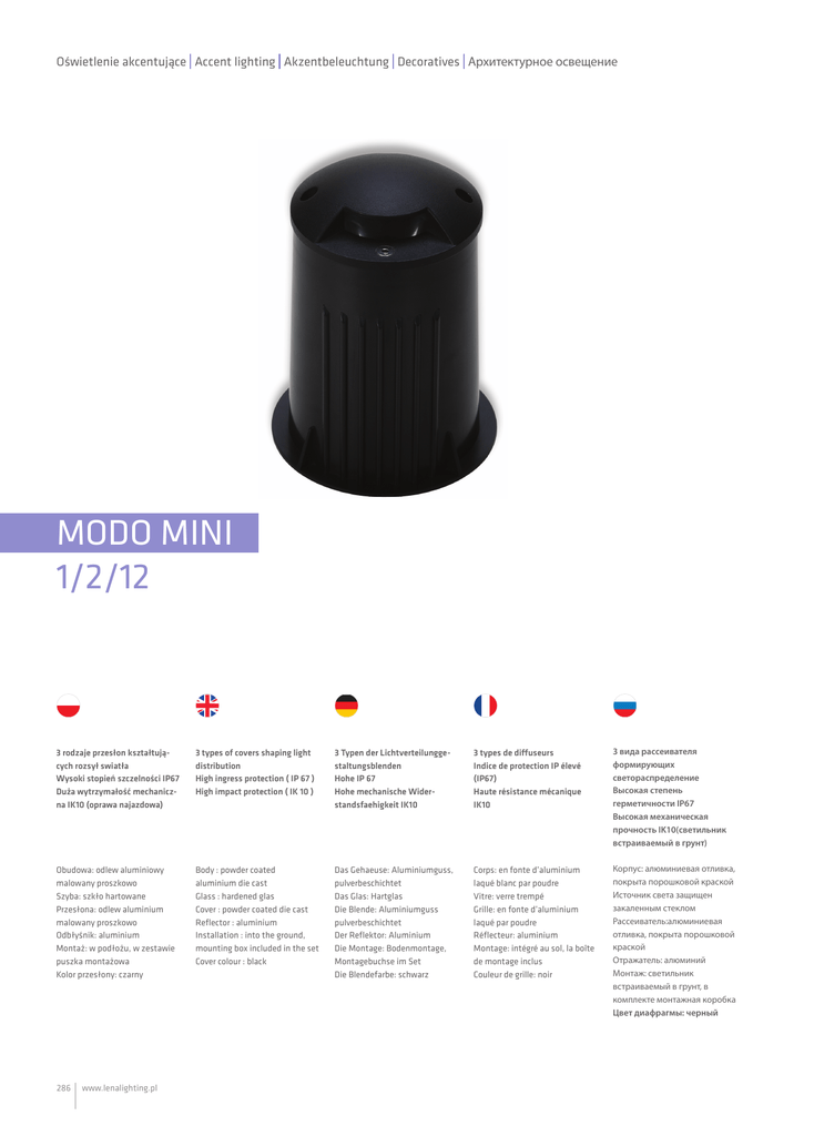 Oświetlenie akcentujące Accent lighting Akzentbeleuchtung Decoratives Aрхитектурное освещение MODO MINI 1/2/12 3 rodzaje przesłon kształtujących rozsył swiatła Wysoki stopień szczelności IP67 Duża wytrzymałość mechaniczna IK10 (oprawa najazdowa) 3 types of covers shaping light distribution High ingress protection ( IP 67 ) High impact protection ( IK 10 ) 3 Typen der Lichtverteilunggestaltungsblenden Hohe IP 67 Hohe mechanische Widerstandsfaehigkeit IK10 3 types de diffuseurs Indice de protection IP élevé (IP67) Haute résistance mécanique IK10 3 вида рассеивателя формирующих светораспределение Высокая степень герметичности IP67 Высокая механическая прочность IK10(светильник встраиваемый в грунт) Obudowa: odlew aluminiowy malowany proszkowo Szyba: szkło hartowane Przesłona: odlew aluminium malowany proszkowo Odbłyśnik: aluminium Montaż: w podłożu, w zestawie puszka montażowa Kolor przesłony: czarny Body : powder coated aluminium die cast Glass : hardened glas Cover : powder coated die cast Reflector : aluminium Installation : into the ground, mounting box included in the set Cover colour : black Das Gehaeuse: Aluminiumguss, pulverbeschichtet Das Glas: Hartglas Die Blende: Aluminiumguss pulverbeschichtet Der Reflektor: Aluminium Die Montage: Bodenmontage, Montagebuchse im Set Die Blendefarbe: schwarz Corps: en fonte d’aluminium laqué blanc par poudre Vitre: verre trempé Grille: en fonte d’aluminium laqué par poudre Réflecteur: aluminium Montage: intégré au sol, la boîte de montage inclus Couleur de grille: noir Корпус: алюминиевая отливка, покрыта порошковой краской Источник света защищен закаленным стеклом Рассеиватель:алюминиевая отливка, покрыта порошковой краской Отражатель: алюминий Монтаж: светильник встраиваемый в грунт, в комплекте монтажная коробка Цвет диафрагмы: черный 286 www.lenalighting.pl Aрхитектурное освещение Decoratives Akzentbeleuchtung Accent lighting Oświetlenie akcentujące index index max moc max power trzonek end cap waga netto net weight wymiary produktu product dimensions A/B MODO MINI 1 139512 1x20W GU10 2,10 105/122 95 MODO MINI 2 139529 1x20W GU10 2,10 105/122 95 MODO MINI 12 139536 1x20W GU10 2,10 105/122 95 wersja version A B A B A B wymiary montażowe installation dimensions MODO MINI 1 (139512) MODO MINI 2 (139529) MODO MINI 12 (139536) 1 MODO MINI 2 165° 150° 180° 165° 150° 135° 135° 120° 120° 105° 105° 90° 90° 75° cd/km CO - C180 60° 0° 60° 75° C9O - C270 www.lenalighting.pl 287