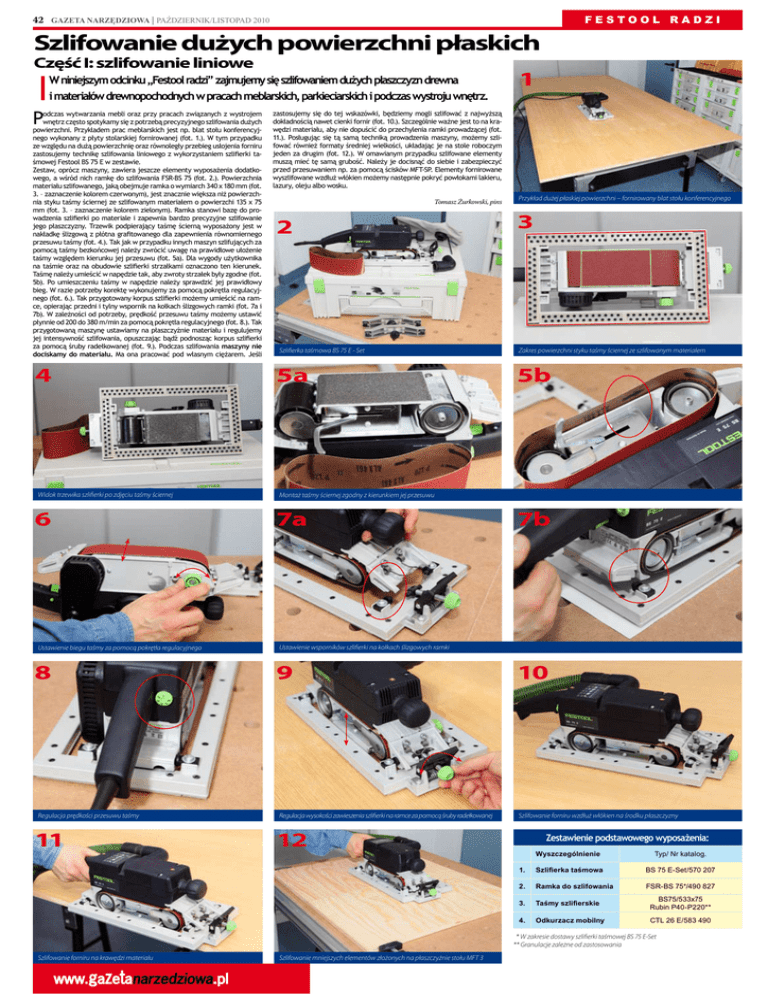 festool radzi 42 GAZETA NARZĘDZIOWA | PAŹDZIERNIK/LISTOPAD 2010 Szlifowanie dużych powierzchni płaskich Część I: szlifowanie liniowe W niniejszym odcinku „Festool radzi” zajmujemy się szlifowaniem dużych płaszczyzn drewna i materiałów drewnopochodnych w pracach meblarskich, parkieciarskich i podczas wystroju wnętrz. P odczas wytwarzania mebli oraz przy pracach związanych z wystrojem wnętrz często spotykamy się z potrzebą precyzyjnego szlifowania dużych powierzchni. Przykładem prac meblarskich jest np. blat stołu konferencyjnego wykonany z płyty stolarskiej fornirowanej (fot. 1.). W tym przypadku ze względu na dużą powierzchnię oraz równoległy przebieg usłojenia forniru zastosujemy technikę szlifowania liniowego z wykorzystaniem szlifierki taśmowej Festool BS 75 E w zestawie. Zestaw, oprócz maszyny, zawiera jeszcze elementy wyposażenia dodatkowego, a wśród nich ramkę do szlifowania FSR-BS 75 (fot. 2.). Powierzchnia materiału szlifowanego, jaką obejmuje ramka o wymiarch 340 x 180 mm (fot. 3. – zaznaczenie kolorem czerwonym), jest znacznie większa niż powierzchnia styku taśmy ściernej ze szlifowanym materiałem o powierzchi 135 x 75 mm (fot. 3. – zaznaczenie kolorem zielonym). Ramka stanowi bazę do prowadzenia szlifierki po materiale i zapewnia bardzo precyzyjne szlifowanie jego płaszczyzny. Trzewik podpierający taśmę ścierną wyposażony jest w nakładkę ślizgową z płótna grafitowanego dla zapewnienia równomiernego przesuwu taśmy (fot. 4.). Tak jak w przypadku innych maszyn szlifujących za pomocą taśmy bezkońcowej należy zwrócić uwagę na prawidłowe ułożenie taśmy względem kierunku jej przesuwu (fot. 5a). Dla wygody użytkownika na taśmie oraz na obudowie szlifierki strzałkami oznaczono ten kierunek. Taśmę należy umieścić w napędzie tak, aby zwroty strzałek były zgodne (fot. 5b). Po umieszczeniu taśmy w napędzie należy sprawdzić jej prawidłowy bieg. W razie potrzeby korektę wykonujemy za pomocą pokrętła regulacyjnego (fot. 6.). Tak przygotowany korpus szlifierki możemy umieścić na ramce, opierając przedni i tylny wspornik na kołkach ślizgowych ramki (fot. 7a i 7b). W zależności od potrzeby, prędkość przesuwu taśmy możemy ustawić płynnie od 200 do 380 m/min za pomocą pokrętła regulacyjnego (fot. 8.). Tak przygotowaną maszynę ustawiamy na płaszczyźnie materiału i regulujemy jej intensywność szlifowania, opuszczając bądź podnosząc korpus szlifierki za pomocą śruby radełkowanej (fot. 9.). Podczas szlifowania maszyny nie dociskamy do materiału. Ma ona pracować pod własnym ciężarem. Jeśli 4 Widok trzewika szlifierki po zdjęciu taśmy ściernej 6 Ustawienie biegu taśmy za pomocą pokrętła regulacyjnego 8 Regulacja prędkości przesuwu taśmy 11 1 zastosujemy się do tej wskazówki, będziemy mogli szlifować z najwyższą dokładnością nawet cienki fornir (fot. 10.). Szczególnie ważne jest to na krawędzi materiału, aby nie dopuścić do przechylenia ramki prowadzącej (fot. 11.). Posługując się tą samą techniką prowadzenia maszyny, możemy szlifować również formaty średniej wielkości, układając je na stole roboczym jeden za drugim (fot. 12.). W omawianym przypadku szlifowane elementy muszą mieć tę samą grubość. Należy je docisnąć do siebie i zabezpieczyć przed przesuwaniem np. za pomocą ścisków MFT-SP. Elementy fornirowane wyszlifowane wzdłuż włókien możemy następnie pokryć powłokami lakieru, lazury, oleju albo wosku. Tomasz Żurkowski, pins 2 Szlifierka taśmowa BS 75 E - Set 5a Przykład dużej płaskiej powierzchni – fornirowany blat stołu konferencyjnego 3 Zakres powierzchni styku taśmy ściernej ze szlifowanym materiałem 5b Montaż taśmy ściernej zgodny z kierunkiem jej przesuwu 7a 7b Ustawienie wsporników szlifierki na kołkach ślizgowych ramki 9 Regulacja wysokości zawieszenia szlifierki na ramce za pomocą śruby radełkowanej 10 Szlifowanie forniru wzdłuż włókien na środku płaszczyzny 12 Zestawienie podstawowego wyposażenia: Wyszczególnienie Typ/ Nr katalog. 1. Szlifierka taśmowa BS 75 E-Set/570 207 2. Ramka do szlifowania FSR-BS 75*/490 827 3. Taśmy szlifierskie BS75/533x75 Rubin P40-P220** 4. Odkurzacz mobilny CTL 26 E/583 490 * W zakresie dostawy szlifierki taśmowej BS 75 E-Set ** Granulacje zależne od zastosowania Szlifowanie forniru na krawędzi materiału Szlifowanie mniejszych elementów złożonych na płaszczyźnie stołu MFT 3