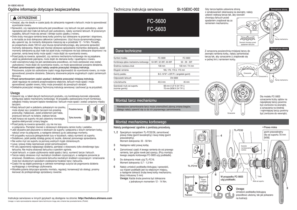 SI-1GE0C-002-03 Ogólne informacje dotyczące bezpieczeństwa Techniczna instrukcja serwisowa OSTRZEŻENIE • Uważać, aby nie doszło w czasie jazdy do zahaczenia nogawek o łańcuch; może to spowodować wywrócenie roweru. • Sprawdzić, czy naprężenie łańcucha jest prawidłowe i czy łańcuch nie jest uszkodzony. Jeżeli naprężenie jest zbyt małe lub łańcuch jest uszkodzony, należy wymienić łańcuch. W przeciwnym wypadku, łańcuch może się zerwać i istnieje ryzyko upadku z roweru. • Dwie śruby mocujące ramienia lewej korby powinny być dokręcane na przemian i stopniowo, a nie każda ze śrub dokręcana całkowicie i jednorazowo. Użyć klucza dynamometrycznego, aby upewnić się, że momenty dokręcenia mieszczą się w przedziale 12 - 14 Nm. Ponadto, po przejechaniu około 100 km użyć klucza dynamometrycznego, aby ponownie sprawdzić momenty dokręcenia. Ważne jest również okresowe sprawdzanie momentów dokręcenia. Jeżeli momenty dokręcenia są zbyt małe lub jeżeli śruby montażowe nie były dokręcane stopniowo i na przemian, ramię lewej korby może spaść i może dojść do wywrócenia roweru. • Przed jazdą na rowerze, sprawdzić, czy ramiona mechanizmu korbowego nie są popękane. Jeżeli są jakiekolwiek pęknięcia, może dojść do złamania korby i spadnięcia z roweru. • Jeśli wewnętrzna tuleja nie jest zainstalowana prawidłowo, oś może zardzewieć oraz zostać uszkodzona i może dojść do wywrócenia roweru, co może spowodować poważne obrażenia. • Przed zamontowaniem części należy uważnie przeczytać niniejszą instrukcję. Poluzowane, zużyte lub uszkodzone części mogą doprowadzić do wywrócenia roweru, co może spowodować poważne obrażenia. Zalecamy stosowanie jedynie oryginalnych części zamiennych Shimano. • Przed zamontowaniem części uzyskać i dokładnie przeczytać niniejszą instrukcję. Jeżeli regulacja nie zostanie przeprowadzona właściwie, łańcuch może spaść i może spowodować upadek roweru, który może prowadzić do poważnych obrażeń. • Dokładnie przeczytać niniejszą Techniczną instrukcję serwisową i zachować ją na przyszłość. SI-1GE0C-002 FC-5600 FC-5603 Gdy tarcza będzie ustawiona stroną z oznakowaniem skierowaną na zewnątrz, należy ustawić większą tarczę tak, aby sworzeń chroniący łańcuch przed spadaniem znajdował się za ramieniem mechanizmu. Zewnętrzna strona Ramię mechanizmu Sworzeń chroniący przed spadaniem łańcucha Dane techniczne Symbol modelu Kombinacja zębów mechanizmu korbowego FC-5600 FC-5603 53-39T, 52-39T, 50-39T 50 - 39 - 30T 130 mm 130 mm / 74 mm Średnica rozstawu śrub Długość ramienia Gwinty pedału Wewnętrzna strona Z oznaczoną powierzchnią mniejszej tarczy do zewnątrz ramienia korby, należy zamontować tarczę tak, aby oznaczenie Δ znajdowało się w jednej linii z ramieniem korby. 165, 170, 172,5, 175 mm Oznaczenie B.C. 9/16” x 20T.P.I. (angielski gwint) Odpowiedni łańcuch Oznaczenie Δ CN-5600 Ramię mechanizmu Linia łańcucha Szerokość mufy osi suportu (rozmiar gwintu) 43,5 mm 45 mm 68 mm (1,37 X 24 T.P.I.) 70 mm (M36 X 24 T.P.I.) Uwaga • Upewnić się, w tabeli danych technicznych produktu, czy kombinacja koronek odpowiada konfiguracji zębów mechanizmu korbowego. W przypadku zastosowania innych kombinacji, odległość miedzy tarczami będzie niewłaściwa i łańcuch może spaść i zostać uwięziony między tarczami. • Kiedy łańcuch jest w położeniu pokazanym na rysunku, Przednia tarcza może stykać się z przednimi tarczami lub przednią przerzutką i hałasować. Jeżeli problemem jest hałas, przerzucić łańcuch na kolejne, większe tarcze. Tylna koronka • Jeśli korpus osi suportu nie jest ustawiony równolegle, spadnie efektywność zmiany biegów. • Przed jazdą na rowerze sprawdzić, czy nie ma luzu w połączeniu. Pamiętać również o okresowym dokręcaniu ramion korby i pedałów. • Jeśli słyszalne jest piszczenie w okolicach osi suportu i połączenia z lewym ramieniem korby, nałożyć smar na połączenie, a następnie dokręcić ją do zalecanego momentu. • W przypadku wyczucia jakiegokolwiek luzu w łożyskach, należy wymienić oś suportu. • Dodatkowo, jeżeli pedały działają gorzej niż zwykle, dokonać ponownego sprawdzenia. • Nie wolno myć osi suportu za pomocą wodnych myjek ciśnieniowych. • Lewą i prawą miskę nasmarować przed zamontowaniem. • W celu zapewnienia najlepszego działania, pamiętać o stosowaniu tylko określonego typu łańcucha. Nie można stosować łańcucha o szerokim ogniwie. • Jeżeli łańcuch, w czasie użytkowania nadal spada z tarcz, wymienić tarcze i łańcuch. • Tarcze należy okresowo myć neutralnym środkiem czyszczącym, a następnie ponownie je smarować. Dodatkowo, czyszczenie łańcucha neutralnym środkiem czyszczącym i smarowanie może być skutecznym sposobem zwiększenia trwałości tarcz i łańcucha. • Części nie są objęte gwarancją w zakresie normalnego zużycia lub pogorszenia działania wynikającego z normalnego użytkowania. • Wszelkie pytania dotyczące sposobu montażu, regulacji, konserwacji lub obsługi, prosimy kierować do profesjonalnego sprzedawcy rowerów. Dla modelu FC-5603 oznaczenie liczby zębów na największej tarczy powinno być zwrócone na zewnątrz, a oznaczenia na średniej i najmniejszej tarczy powinny być zwrócone do wewnątrz. Montaż tarcz mechanizmu Niewłaściwe zamontowanie tarcz może uniemożliwić płynną zmianę biegów, dlatego należy upewnić się co do ich poprawnego zamontowania. Oznaczenie Montaż mechanizmu korbowego Należy postępować zgodnie z poniższą procedurą. • Prawa miska TL-FC32 1, 2 Specjalnym narzędziem TL-FC32/36, zamontować prawą miskę (gwint lewoskrętny) i lewą miskę (gwint prawoskrętny). Moment dokręcenia: 35 - 50 Nm 3 Następnie nałóż prawą korbę. 4 Zamontować część A lewego ramienia do osi prawego rami
