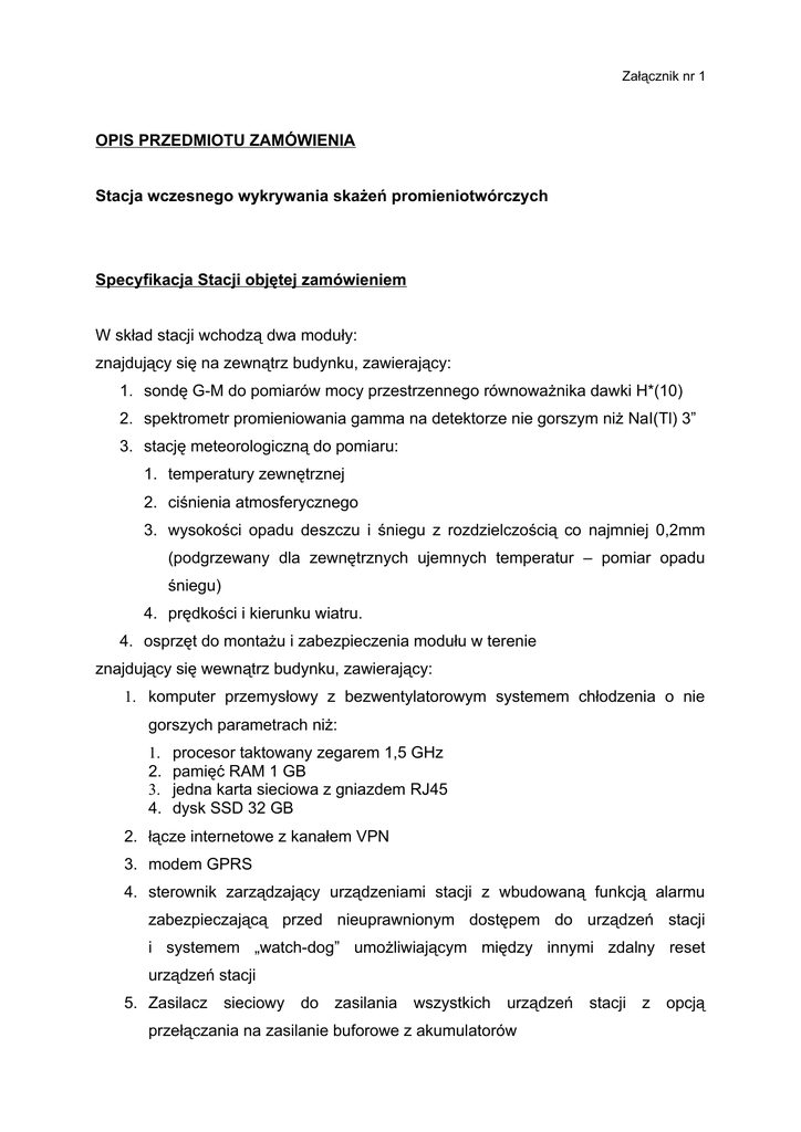 Załącznik nr 1 OPIS PRZEDMIOTU ZAMÓWIENIA Stacja wczesnego wykrywania skażeń promieniotwórczych Specyfikacja Stacji objętej zamówieniem W skład stacji wchodzą dwa moduły: znajdujący się na zewnątrz budynku, zawierający: 1. sondę G-M do pomiarów mocy przestrzennego równoważnika dawki H*(10) 2. spektrometr promieniowania gamma na detektorze nie gorszym niż NaI(Tl) 3” 3. stację meteorologiczną do pomiaru: 1. temperatury zewnętrznej 2. ciśnienia atmosferycznego 3. wysokości opadu deszczu i śniegu z rozdzielczością co najmniej 0,2mm (podgrzewany dla zewnętrznych ujemnych temperatur – pomiar opadu śniegu) 4. prędkości i kierunku wiatru. 4. osprzęt do montażu i zabezpieczenia modułu w terenie znajdujący się wewnątrz budynku, zawierający: 1. komputer przemysłowy z bezwentylatorowym systemem chłodzenia o nie gorszych parametrach niż: 1. 2. 3. 4. procesor taktowany zegarem 1,5 GHz pamięć RAM 1 GB jedna karta sieciowa z gniazdem RJ45 dysk SSD 32 GB 2. łącze internetowe z kanałem VPN 3. modem GPRS 4. sterownik zarządzający urządzeniami stacji z wbudowaną funkcją alarmu zabezpieczającą przed nieuprawnionym dostępem do urządzeń stacji i systemem „watch-dog” umożliwiającym między innymi zdalny reset urządzeń stacji 5. Zasilacz sieciowy do zasilania wszystkich urządzeń przełączania na zasilanie buforowe z akumulatorów stacji z opcją 6. Akumulatory buforowe do pracy rezerwowej o pojemności pozwalającej na nieprzerwaną 14 dniową pracę stacji 7. Jednofazowy licznik energii pobieranej przez stację z możliwością odczytu przez komputer stacji. wszystkie wymagane do montażu podzespoły mechaniczne i elektryczne oraz normalia, takie jak mocowanie elementów stacji, kable połączeniowe, złącza itd. itp. Temperatura pracy modułu zewnętrznego stacji od -30ºC do +50ºC Temperatura pracy modułu wewnętrznego stacji od 0ºC do +40ºC Klasa ochronności modułu zewnętrznego co najmniej IP-65 Klasa ochronności modułu wewnętrznego co najmniej IP-44 Odległość pomiędzy modułami nie większa od 100 m Komunikacja pomiędzy modułami na złączu RS-485 Zasilanie całości stacji 12Vdc (+15%, -10%) Wymagane parametry toru G-M: zakres pomiarowy mocy przestrzennego równoważnika dawki od 50 nSv/h do 2 Sv/h. zakres energetyczny co najmniej 35 - 1300 keV fluktuacje statystyczne nie gorsze niż ±10% (100 nSv/h, 10 min, 2σ) Wymagane parametry toru spektrometrycznego: zakres pomiarowy mocy przestrzennego równoważnika dawki od 50 nSv/h do 5 µSv/h zakres energetyczny co najmniej 35 – 3000 keV rozdzielczość energetyczna FWHM nie gorsza niż 7,5% dla Cs-137 co najmniej 512 kanałów energetycznych maksymalna ilość zliczeń (impulsów) na kanał 65535 (16 bitów) automatyczna stabilizacja widma bez użycia źródeł promieniotwórczych podgrzewanie scyntybloku w przypadku wystąpienia temperatur ujemnych wewnątrz obudowy Wymagane funkcje spełniane przez komputer przemysłowy: pobieranie danych z torów pomiarowych G-M i spektrometrycznego co minutę pobieranie danych pogodowych co minutę pobieranie danych z wszystkich sond i czujników stacji co minutę pobieranie danych z licznika energii na żądanie przechowywanie danych w pamięci (na dysku twardym) co najmniej przez ostatnie 60 dni w formie plików tekstowych przy zachowaniu lokalizacji i formatów plików całkowicie zgodnym z już istniejącym systemem do stacji PMS. generowanie danych pomiarowych i pogodowych w formie plików tekstowych do przesyłu do centralnej bazy danych co 10 minut udostępnienie danych (serwer FTP) po łączu VPN, a w przypadku jego awarii przez modem GPRS zastosowanie restrykcyjnego firewall'a, umożliwiającego dostęp zdalny wyłącznie ze ściśle określonych hostów weryfikacja stanu poszczególnych elementów stacji i ewentualne podjęcie działań naprawczych prowadzenie logu stacji cykliczne zerowania licznika „watchg-dog” sterownika zarządzającego stacją detekcja i sygnalizowanie błędów w pracy stacji oprogramowanie powinno być kompatybilne co do struktury plików i katalogów wynikowych z danymi, formatu danych przesyłanych do centralnej bazy danych wyników pomiarów, oraz protokołu przesyłu, z dotychczas stosowanym w stacjach PMS, pracujących w krajowej sieci wczesnego wykrywania skażeń promieniotwórczych funkcje komputera powinny być wykonywane w czasie rzeczywistym pracy stacji Wymagane funkcje spełniane przez sterownik zarządzający stacją: pomiar temperatur z wnętrz obudów poszczególnych elementów stacji, co najmniej z torów pomiarowych, otoczenia komputera przemysłowego i baterii akumulatorów buforujących detekcja wtargnięć do elementów stacji i generowanie związanych z tym alarmów, również dźwiękowego operacje „watch-dog” dotyczące stanu aktywności komputera przemysłowego stacji doprowadzenie zasilania poprzez zarządzalne klucze do elementów stacji, co najmniej do torów pomiarowych, komputera przemysłowego i stacji meteo pomiar napięcia zasilającego i pomiar pobieranej mocy sterowanie zasilaczem, testy, brak napięcia w sieci energetycznej Zasilanie grzałek scyntybloku i stacji meteo nie jest buforowane przez zasilacz. Dokumentacja stacji: Techniczno-Ruchowa (paszport stacji) powinna być zgodna z dyrektywą 2006/42/WE Parlamentu Europejskiego i Rady z dnia 17 maja 2006 r. Instrukcja serwisowa Instrukcja użytkowania Serwis i gwarancja: Serwis stacji powinien być zapewniony przez co najmniej 15 lat, a w przypadku braku takiej możliwości, zapewnione pełne przeszkolenie firmy lub firm serwisujących stacje w okresie 7 lat od odbioru stacji przez PAA Stacja i wszystkie jej elementy podlegają 2 letniej gwarancji. Oprogramowanie funkcjonalne stacji podlega 12 miesięcznej gwarancji od momentu uruchomienia stacji i podłączenia jej do krajowej sieci wczesnego wykrywania skażeń promieniotwórczych Rozruch stacji: Kompletna stacja powinna zostać uruchomiona u zamawiając