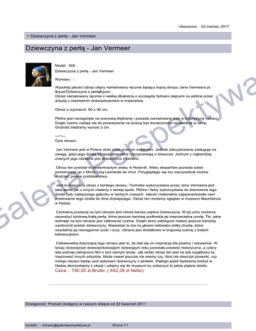 Utworzono : 03 marzec 2017 > Dziewczyna z perłą - Jan Vermeer Dziewczyna z perłą - Jan Vermeer Model : 500 Dziewczyna z perłą - Jan Vermeer a w ty Wymiary : - Wysokiej jakości obraz olejny namalowany ręcznie będący kopią obrazu Jana Vermeera pt. "Dziewczyna z perłą". Obraz namalowany ręcznie z wielką dbałością o szczegóły farbami olejnymi na płótnie przez artystę z wieloletnim doświadczeniem w malarstwie. k e Obraz o wymiarch: 60 x 90 cm. Płótno jest naciagnięte na sosnową blejtramę i posiada zamalowane boki w kolorystyce całości. Dzięki czemu nadaje sie do powieszenia na ścianę bez konieczności oprawiania w ramę. Grubość blejtramy wynosi 2 cm. ~~*~~ Opis obrazu: p rs e P Jan Vermeer jest w Polsce dość mało znanym malarzem. Jednak zdecydowanie zasługuje na uwagę, gdyż jego dzieła są niepowtarzalne i przyprawiają o dreszcze. Jednym z najbardziej znanych jego obrazów jest dziewczyna z perłami. G a i r e l a Obraz ten powstał w siedemnastym wieku w Holandii. Wielu ekspertów pozwala sobie porównywać go z Mona Lisą Leonarda da Vinci. Przyglądając się mu rzeczywiście można dostrzec pewne podobieństwa. Jest to klasyczny obraz z tamtego okresu. Technika wykorzystana przez Jana Vermeera jest taka sama jak u innych malarzy z tamtej epoki. Płótno i farby wykorzystane do stworzenia tego dzieła były najlepszego gatunku w tamtych czasach. Jakość materiałów zagwarantowała nam przetrwanie tego dzieła do dnia dzisiejszego. Obraz ten możemy oglądać w muzeum Mauritshuis w Hadze. Centralną postacią na tym obrazie jest młoda bardzo piękna dziewczyna. W jej uchu możemy zauważyć tytułową białą perłę, która jeszcze bardziej podkreśla jej nieprzeciętną urodę. Tło, jakie widnieje na tym obrazie jest całkowicie czarne. Dzięki temu zabiegowi malarz jeszcze bardziej uwidocznił postać dziewczyny. Niewiasta ta ma na głowie niebiesko-żółtą chustę, która uwydatnia jej nienaganne czoło i oczy. Ubrana jest dodatkowo w brązową suknię z białym kołnierzykiem. Ciekawostką dotyczącą tego obrazu jest to, że stał się on inspiracją dla pisarzy i reżyserów. W tysiąc dziewięćset dziewięćdziesiątym dziewiątym roku powstała powieść historyczna, a cztery lata później nakręcono film o tym samym tytule. Jak widać obraz ten jest na tyle wyjątkowy by inspirować innych artystów. Może nawet jeszcze nie wiemy czy, ktoś nie stworzył piosenki, czy innego obrazu będąc pod wpływem dziewczyny z perłami. Dlatego jeżeli będziemy kiedyś w Hadze skorzystajmy z okazji i udajmy się do muzeum by zobaczyć to jakże piękne dzieło. Cena : 790,00 zł Brutto ( 642,28 zł Netto) Dostępność: Produkt dostępny w naszym sklepie od 22 kwiecień 2011 kontakt : - [email protected] Strona 1/1