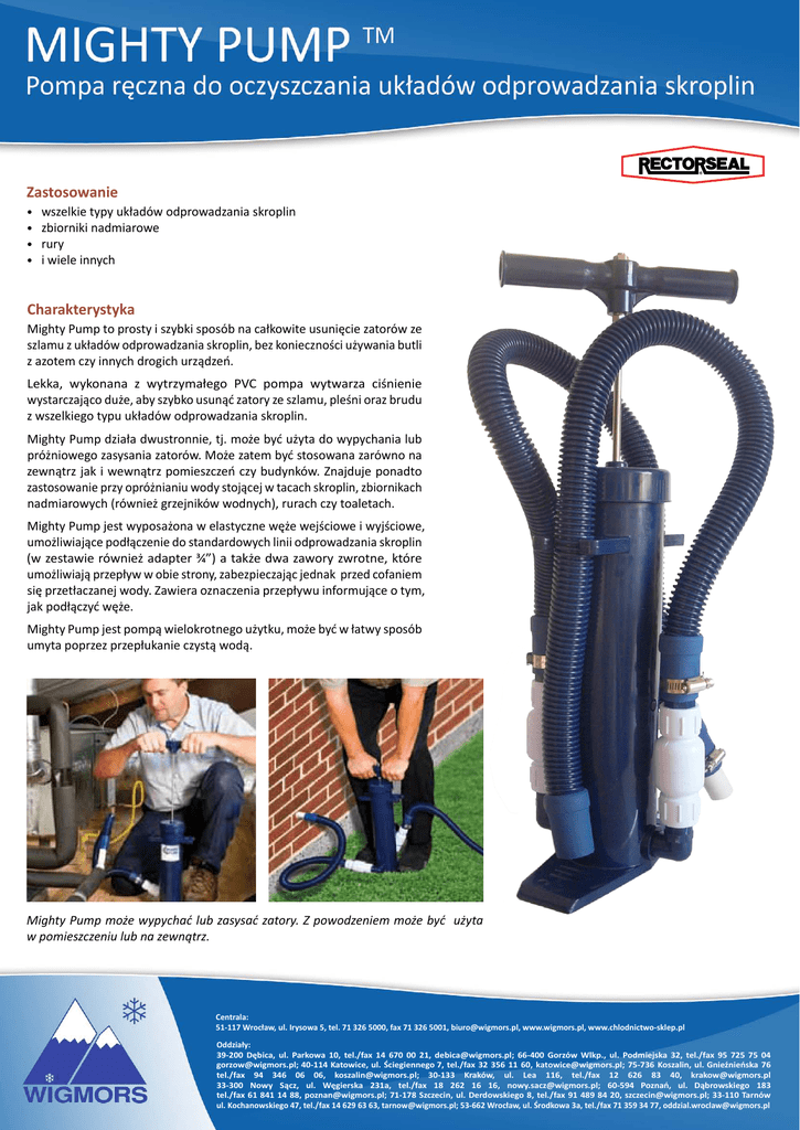 Zastosowanie • • • • wszelkie typy układów odprowadzania skroplin zbiorniki nadmiarowe rury i wiele innych Charakterystyka Mighty Pump to prosty i szybki sposób na całkowite usunięcie zatorów ze szlamu z układów odprowadzania skroplin, bez konieczności używania butli z azotem czy innych drogich urządzeń. Lekka, wykonana z wytrzymałego PVC pompa wytwarza ciśnienie wystarczająco duże, aby szybko usunąć zatory ze szlamu, pleśni oraz brudu z wszelkiego typu układów odprowadzania skroplin. Mighty Pump działa dwustronnie, tj. może być użyta do wypychania lub próżniowego zasysania zatorów. Może zatem być stosowana zarówno na zewnątrz jak i wewnątrz pomieszczeń czy budynków. Znajduje ponadto zastosowanie przy opróżnianiu wody stojącej w tacach skroplin, zbiornikach nadmiarowych (również grzejników wodnych), rurach czy toaletach. Mighty Pump jest wyposażona w elastyczne węże wejściowe i wyjściowe, umożliwiające podłączenie do standardowych linii odprowadzania skroplin (w zestawie również adapter ¾”) a także dwa zawory zwrotne, które umożliwiają przepływ w obie strony, zabezpieczając jednak przed cofaniem się przetłaczanej wody. Zawiera oznaczenia przepływu informujące o tym, jak podłączyć węże. Mighty Pump jest pompą wielokrotnego użytku, może być w łatwy sposób umyta poprzez przepłukanie czystą wodą. Mighty Pump może wypychać lub zasysać zatory. Z powodzeniem może być użyta w pomieszczeniu lub na zewnątrz. Centrala: 51-117 Wrocław, ul. Irysowa 5, tel. 71 326 5000, fax 71 326 5001, [email protected], www.wigmors.pl, www.chlodnictwo-sklep.pl Oddziały: 39-200 Dębica, ul. Parkowa 10, tel./fax 14 670 00 21, [email protected]; 66-400 Gorzów Wlkp., ul. Podmiejska 32, tel./fax 95 725 75 04 [email protected]; 40-114 Katowice, ul. Ściegiennego 7, tel./fax 32 356 11 60, [email protected]; 75-736 Koszalin, ul. Gnieźnieńska 76 tel./fax 94 346 06 06, [email protected]; 30-133 Kraków, ul. Lea 116, tel./fax 12 626 83 40, [email protected] 33-300 Nowy Sącz, ul. Węgierska 231a, tel./fax 18 262 16 16, [email protected]; 60-594 Poznań, ul. Dąbrowskiego 183 tel./fax 61 841 14 88, [email protected]; 71-178 Szczecin, ul. Derdowskiego 8, tel./fax 91 489 84 20, [email protected]; 33-110 Tarnów ul. Kochanowskiego 47, tel./fax 14 629 63 63, [email protected]; 53-662 Wrocław, ul. Środkowa 3a, tel./fax 71 359 34 77, [email protected]