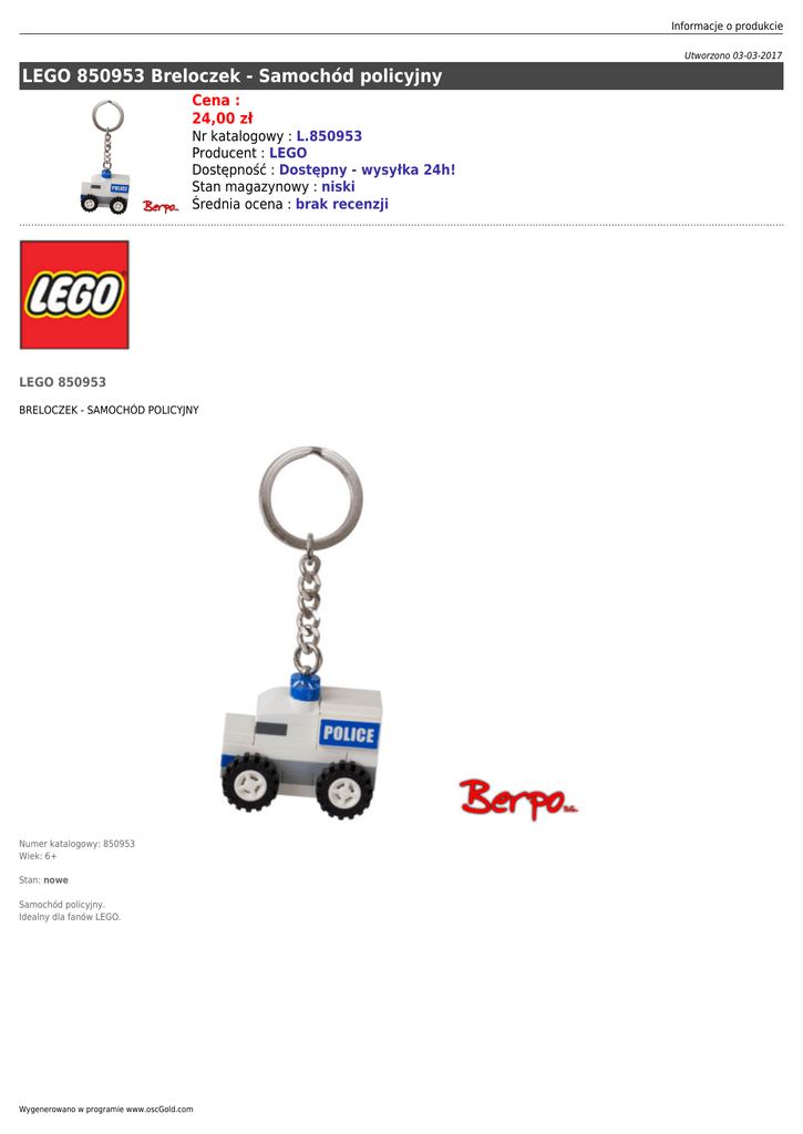 Informacje o produkcie Utworzono 03-03-2017 LEGO 850953 Breloczek - Samochód policyjny Cena : 24,00 zł Nr katalogowy : L.850953 Producent : LEGO Dostępność : Dostępny - wysyłka 24h! Stan magazynowy : niski Średnia ocena : brak recenzji LEGO 850953 BRELOCZEK - SAMOCHÓD POLICYJNY Numer katalogowy: 850953 Wiek: 6+ Stan: nowe Samochód policyjny. Idealny dla fanów LEGO. Wygenerowano w programie www.oscGold.com Dostępność w salonach: Ilość sztuk: Sklep - Złotniki: 1 Sklep - zlikwidowany: 0 Sklep - Szczepankowo: 0 Dostępne opcje LEGO 850953 Breloczek - Samochód policyjny » Wiek: 5 - 7 lat, 8 - 11 lat, 12 lat i więcej.