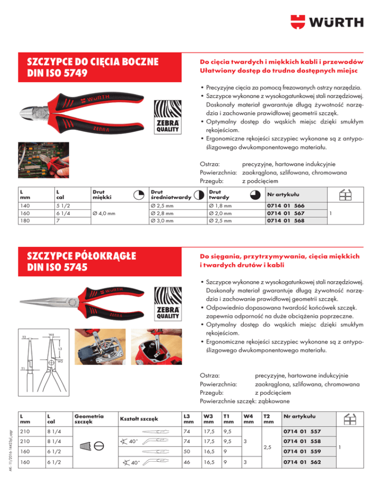 SZCZYPCE DO CIĘCIA BOCZNE DIN ISO 5749 Do cięcia twardych i miękkich kabli i przewodów Ułatwiony dostęp do trudno dostępnych miejsc • Precyzyjne cięcia za pomocą frezowanych ostrzy narzędzia. • Szczypce wykonane z wysokogatunkowej stali narzędziowej. Doskonały materiał gwarantuje długą żywotność narzędzia i zachowanie prawidłowej geometrii szczęk. • Optymalny dostęp do wąskich miejsc dzięki smukłym rękojeściom. • Ergonomiczne rękojeści szczypiec wykonane są z antypoślizgowego dwukomponentowego materiału. Ostrza: precyzyjne, hartowane indukcyjnie Powierzchnia: zaokrąglona, szlifowana, chromowana Przegub: z podcięciem L mm L cal Drut miękki Drut średniotwardy Drut twardy Nr artykułu 140 160 180 5 1/2 6 1/4 7 Ø 4,0 mm Ø 2,5 mm Ø 2,8 mm Ø 3,0 mm Ø 1,8 mm Ø 2,0 mm Ø 2,5 mm 0714 01 566 0714 01 567 0714 01 568 SZCZYPCE PÓŁOKRĄGŁE DIN ISO 5745 1 Do sięgania, przytrzymywania, cięcia miękkich i twardych drutów i kabli • Szczypce wykonane z wysokogatunkowej stali narzędziowej. Doskonały materiał gwarantuje długą żywotność narzędzia i zachowanie prawidłowej geometrii szczęk. • Odpowiednio dopasowana twardość końcówek szczęk. zapewnia odporność na duże obciążenia poprzeczne. • Optymalny dostęp do wąskich miejsc dzięki smukłym rękojeściom. • Ergonomiczne rękojeści szczypiec wykonane są z antypoślizgowego dwukomponentowego materiału. AK - 11/2016- 14423pl_upgr Ostrza: precyzyjne, hartowane indukcyjnie Powierzchnia: zaokrąglona, szlifowana, chromowana Przegub: z podcięciem Powierzchnie szczęk: ząbkowane L mm L cal 210 8 1/4 210 8 1/4 160 6 1/2 160 6 1/2 Geometria szczęk Kształt szczęk 40˚ 40˚ L3 mm W3 mm T1 mm 74 17,5 9,5 74 17,5 9,5 50 16,5 9 46 16,5 9 W4 mm T2 mm Nr artykułu 0714 01 557 3 3 2,5 0714 01 558 0714 01 559 0714 01 562 1